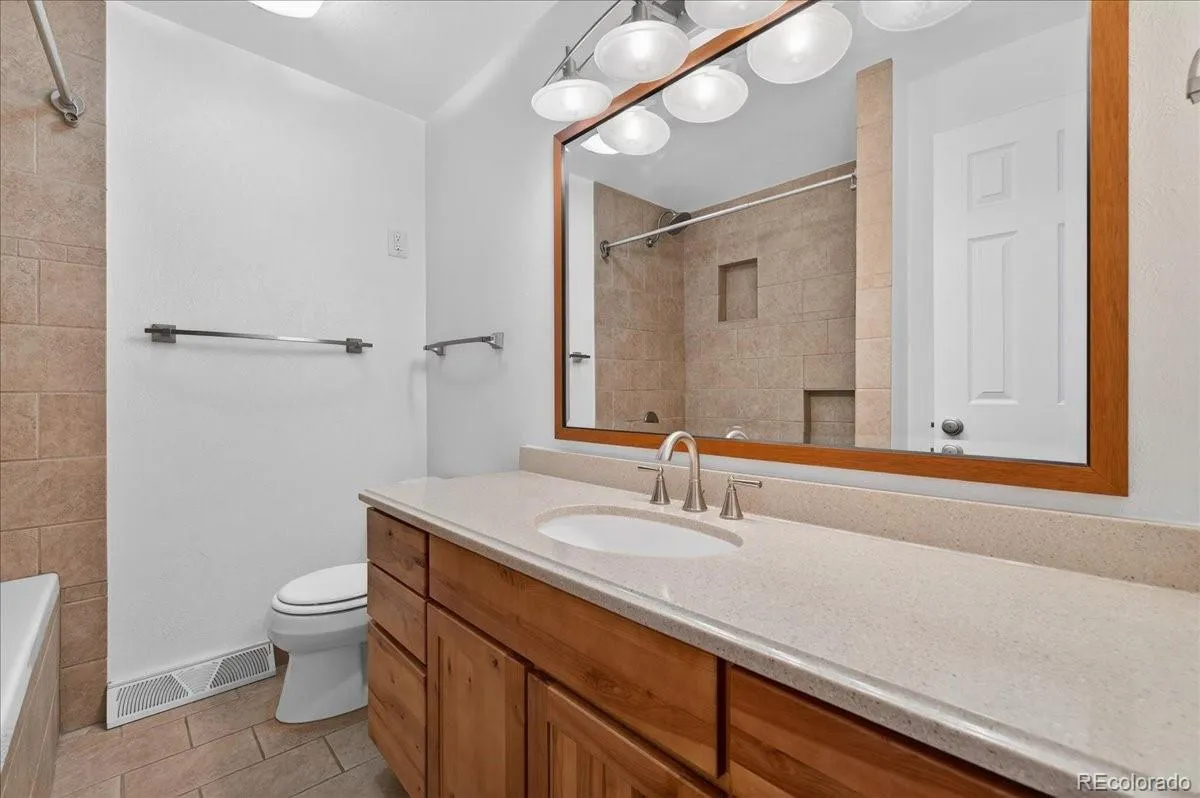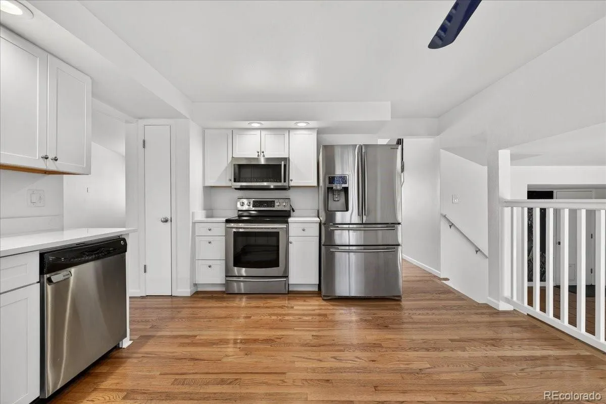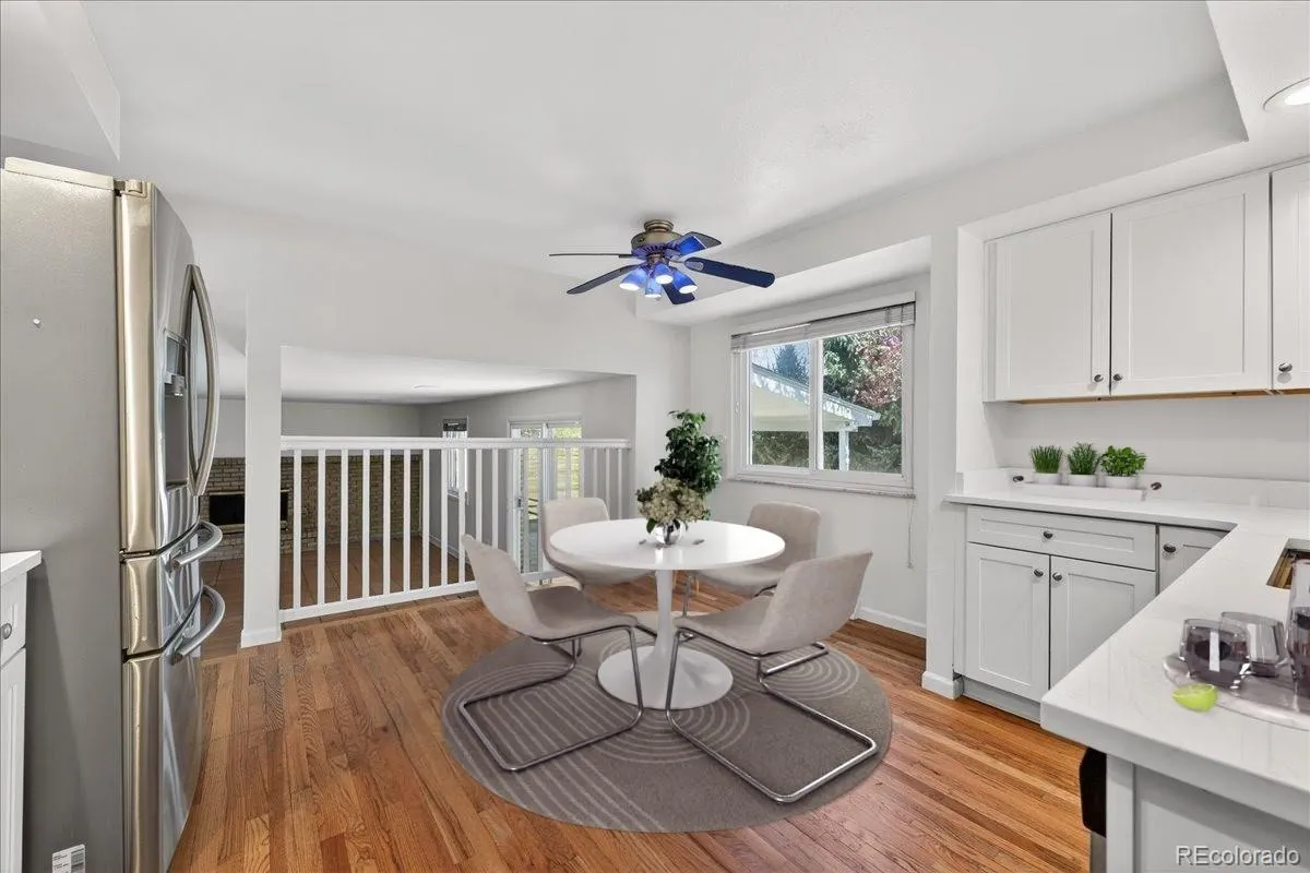 Welcome to this beautifully updated tri-level home in a desirable Centennial location, offering a perfect blend of comfort, functionality, and thoughtful upgrades throughout. From the moment you arrive, the inviting front porch with low-maintenance Trex decking sets the tone for relaxed living. Inside, you’ll find gleaming hardwood floors spanning the living room, dining room, and kitchen, complemented by fresh interior paint and new carpet on the upper level. The bright and stylish kitchen features new white cabinetry, stainless steel appliances, quartz countertops, a pantry, and ample workspace—ideal for both everyday living and entertaining. Upstairs, the oversized primary suite provides a comfortable retreat with a walk-in closet and a private ¾ bath featuring a tiled shower with built-in bench. Two additional bedrooms and a full bath with soaking tub and tile surround complete the upper level. Just a few steps down, the cozy family room offers warm terra cotta tile flooring, a charming wood-burning fireplace with brick surround, and direct access to the backyard through a sliding glass door. This level also includes a convenient half bath/laundry room and access to the attached two-car garage. The finished basement expands your living space with multiple flexible areas—perfect for a media room, home office, craft space with sink, or guest area. Step outside to enjoy the fully fenced backyard with mature trees, lush landscaping, a covered patio for outdoor gatherings, and a large exterior storage room for all your extras. Additional features include radon mitigation for peace of mind. This well-maintained home offers space, updates, and versatility in a fantastic location—ready for you to move in and enjoy!