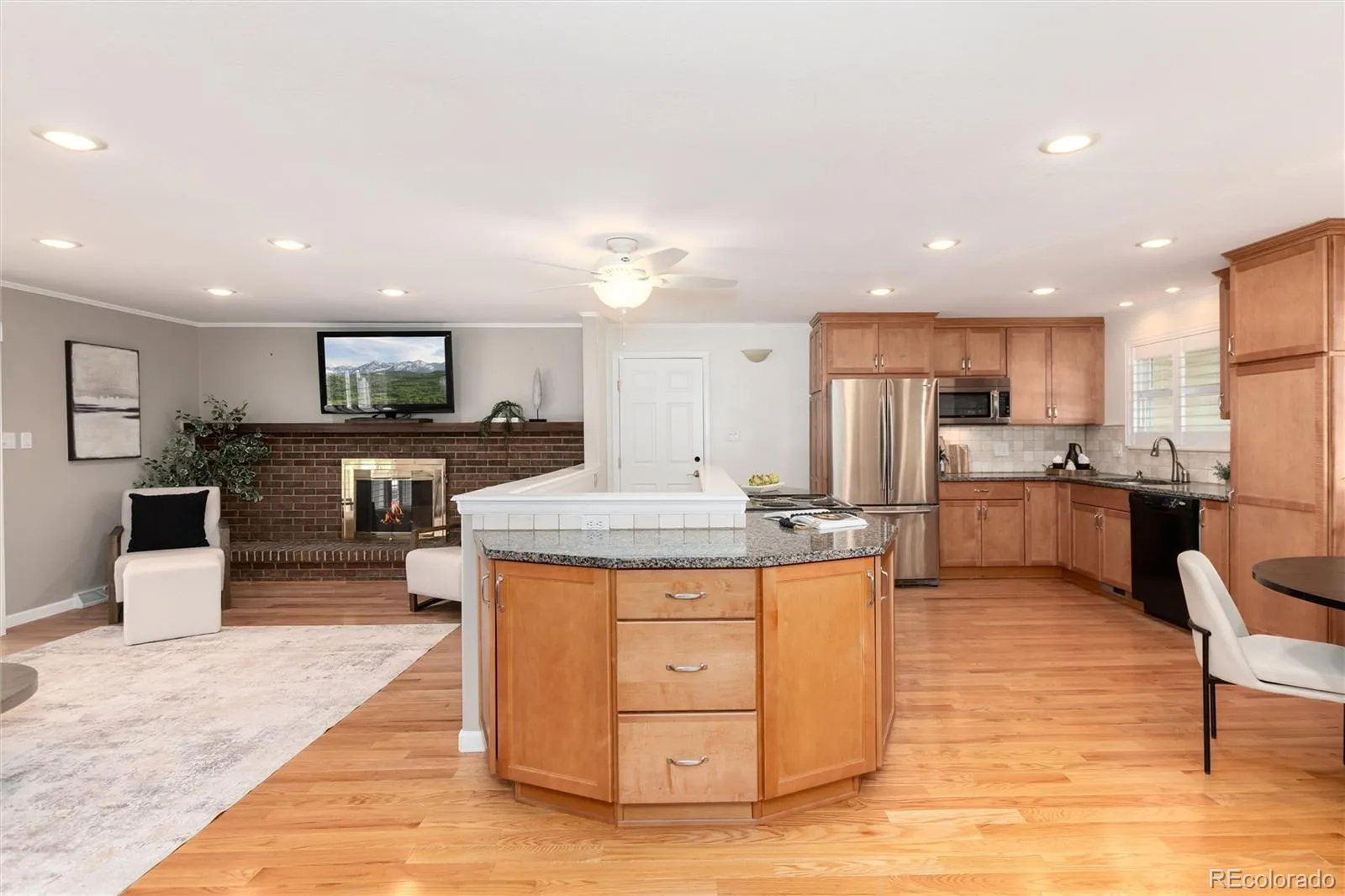 The kitchen blends function and finish with Sensa Caledonia granite countertops with built-in SenGuard stain protection, maple shaker-style cabinetry, brushed nickel hardware, and stainless steel appliances, including a Samsung French door refrigerator. It opens to the main living area, where a classic wood-burning fireplace with brick surround creates a natural gathering space, and continues to the covered patio for easy indoor-outdoor living.