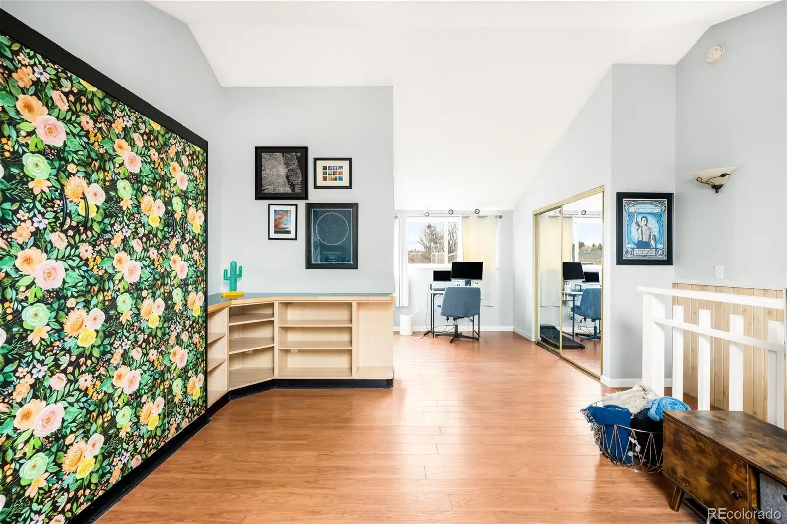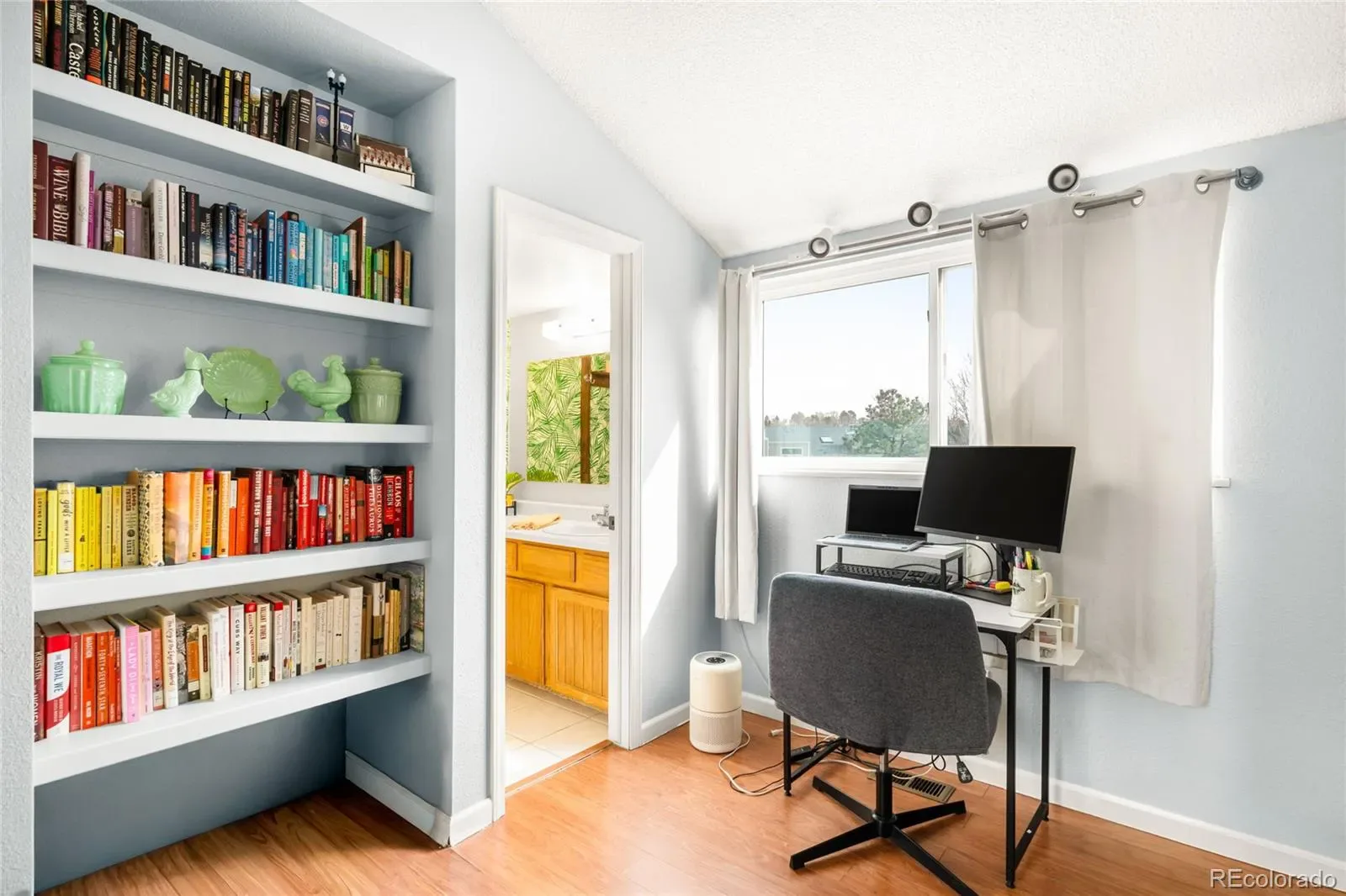 SELLER SHALL OFFER TO PAY FOR THREE MONTHS OF HOA. Vaulted ceilings and radiant natural light define this beautifully updated Indian Creek residence. Set on a desirable corner orientation, this two-story residence showcases stunning wood flooring throughout. The open-concept main level is anchored by a wood-burning fireplace and an airy kitchen illuminated by a skylight. The primary suite is thoughtfully positioned on the main floor, complete with vaulted ceilings, a walk-in closet and a large private balcony for quiet morning retreats. A front-load washer and dryer add everyday convenience. Upstairs, a spacious loft features a Murphy bed with custom wall cabinetry and an updated three-quarter bath, ideal for guests or flexible living. A second balcony offers picturesque views, extending the living space outdoors. Additional storage space is found in a detached one-car garage with windows. Residents enjoy access to a pool and clubhouse just a stone’s throw away, enhancing the ease and appeal of this inviting Indian Creek retreat. Great location with easy access to the DTC, Highline Canal, Cherry Creek bike bath, and the shops and restaurants at Cherry Creek and Lowry.