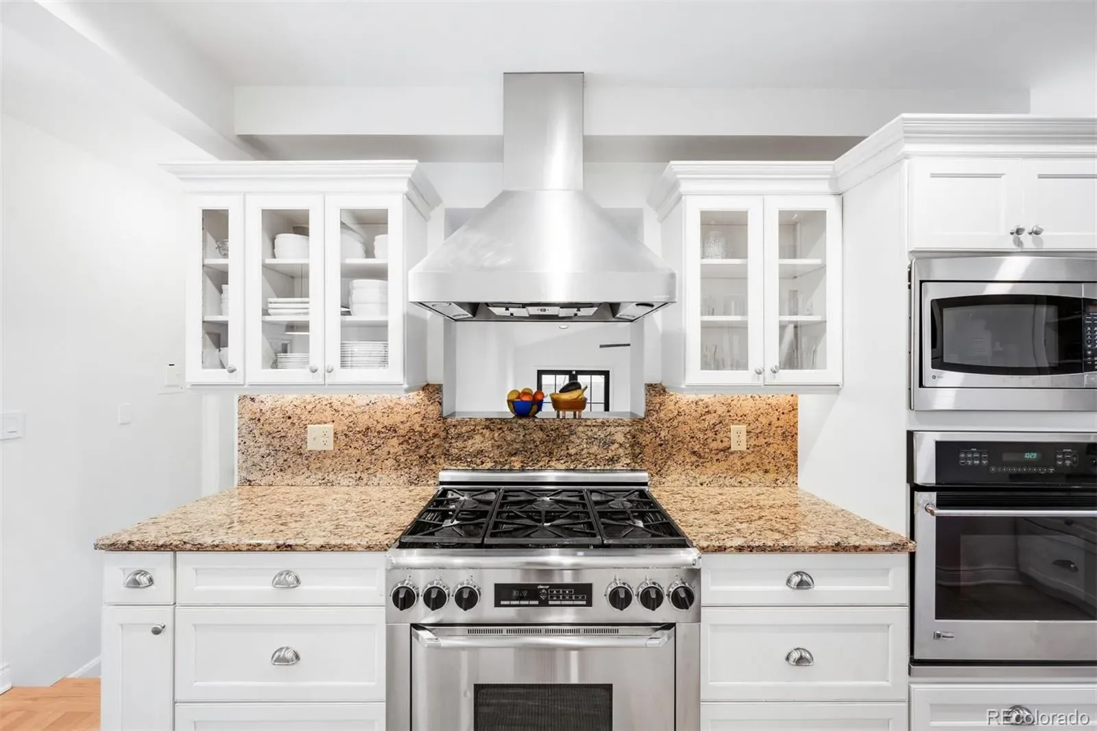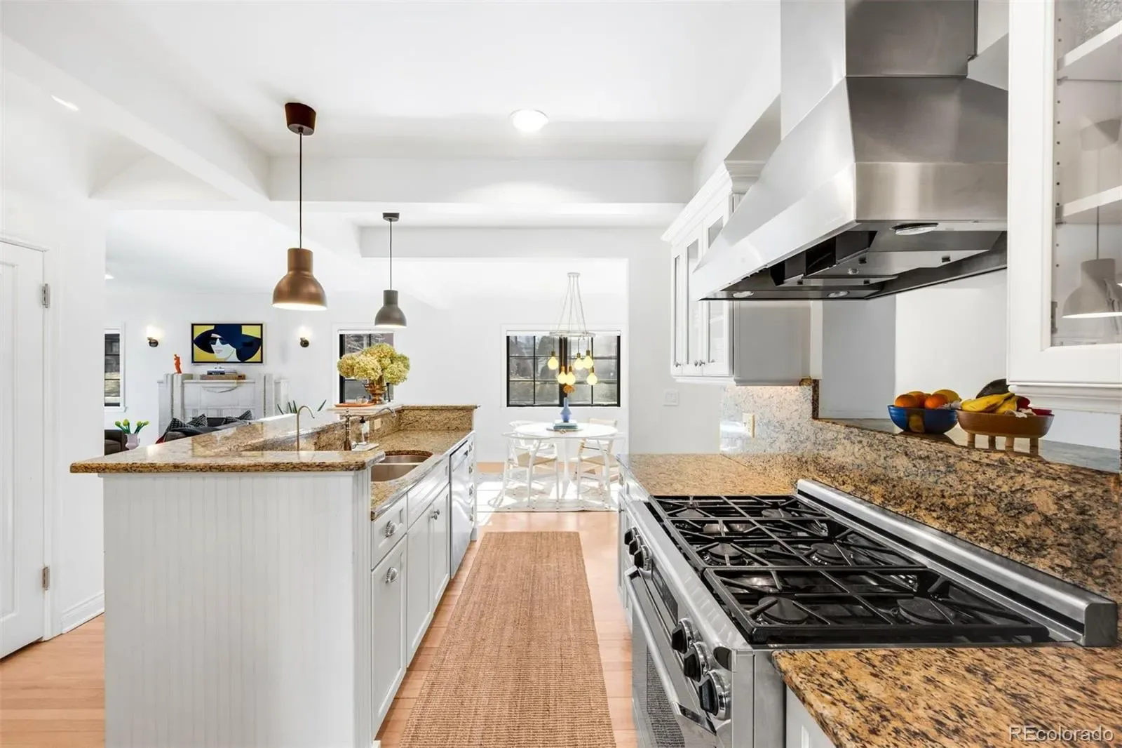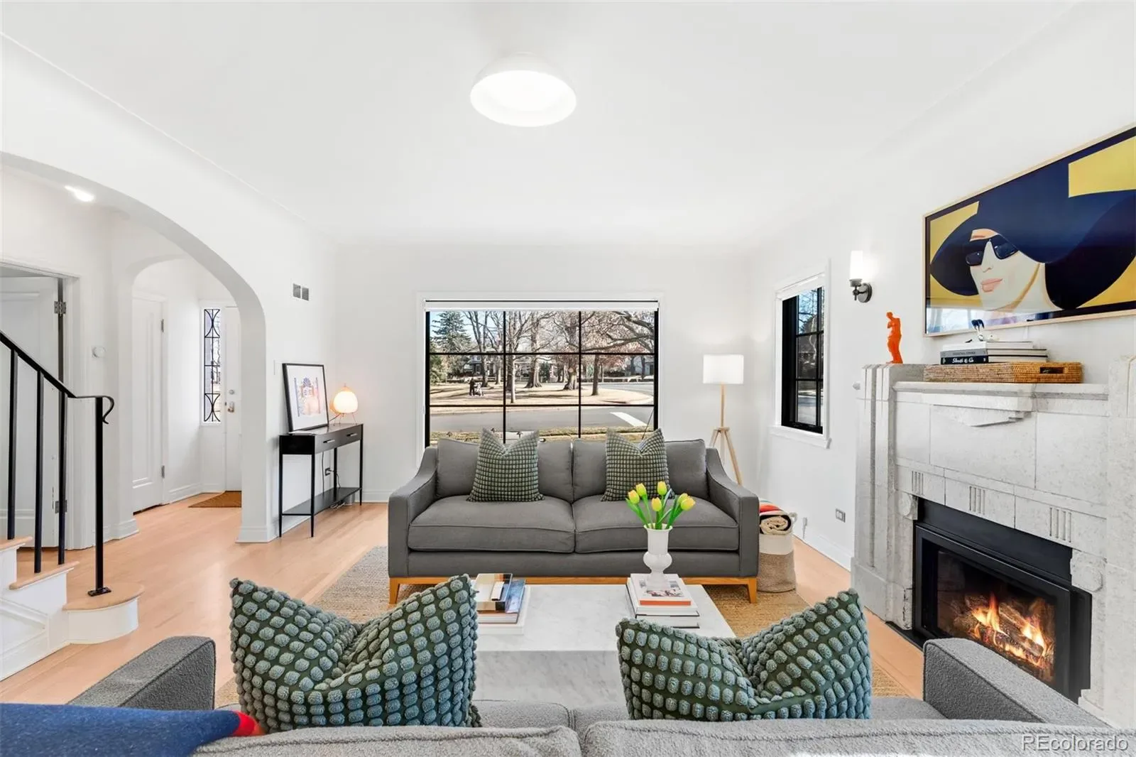 Hardwood floors lead into a sunlit living room anchored by a striking stone Art Deco fireplace. Arched doorways and crown molding add architectural character, while expansive windows frame the park like a living backdrop. The dining room offers an inviting space for gatherings, and the well-appointed galley kitchen features a Dacor gas range, stainless appliances, custom cabinetry, and a built-in desk area for everyday functionality.