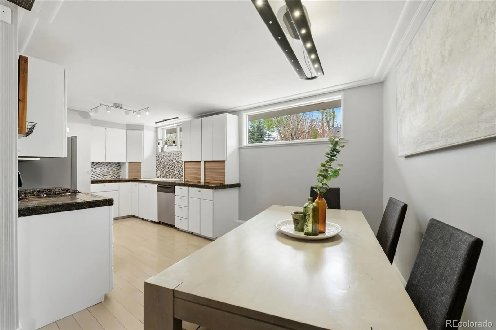 Tucked into a quiet street in one of Bonnie Brae’s most desirable blocks, this modern, light-filled home provides a rare chance to buy into a neighborhood where homes routinely sell well above the million-dollar mark. The contemporary layout showcases expansive windows, clean lines, & thoughtful designer updates throughout, including a fully remodeled main-level bath with designer tile, deep tub, modern fixtures, cabinetry & flooring. The main level showcases white oak wood floors & an updated gas fireplace stretching across the living room while two comfortable bedrooms & an enclosed garage adds true flexibility. Use it for parking or let it live as a second family room, playroom, office, or guest space. Upstairs, the private primary suite occupies its own level with an updated bath, custom closet, & a bright sitting area that functions beautifully as a home office or reading nook with a second gas fireplace, plus a private balcony with peaceful treetop & sunrise views. Outside, the gated yard is intentionally low maintenance yet still lush, with mature trees that provide privacy & seasonal color. A newly finished back patio is ideal for private outdoor dining, grilling, & lounging, while the front yard offers additional green space for pets & play. Recent improvements include plaster-textured walls & paint, updated lighting, a newer stackable washer & dryer, a new back fence, & refreshed exterior details that give the home a polished, move-in-ready feel. All of this sits in the heart of historic Bonnie Brae, known for its winding streets, mature trees, & mix of classic Tudors & modern custom homes. Residents enjoy the walkability of being just minutes from local favorites like Bonnie Brae Ice Cream, Campus Lounge & popular neighborhood shops a&restaurants on Gaylord as well as the walkable Belcaro Loop, Washington Park, and Cherry Creek, making this an unusually accessible opportunity in one of Denver’s most coveted neighborhoods. Bonniebraehm.com for more details