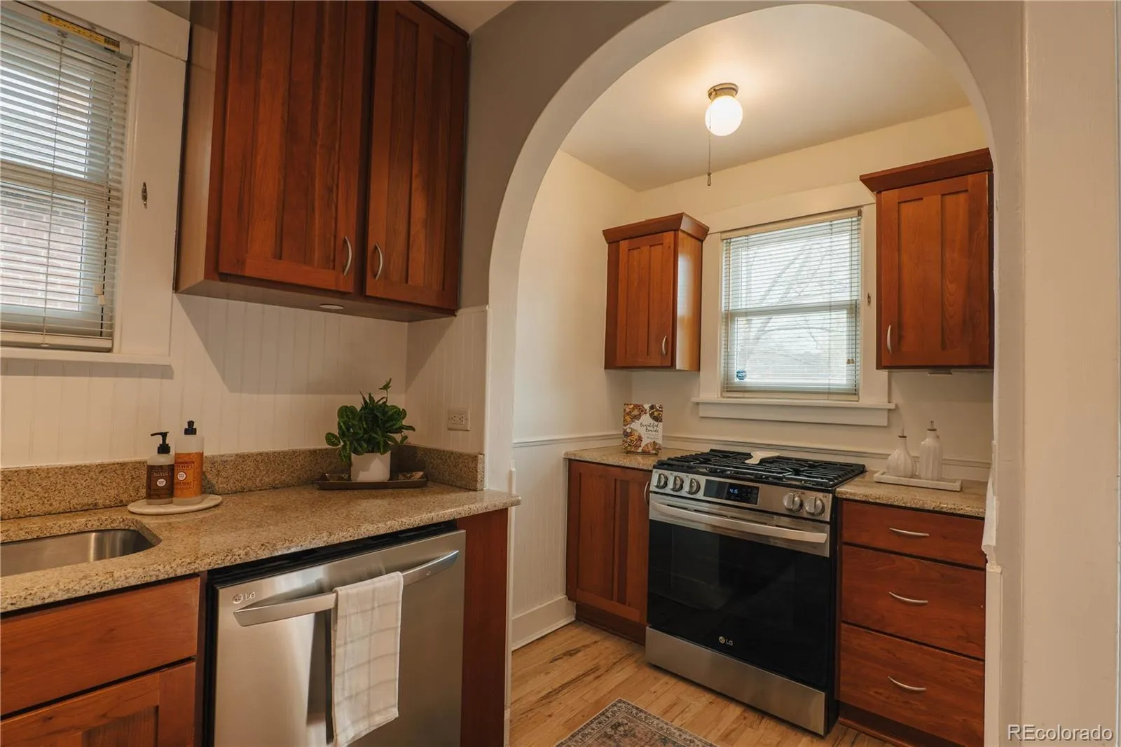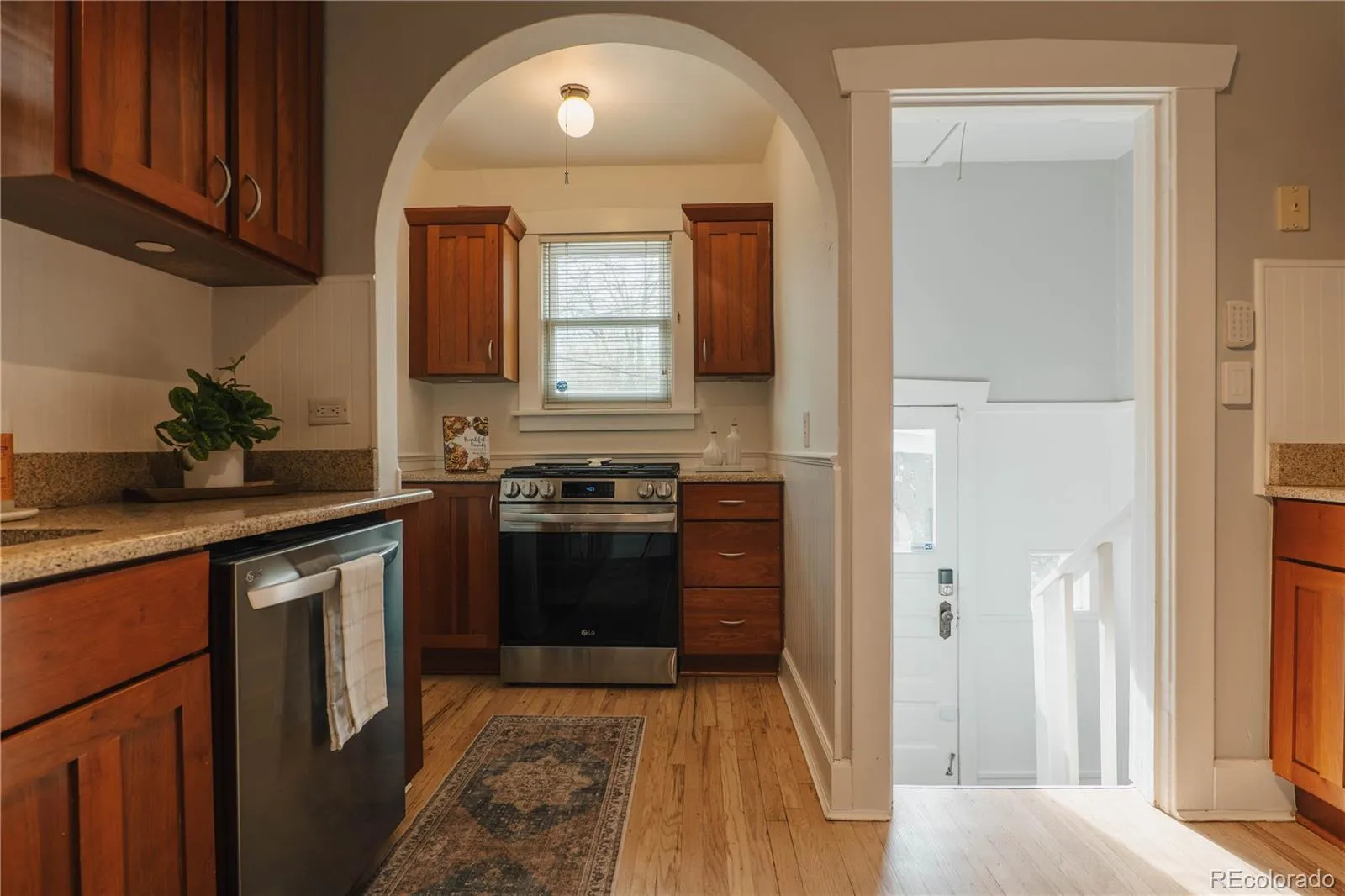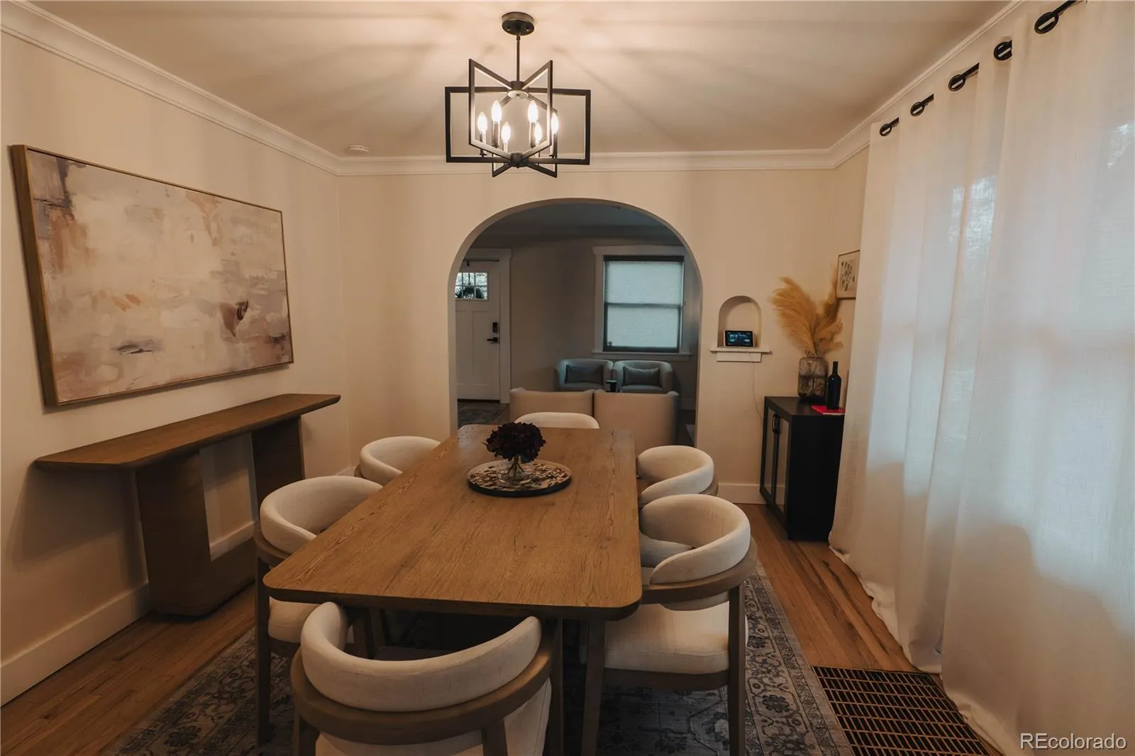 Inside, refinished hardwood floors and a new front door set the tone for a warm, elevated interior. Natural light fills the main floor living room, while charming, original arched walkways create a seamless and functional flow into the dining room and kitchen —perfect for both everyday living and entertaining.