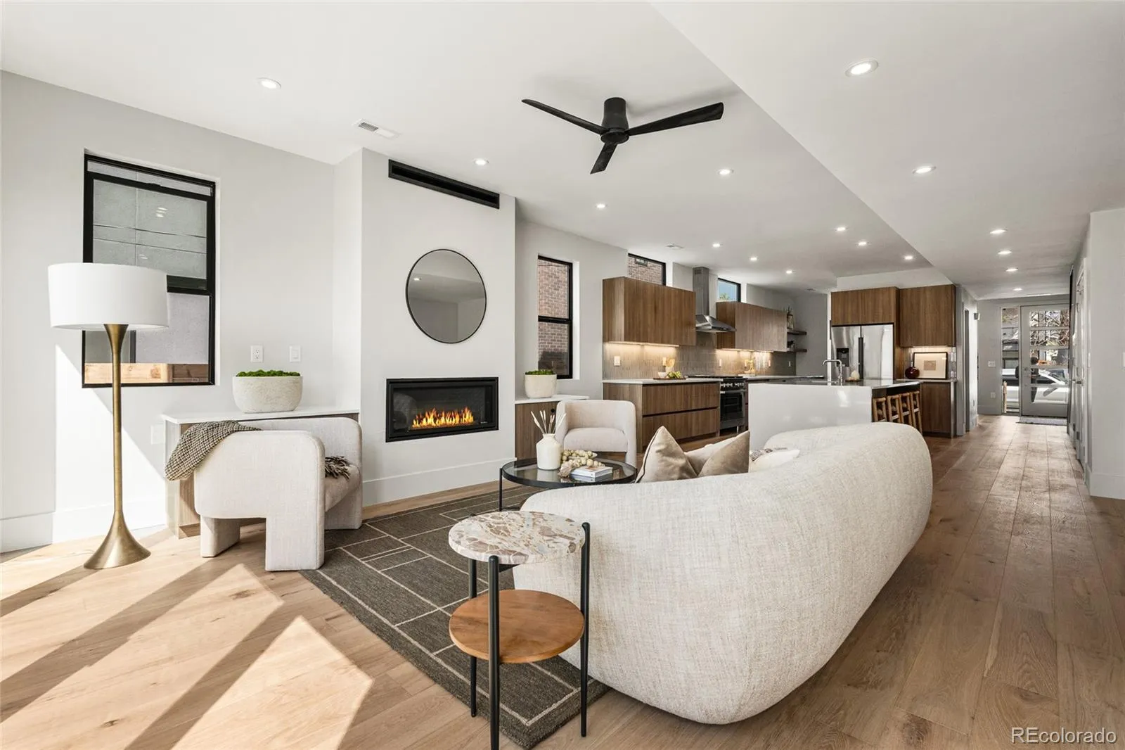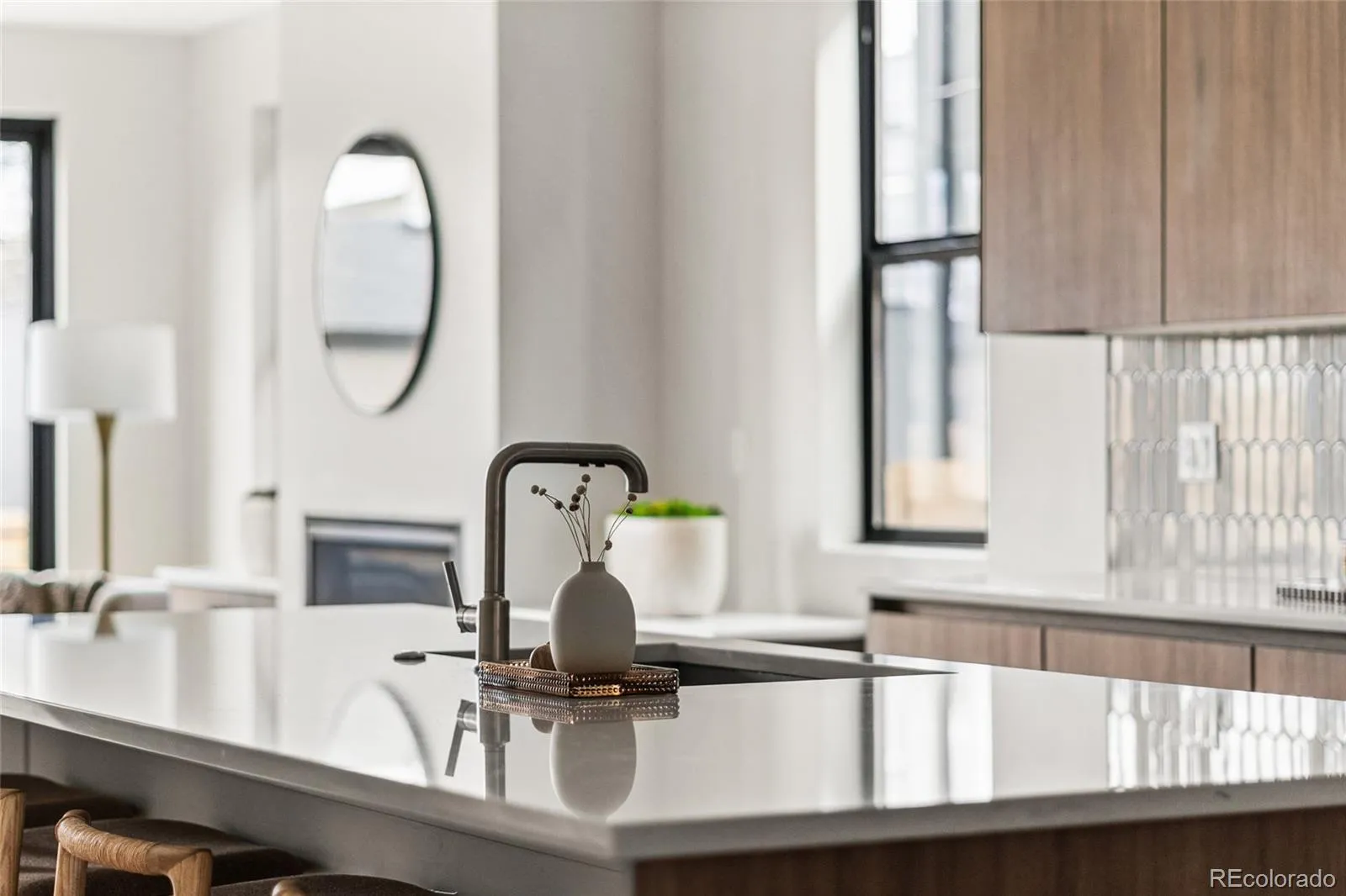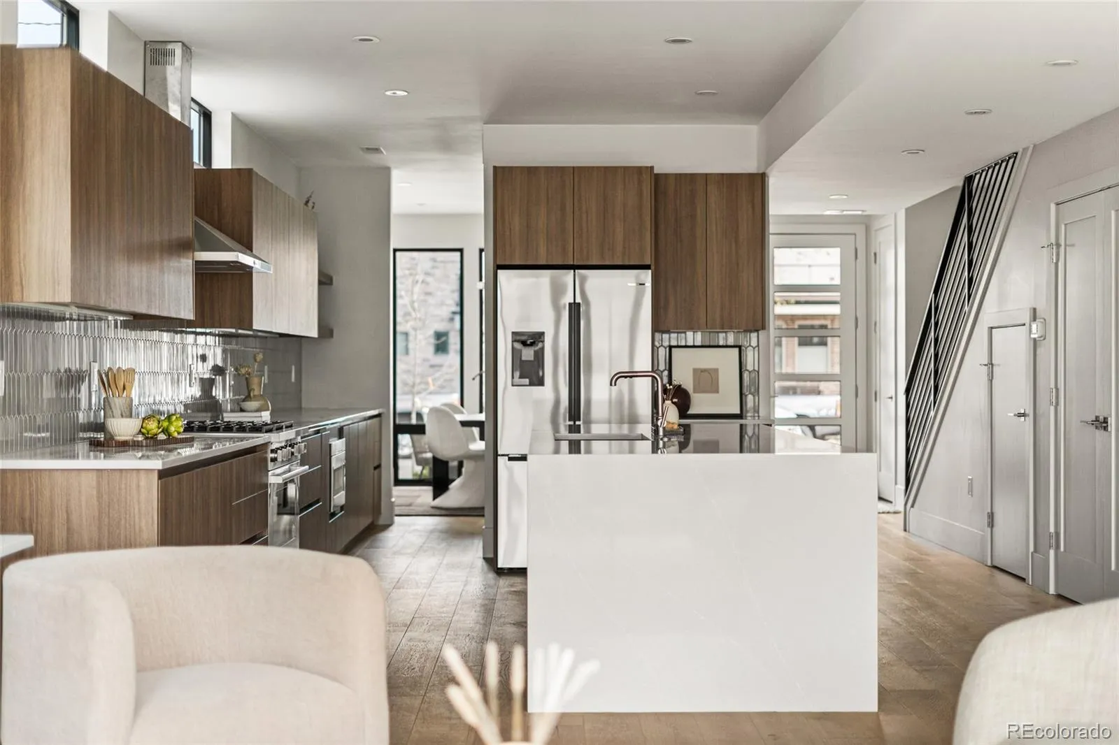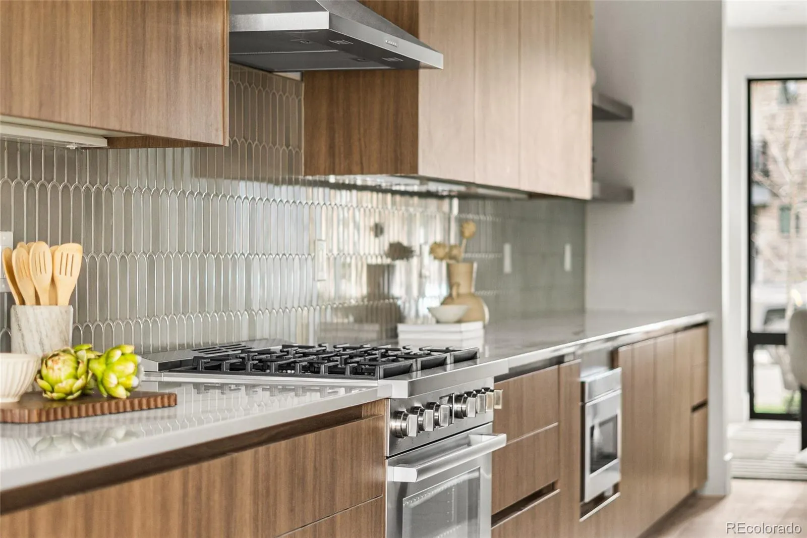 The main level is anchored by floor-to-ceiling windows at both the front and back, bringing in consistent natural light throughout the day. The kitchen is both warm and highly functional, featuring Taj-style quartz that extends to the backsplash, a Bosch appliance package, custom Kabi cabinetry, and abundant drawer storage. A butler’s pantry connects seamlessly to the dining area, while sliding doors off the living room create a true indoor-outdoor flow. Custom built-ins at the fireplace add both storage and architectural detail.