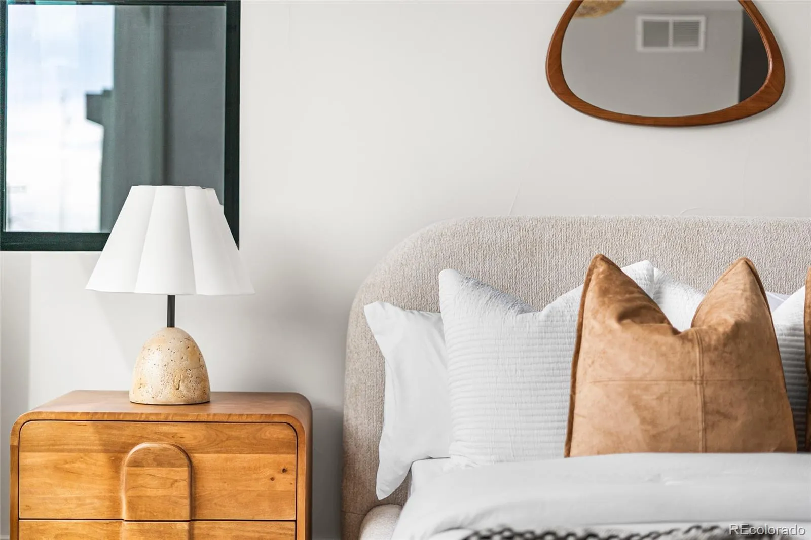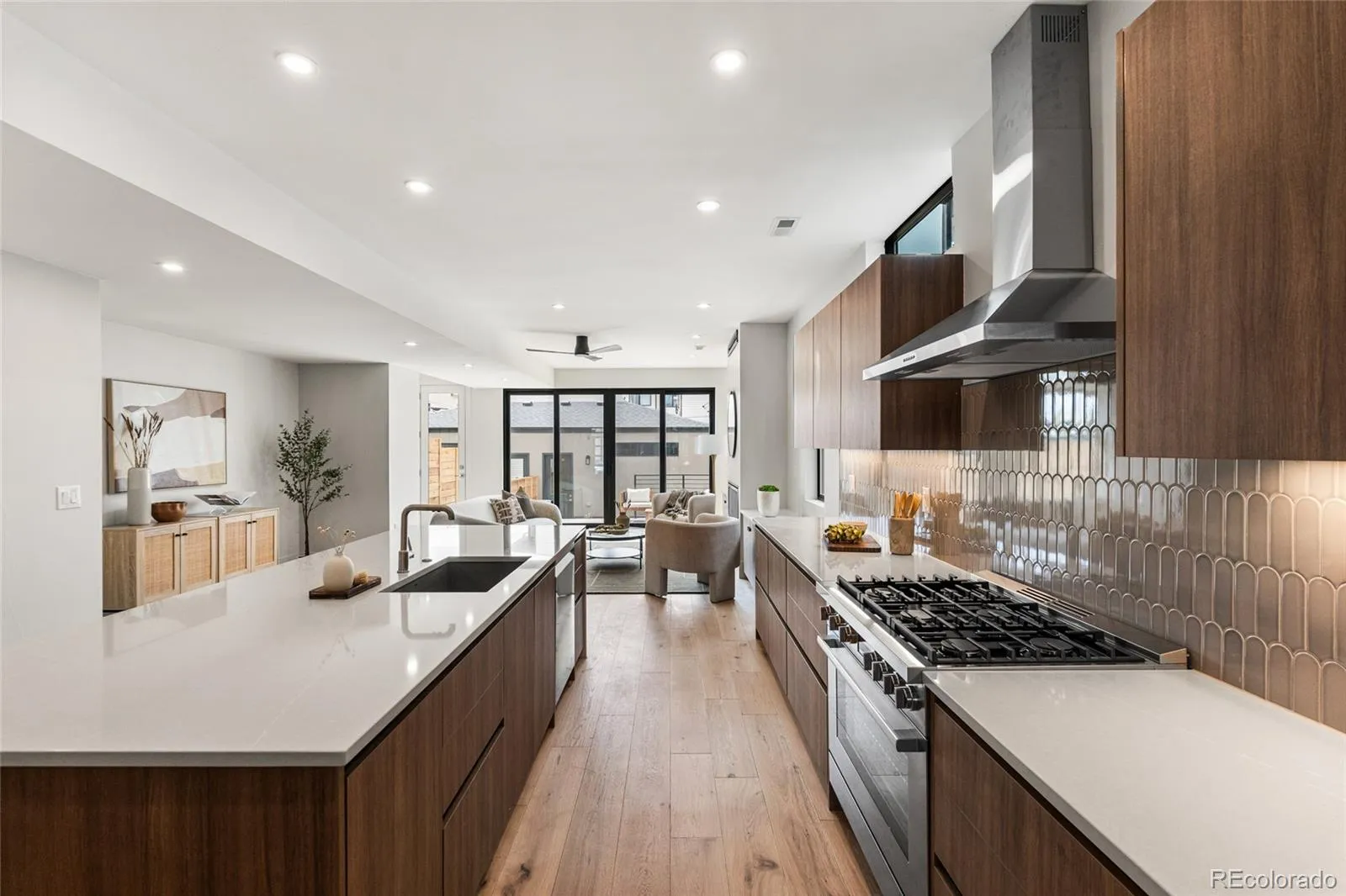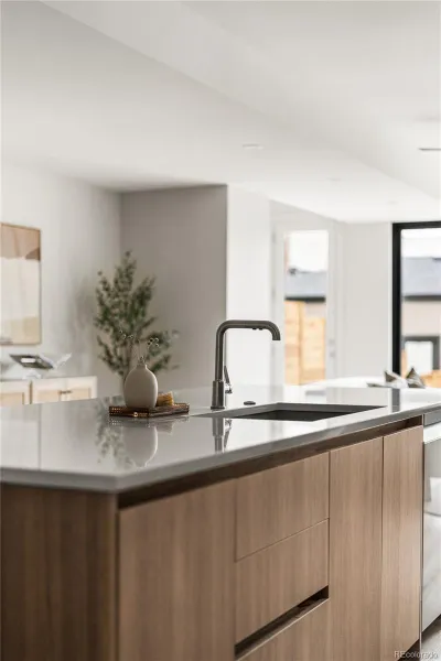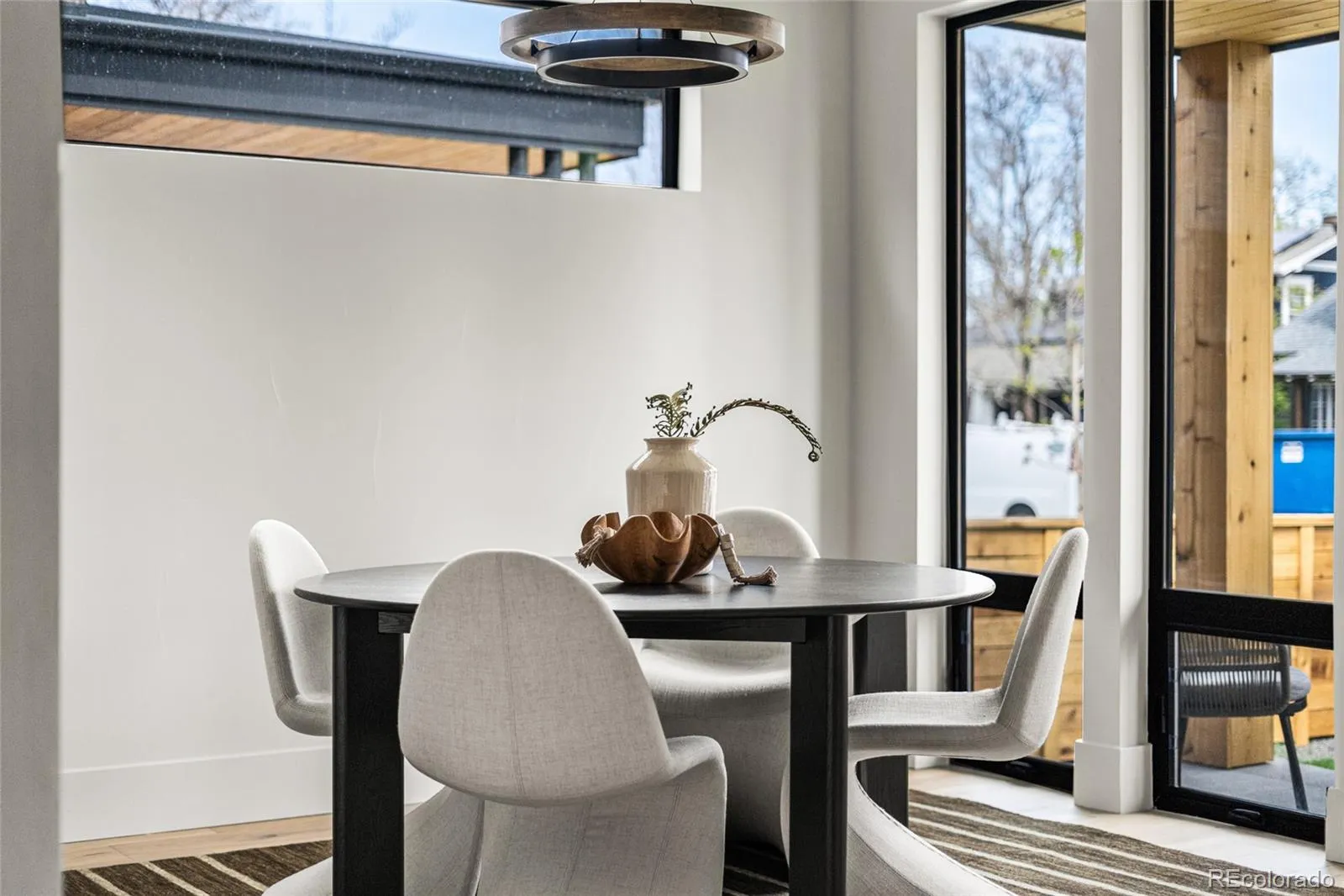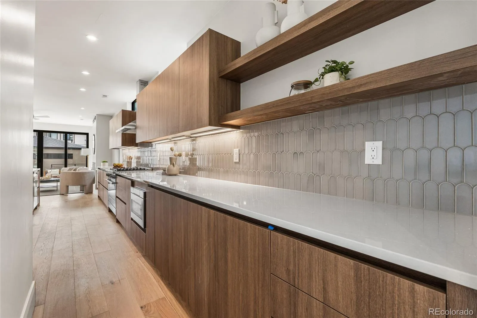 The main level is anchored by floor-to-ceiling windows at both the front and back, bringing in consistent natural light throughout the day. The kitchen is both warm and highly functional, featuring Taj-style quartz that extends to the backsplash, a Bosch appliance package, custom Kabi cabinetry, and abundant drawer storage. A butler’s pantry connects seamlessly to the dining area, while sliding doors off the living room create a true indoor-outdoor flow. Custom built-ins at the fireplace add both storage and architectural detail.