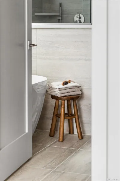 Upstairs, the primary suite includes dual closets, a freestanding tub, glass-enclosed shower, and elevated finishes throughout. Two additional bedrooms, a full bath (including one ensuite), and a walk-in laundry room with built-in cabinetry complete the level.