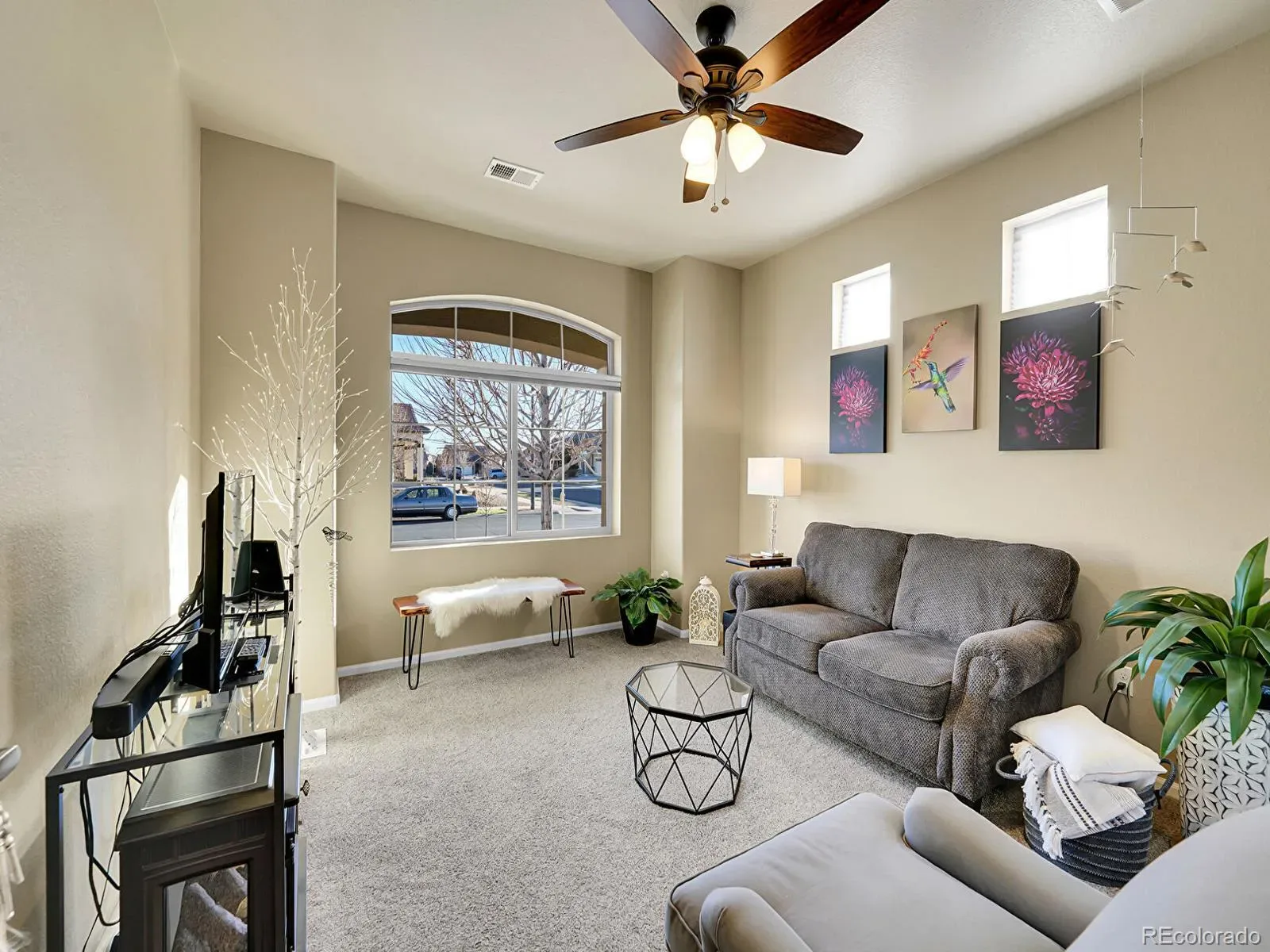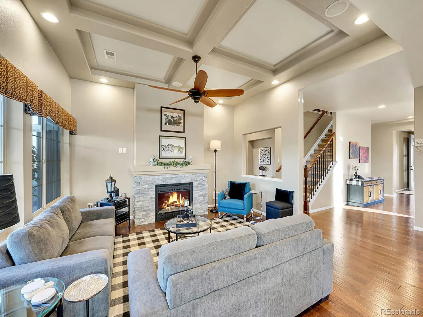 Welcome to 19509 E 55th Ave, a beautifully updated ranch in the desirable Fairway Villas, an active 55+ community in Green Valley Ranch! Positioned on a sunny corner lot with a maintenance-free exterior and xeriscaped landscaping, this home offers low-maintenance living with outstanding upgrades throughout. Inside, over 2,800 finished square feet unfold across a bright, open main level with stunning engineered hardwood floors and thoughtful architectural details. The inviting open living room is anchored by a stacked stone gas fireplace and elegant coffered ceiling, and flows seamlessly into the dining area which connects an oversized kitchen island with a sprawling sunroom to create an entertainer’s paradise. The hallmark of this home’s open floorplan, the gourmet kitchen features granite countertops, upgraded cabinetry, pantry storage, stainless steel appliances, double ovens, and a 5-burner gas cooktop for the most seasoned chef. The primary suite is a relaxing retreat with tray ceilings, a spacious walk-in closet, and a spa-inspired bath with dual sinks and a large walk-in glass shower with bench seating. A second main-level bedroom and full bath with soaking tub are perfect for guests, while a spacious foyer and outstanding office create character. Convenient main-level laundry room with storage and utility sink, perfect for single-level living. Upstairs, the expansive loft with half-bath provides flexible space for game room or craft room PLUS an additional living space! Enjoy year-round comfort in the glass-enclosed sunroom filled with natural light and peek-a-boo mountain views, or step outside to the tiered patio with a tranquil water feature and fully fenced yard. Attached two-car garage! Residents of Fairway Villas enjoy access to a private clubhouse with a pool, fitness center, library, coffee bar, and more, just minutes from walking trails and Green Valley Ranch Golf Club. Enjoy low-maintenance Colorado living at its finest.
