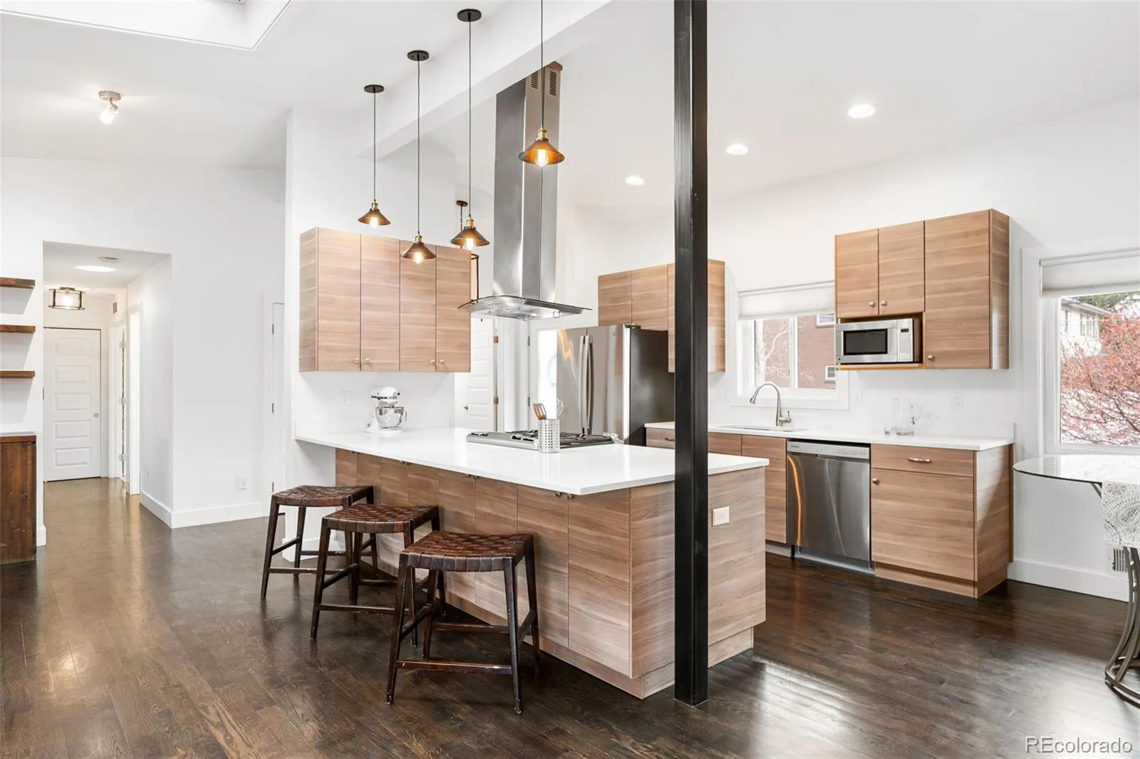 Inside, vaulted ceilings and clerestory windows flood the main living areas with natural light, complementing the refinished hardwood floors and a large living room anchored by a high-end remote-controlled fireplace with built-in shelving and cabinetry. The kitchen impresses with quartz countertops, a large island with bar seating, stainless steel appliances, and a five-burner gas range with a range hood.