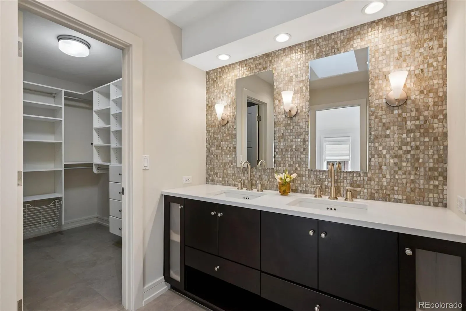 Upstairs, the primary suite offers a tranquil retreat with a five-piece bathroom featuring heated floors and a custom-designed closet. The secondary bedroom lives like a second primary suite with a spacious walk-in closet and an adjoining flex space ideal for a gym, office, or private sitting area. The beautifully appointed secondary bath includes heated floors, double sinks, a private water closet, and a large shower with five jets and a striking stone accent floor. A conveniently located upstairs laundry room includes side-by-side washer and dryer and heated floors.