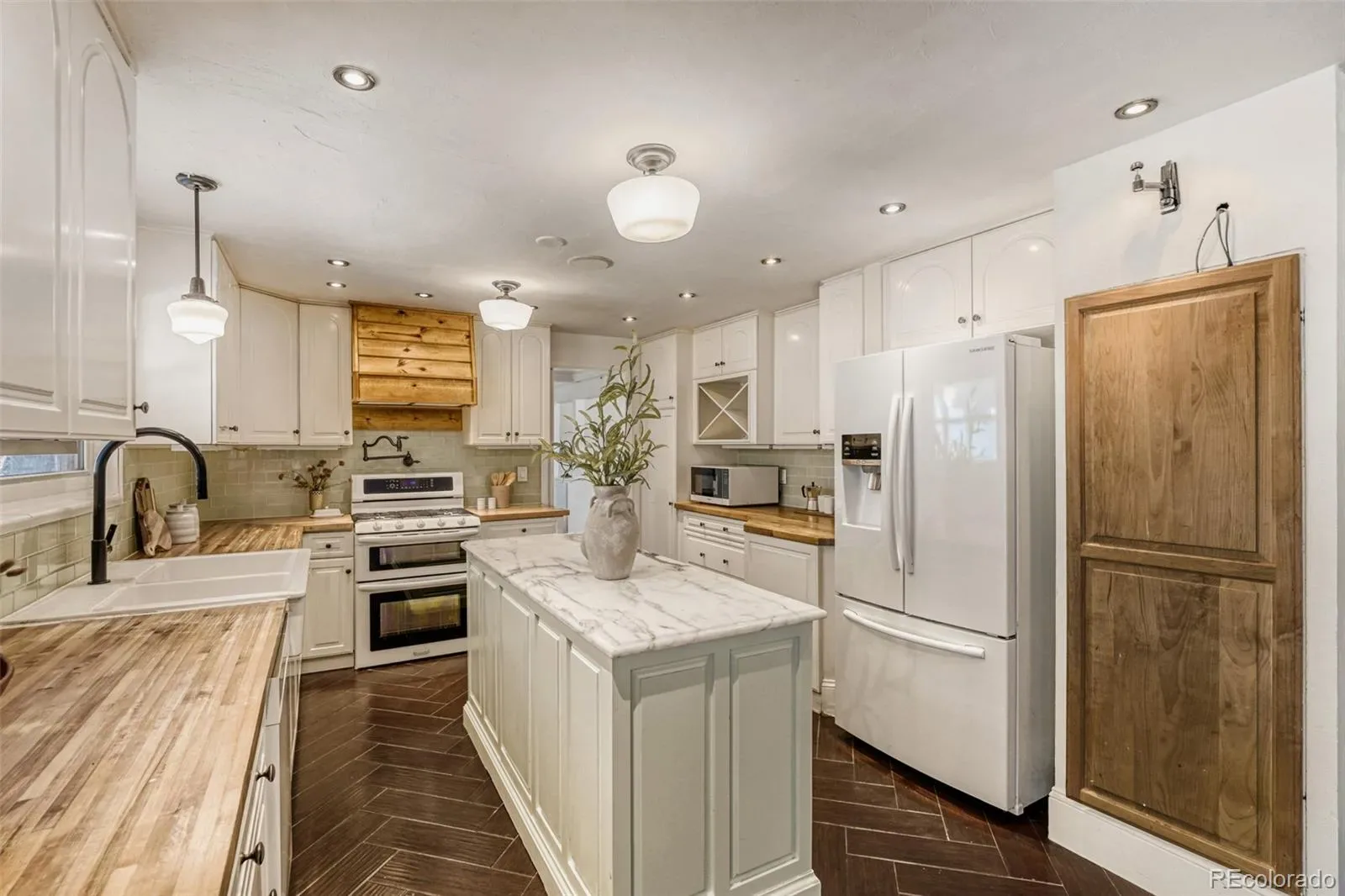 Located in Denver’s Hutchinson Hills neighborhood, this spacious two-story home offers a functional layout and great living space throughout. The main level includes a welcoming entry, living room, and formal dining room with wainscoting and a box beam ceiling. The kitchen features white cabinetry, a glass tile backsplash, farmhouse sink, marble and butcher block counters, and connects easily to both the dining and family rooms.