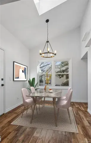 The kitchen includes stainless steel appliances, ample cabinet storage, and a functional flow into the dining area. The primary bedroom offers vaulted ceilings, outdoor access, and an en-suite bath with dual vanities. Two additional bedrooms and a finished basement provide options for a guest space, home office, or recreation.