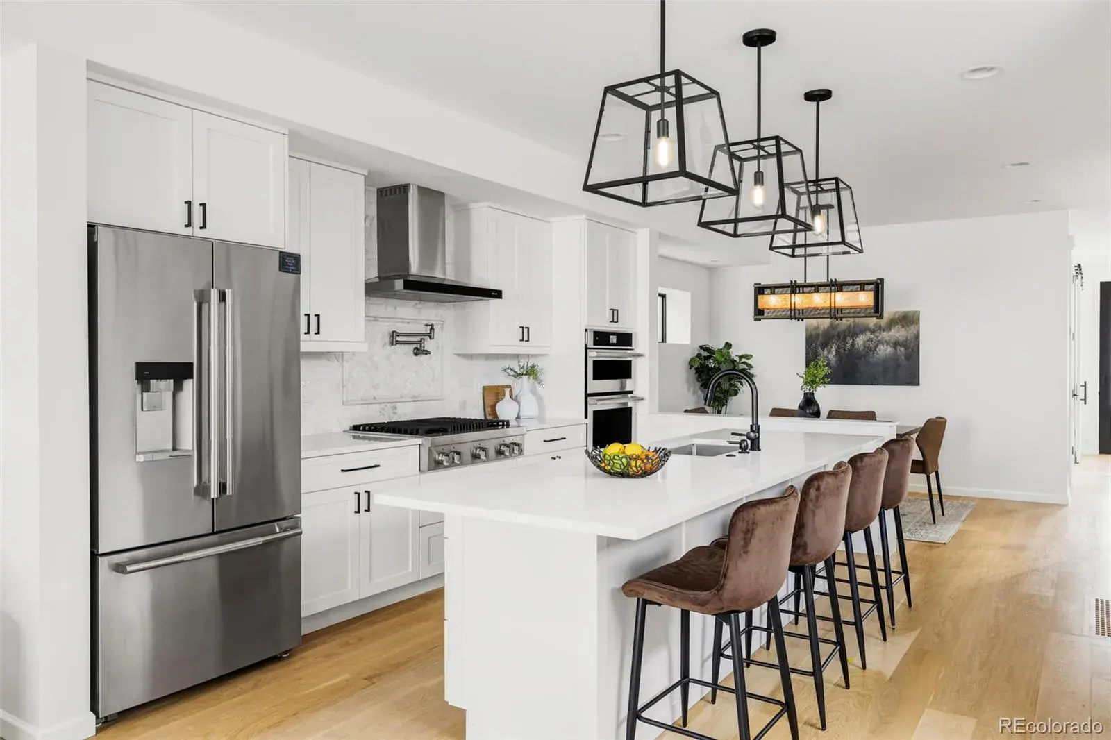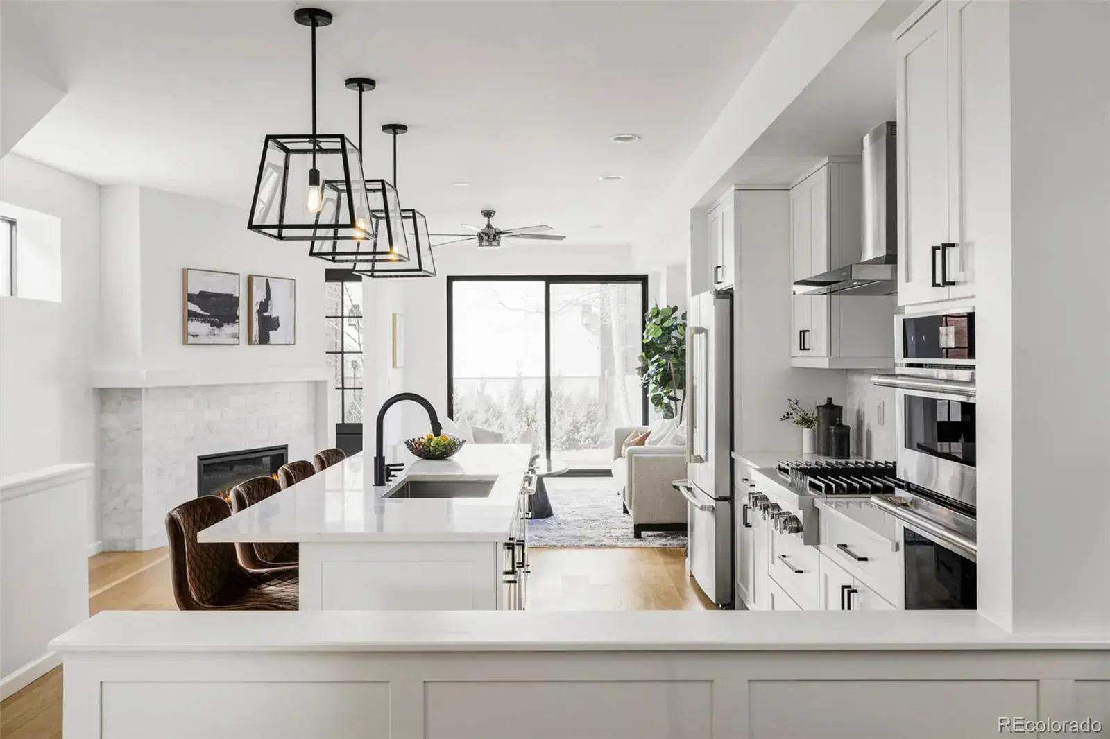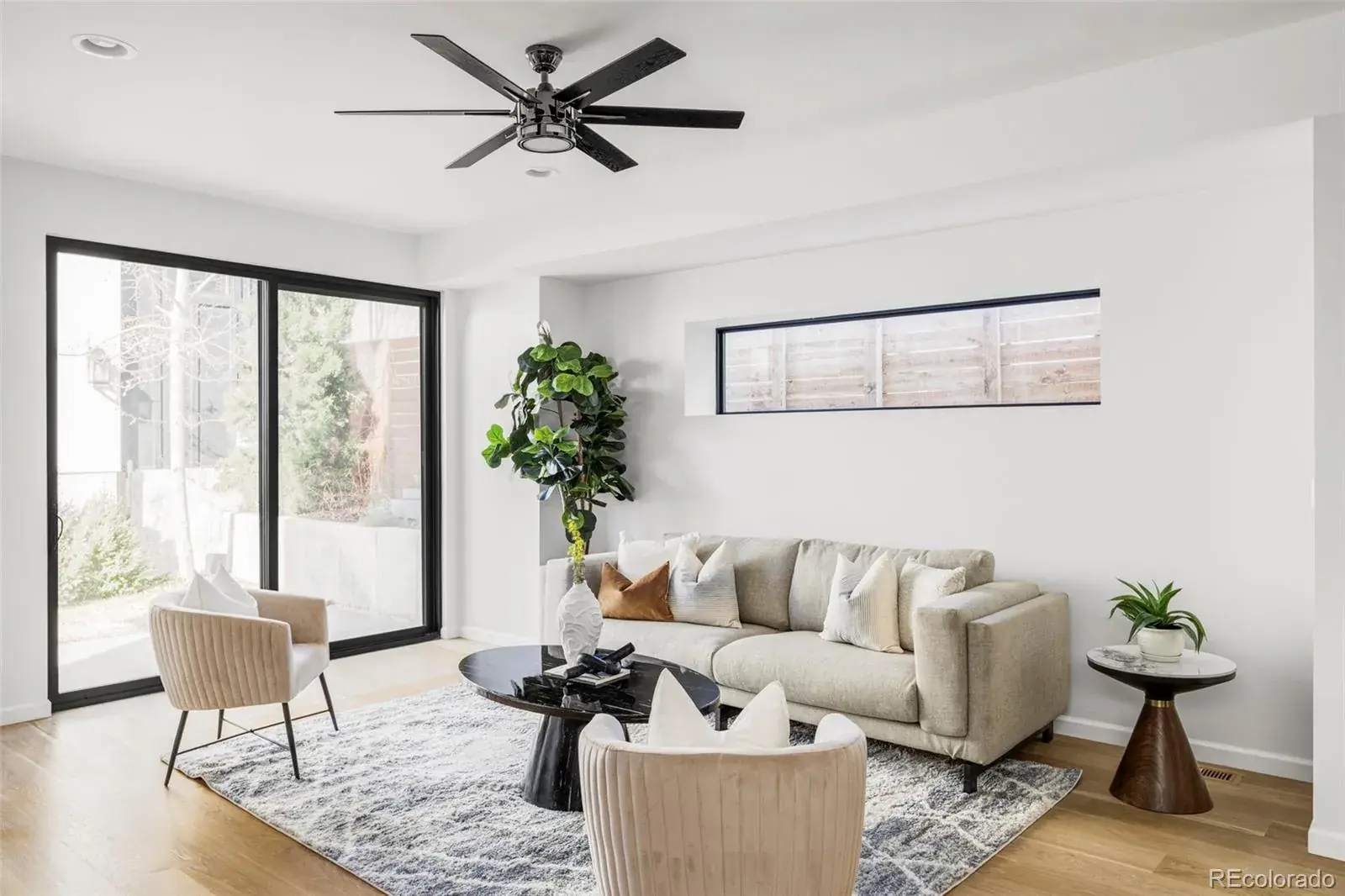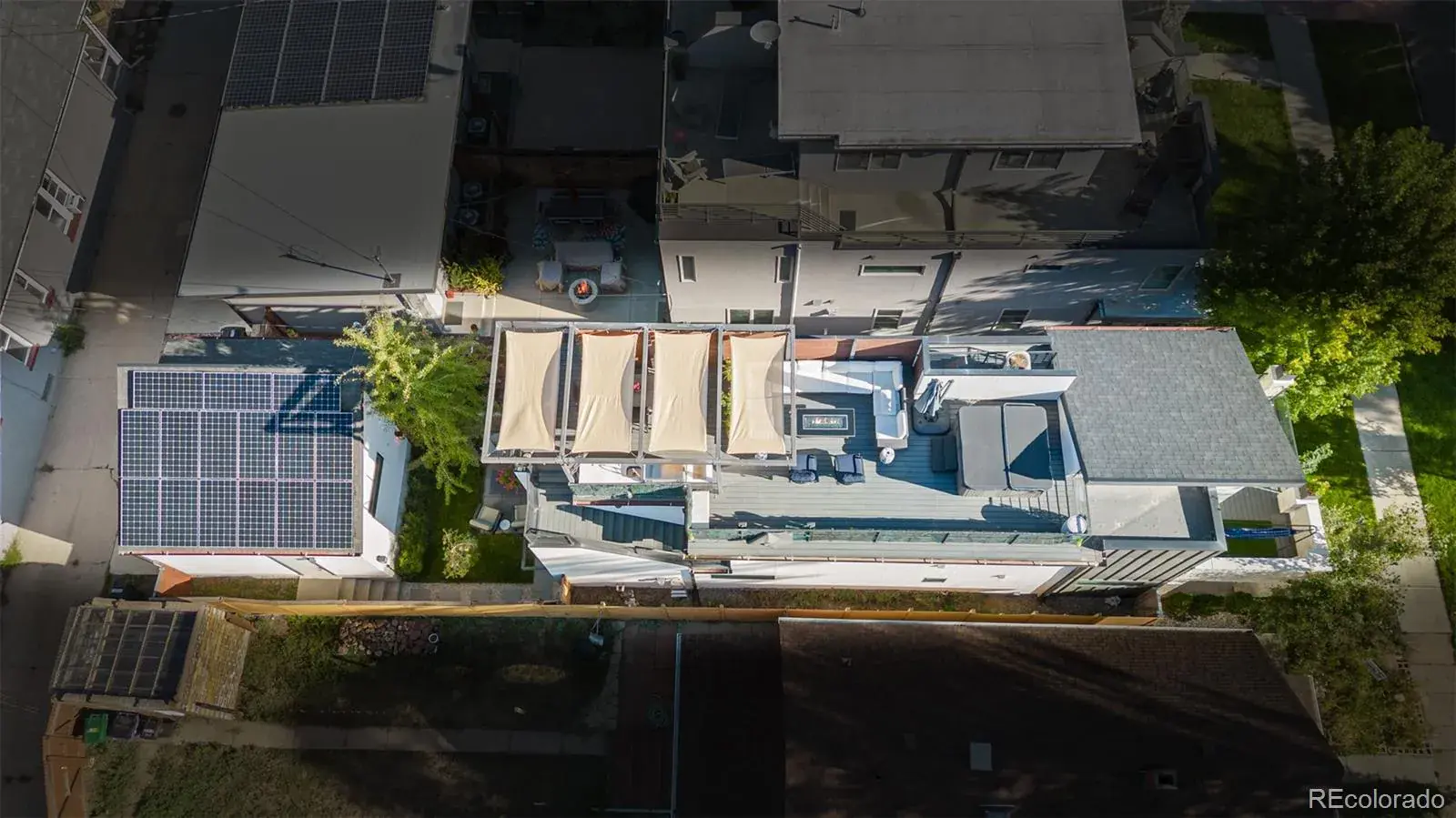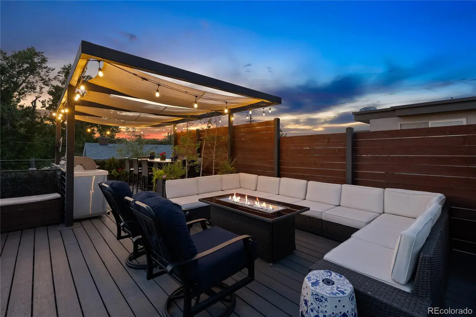 Tucked into one of Denver’s most coveted neighborhoods, this home is a rare retreat that blends privacy, sophistication, and accessibility. Built in 2020, this 5-bedroom, 4-bathroom home spans more than 3,200 square feet of refined living space, offering both tranquility and the vibrancy of LoHi just beyond the front door. The main floor showcases an ideal layout with effortless flow between living, dining, and entertaining spaces. At its center, a chef’s kitchen boasts an oversized quartz island, professional-grade appliances, and designer lighting. The living room, anchored by a sleek gas fireplace, opens through sliding glass doors to a lush backyard with mature trees, water feature, and stone patio — perfect for quiet evenings or lively gatherings. A main-level bedroom or office with full bath provides flexibility. Upstairs, the primary suite is a private sanctuary, complete with vaulted ceilings, a sunlit terrace amongst the trees, and spa-inspired bath featuring dual vanities, soaking tub, and walk-in shower. A boutique-style custom closet elevates the retreat, while two additional bedrooms, a full bath, and laundry complete the upper level. The expansive rooftop deck redefines outdoor entertaining with a kitchenette, 6-burner gas grill, hot tub, and over 800 sq ft of space. Dine under custom shade sails, watch the city lights from the lounge and fire pit, or unwind in the hot tub with sweeping Denver skyline views. The finished basement extends the lifestyle experience with a theater, rec room, full bathroom, and bedroom — currently curated as a fitness space. Detached two-car garage w/ the roof of the garage featuring a 6.2kW solar system that is fully owned and saves drastically on energy costs. Balancing serenity with city living, this Highlands residence is a lush, private oasis just minutes from Denver’s acclaimed dining, shopping, and nightlife.