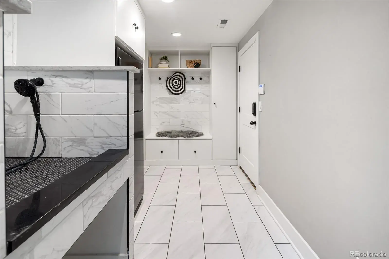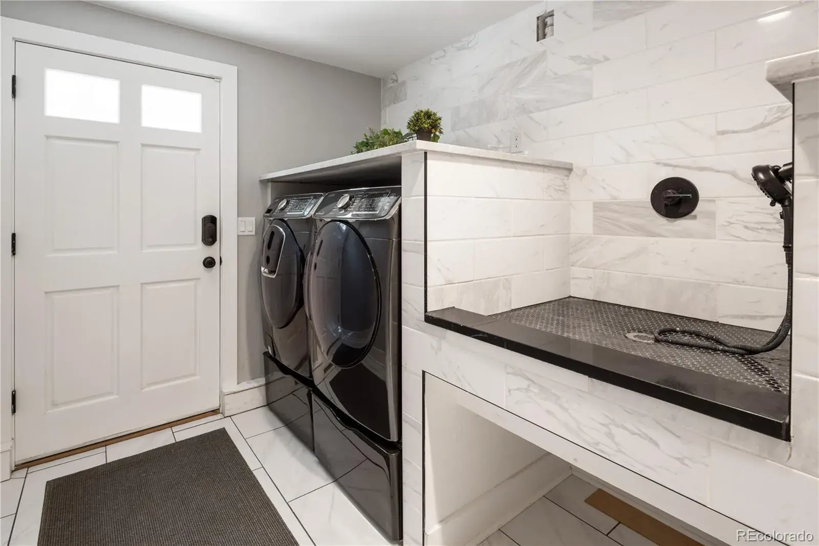 Spacious mudroom with built-in dog wash station and dedicated laundry area