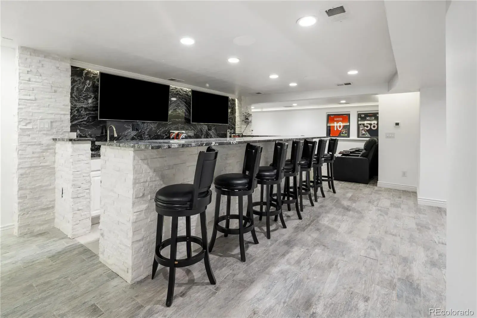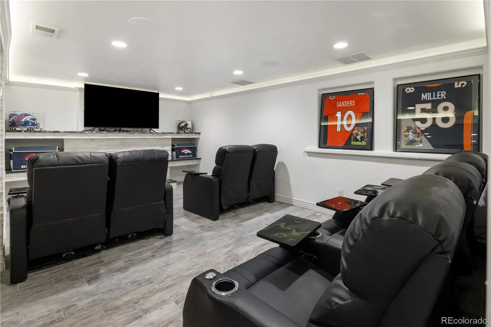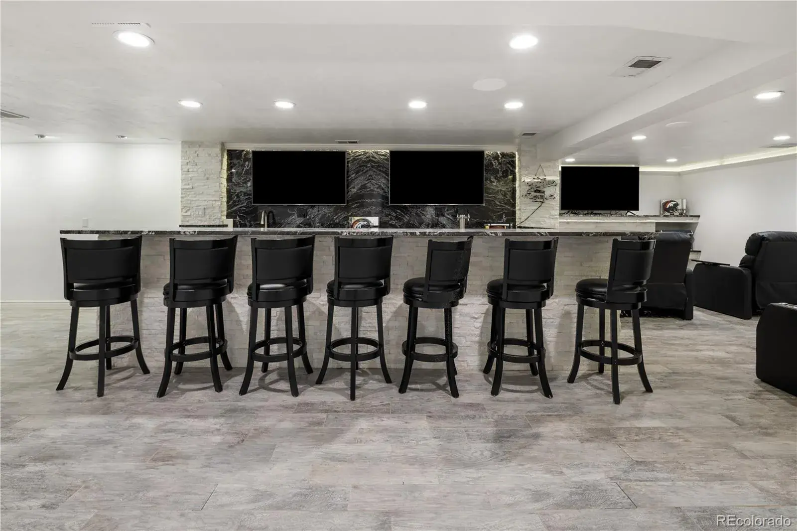 The entertainment-ready basement boasts a full-size wet bar with three 55” mounted TVs, an adjacent home theater area, Large bedroom with en suite bathroom and walk-in closet, laundry closet, and a second kitchen just steps away for serving snacks and drinks without missing the action —perfect for game days or movie nights.