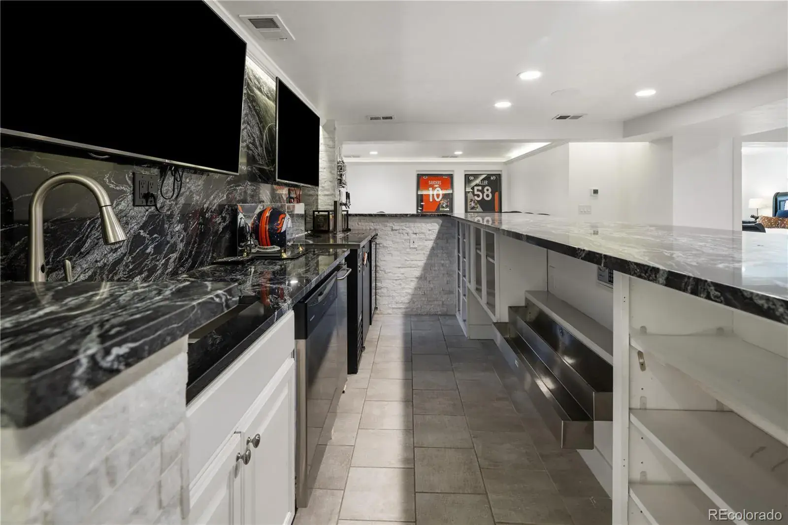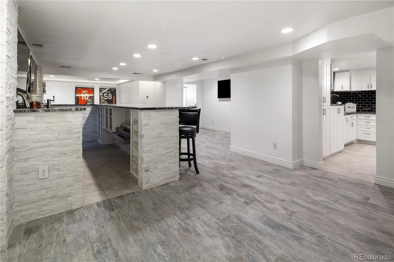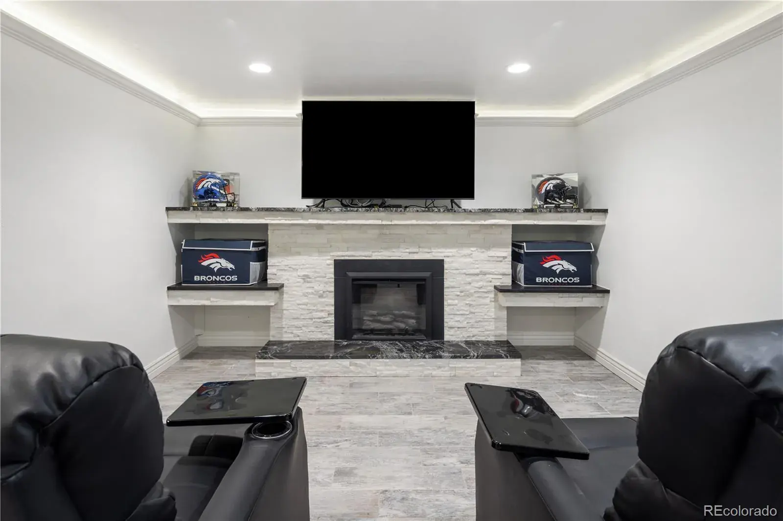 The entertainment-ready basement boasts a full-size wet bar with three 55” mounted TVs, an adjacent home theater area, Large bedroom with en suite bathroom and walk-in closet, laundry closet, and a second kitchen just steps away for serving snacks and drinks without missing the action —perfect for game days or movie nights.