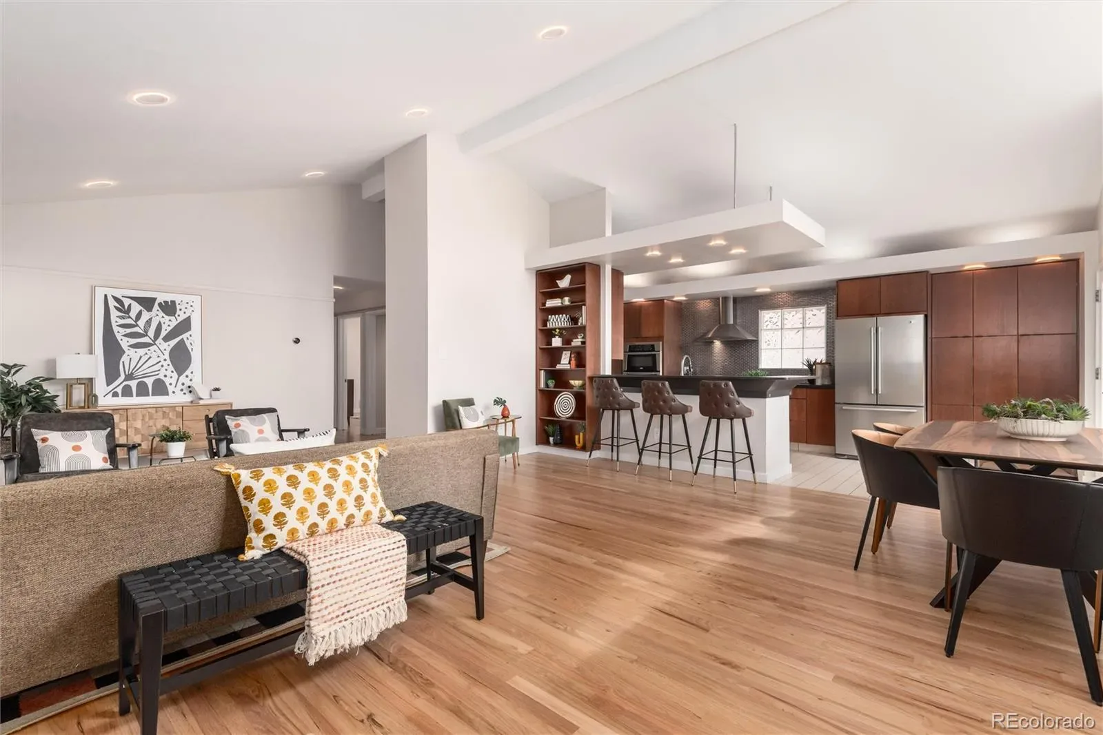 The main living area showcases the home’s mid-century style with expansive windows that fill the space with natural light and highlight the open floor plan. The living room flows seamlessly into the dining area and a modern kitchen featuring vaulted ceilings, stainless steel appliances, and a sleek, contemporary feel—ideal for both everyday living and entertaining.