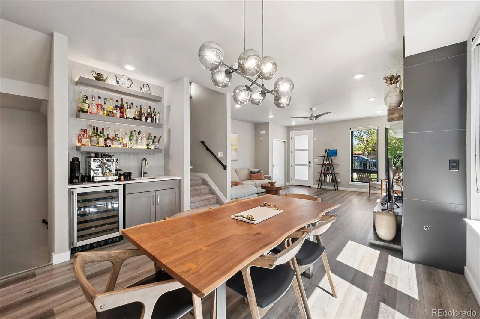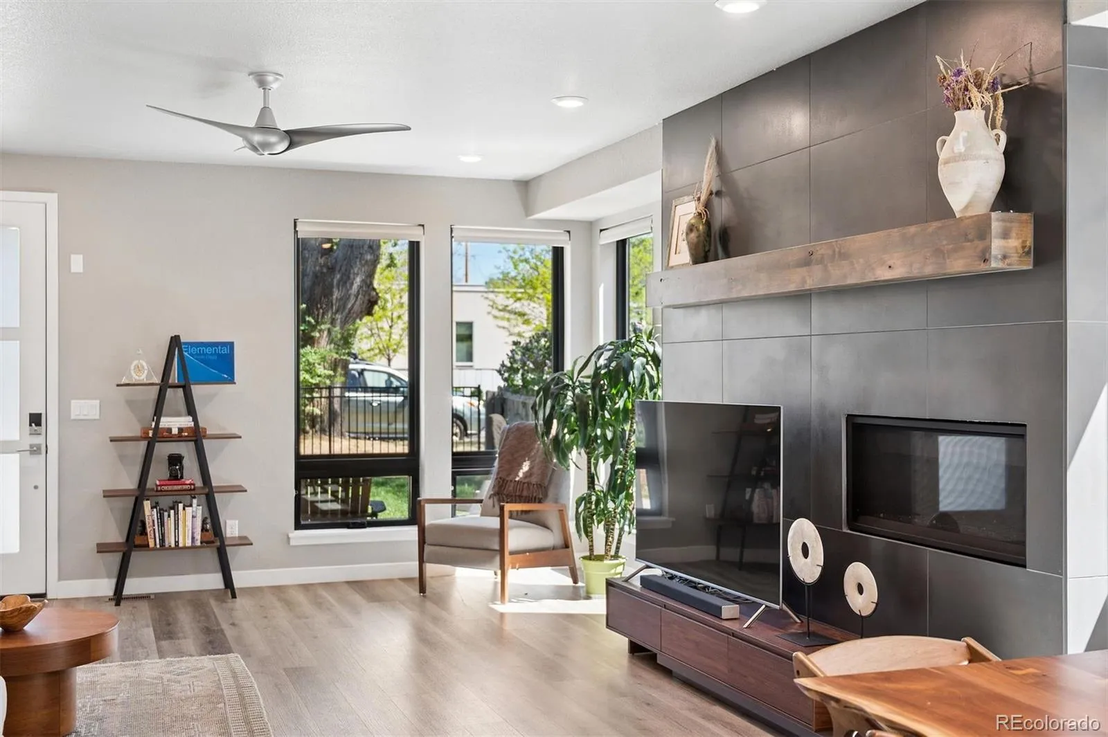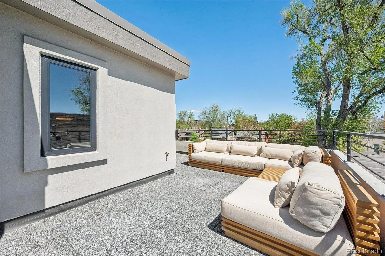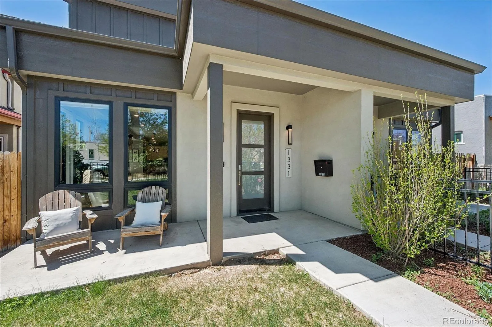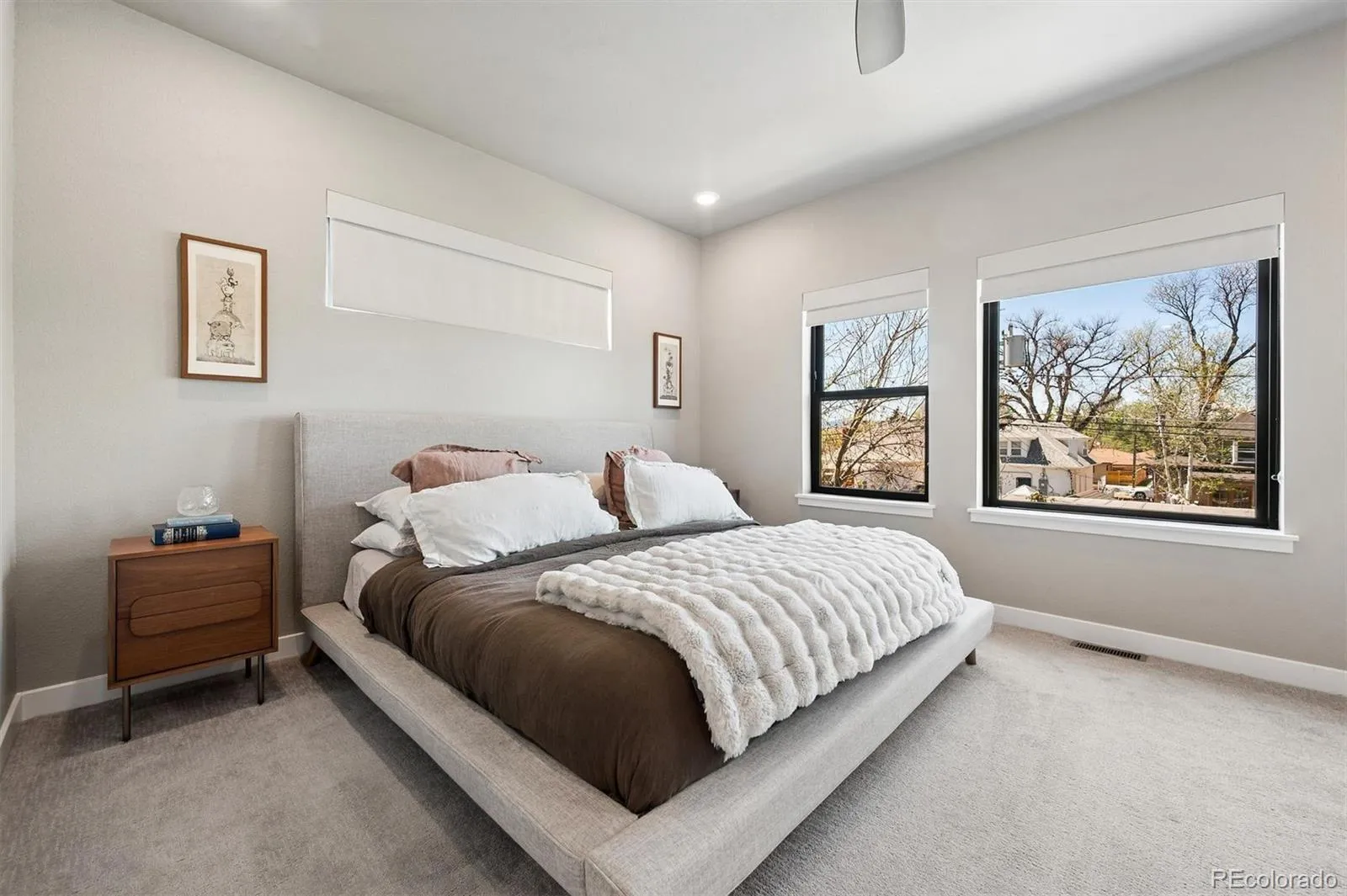 Ideally situated in the heart of Platt Park, one of Denver’s most sought-after neighborhoods, this thoughtfully designed residence blends modern sophistication with effortless, walkable living—just moments from South Pearl Street’s boutiques, dining, and local charm. Built in 2021, the home offers tall ceilings, expansive windows, and seamless indoor-outdoor connection, complete with both front and back yards, a fully fenced setting, and a rooftop deck capturing stunning mountain views. The main level is designed for both everyday living and entertaining, featuring a spacious dining area and a light-filled great room anchored by a gas fireplace with a sleek tile surround and mantle. A custom bar with wine cooler adds an elevated touch, while updated lighting enhances the home’s contemporary aesthetic. At the heart of the home, the kitchen is both functional and refined—appointed with quartz countertops, soft-close white cabinetry, and a full suite of Monogram stainless steel appliances, including a six-burner gas cooktop with hood, built-in oven, microwave, and dishwasher. A large center island and walk-in pantry complete the space, offering both style and convenience. Upstairs, the primary suite serves as a private retreat, featuring a generous walk-in closet, additional wall closets, and a beautifully finished en-suite bath with tile flooring and dual vanities. An additional bedroom with walk-in closet and ceiling fan, along with a full bath, provides comfortable accommodations for family or guests. The finished basement expands the home’s versatility with a spacious recreation room, wet bar with beverage fridge, custom shelving, and a third bedroom with adjacent three-quarter bath—ideal for guests or extended living. Additional highlights include LVP flooring, plush carpeting, a mudroom with built-in cubbies, dedicated laundry room, and a detached two-car garage.