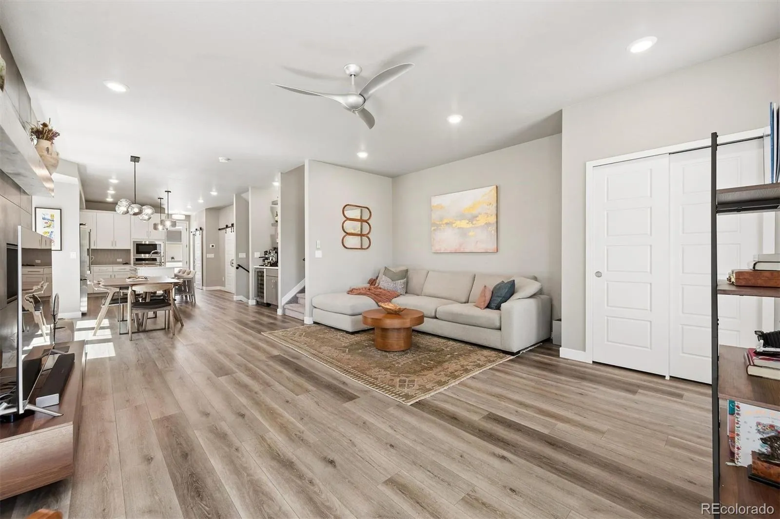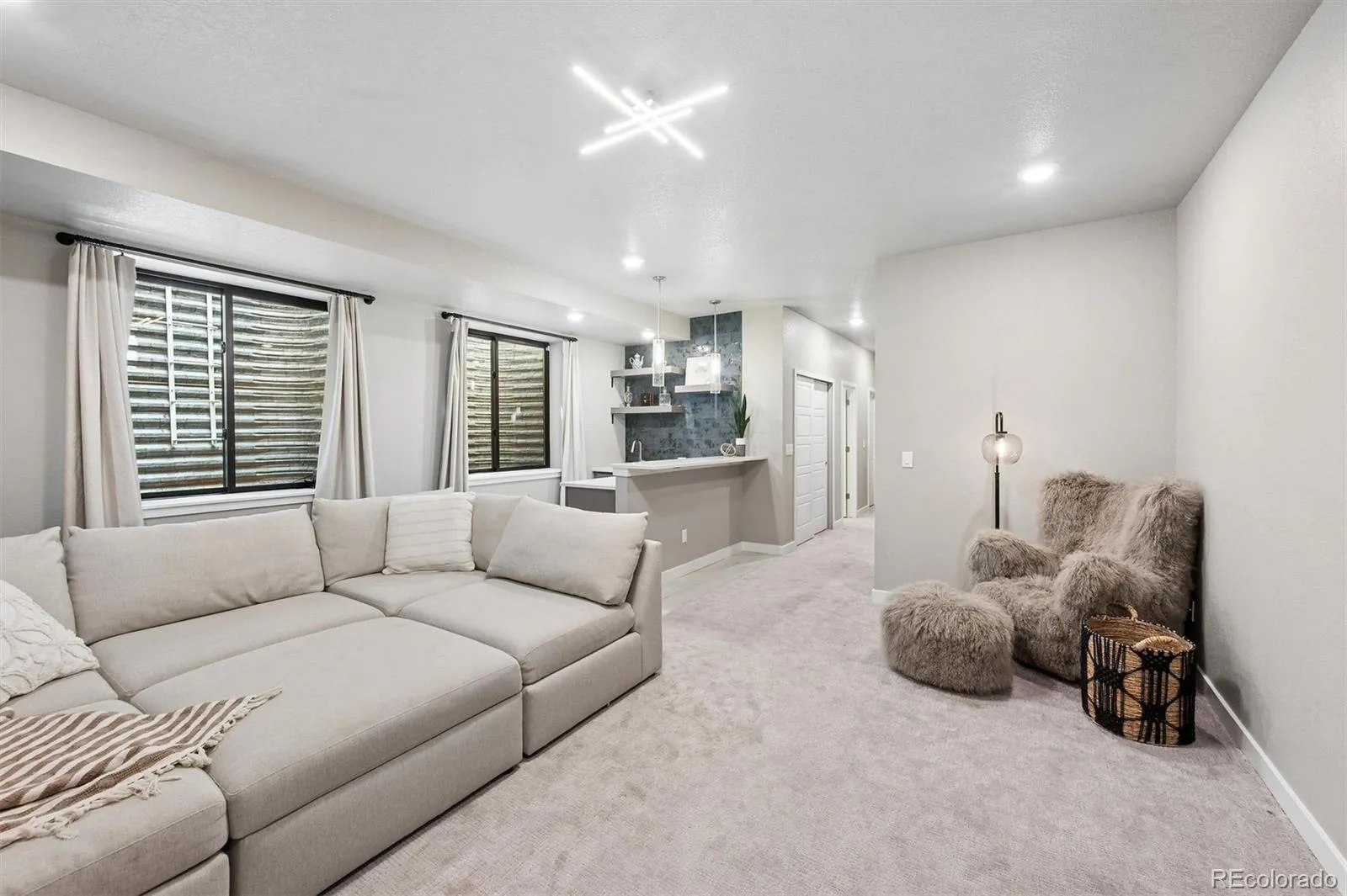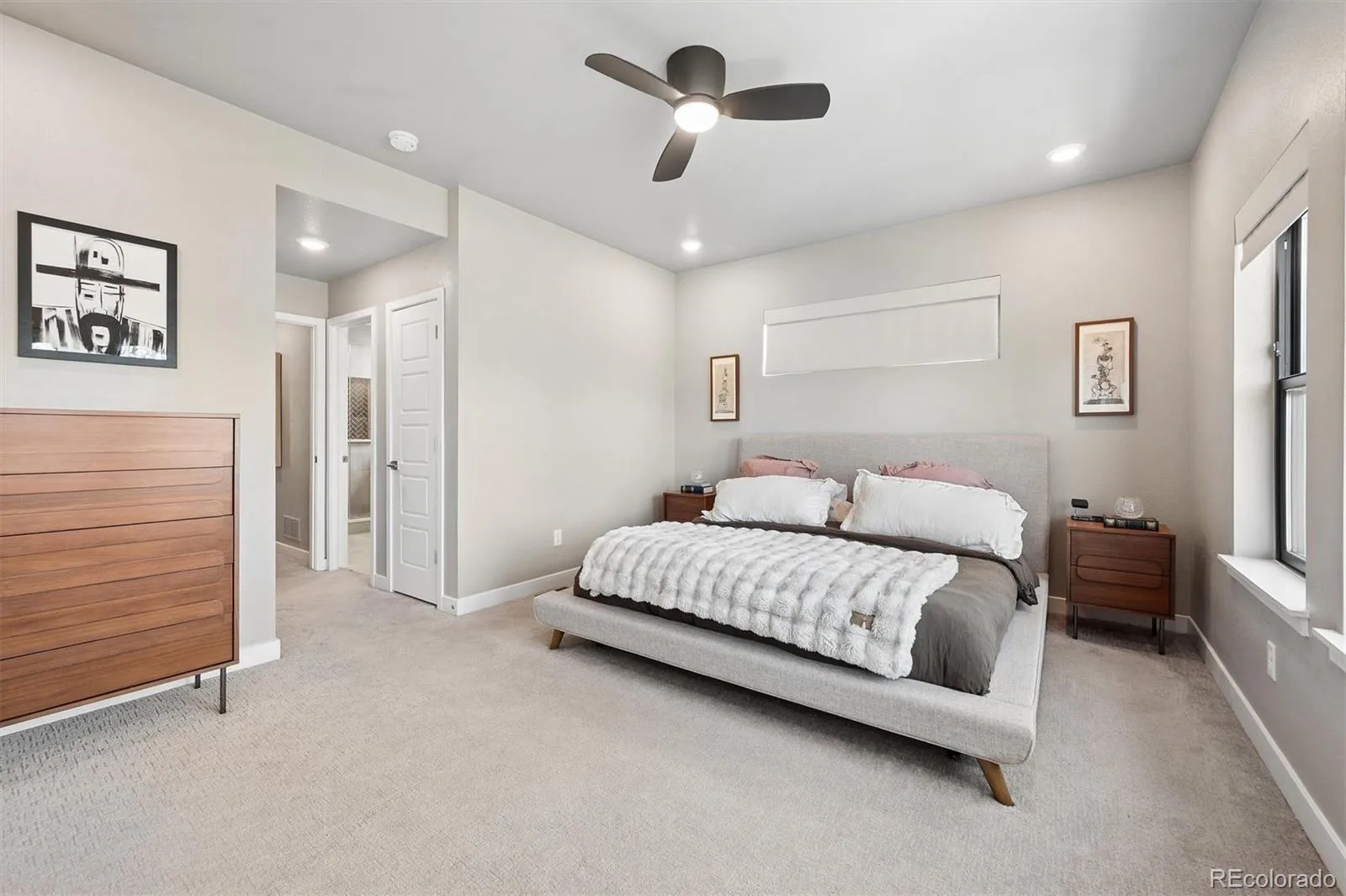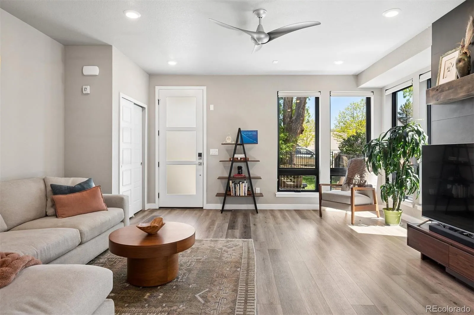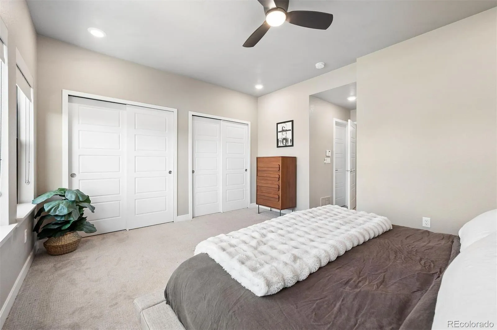 Ideally situated in the heart of Platt Park, one of Denver’s most sought-after neighborhoods, this thoughtfully designed residence blends modern sophistication with effortless, walkable living—just moments from South Pearl Street’s boutiques, dining, and local charm. Built in 2021, the home offers tall ceilings, expansive windows, and seamless indoor-outdoor connection, complete with both front and back yards, a fully fenced setting, and a rooftop deck capturing stunning mountain views. The main level is designed for both everyday living and entertaining, featuring a spacious dining area and a light-filled great room anchored by a gas fireplace with a sleek tile surround and mantle. A custom bar with wine cooler adds an elevated touch, while updated lighting enhances the home’s contemporary aesthetic. At the heart of the home, the kitchen is both functional and refined—appointed with quartz countertops, soft-close white cabinetry, and a full suite of Monogram stainless steel appliances, including a six-burner gas cooktop with hood, built-in oven, microwave, and dishwasher. A large center island and walk-in pantry complete the space, offering both style and convenience. Upstairs, the primary suite serves as a private retreat, featuring a generous walk-in closet, additional wall closets, and a beautifully finished en-suite bath with tile flooring and dual vanities. An additional bedroom with walk-in closet and ceiling fan, along with a full bath, provides comfortable accommodations for family or guests. The finished basement expands the home’s versatility with a spacious recreation room, wet bar with beverage fridge, custom shelving, and a third bedroom with adjacent three-quarter bath—ideal for guests or extended living. Additional highlights include LVP flooring, plush carpeting, a mudroom with built-in cubbies, dedicated laundry room, and a detached two-car garage.