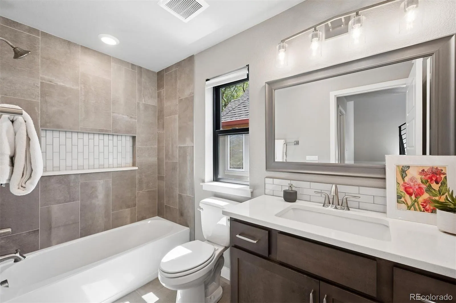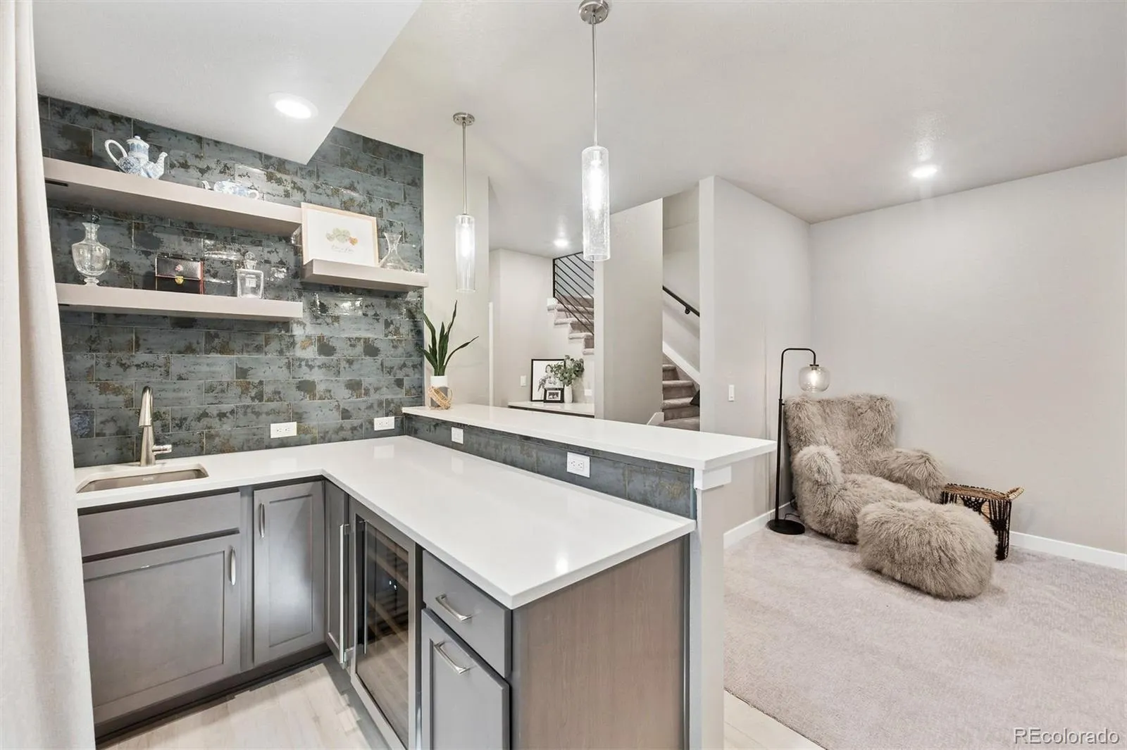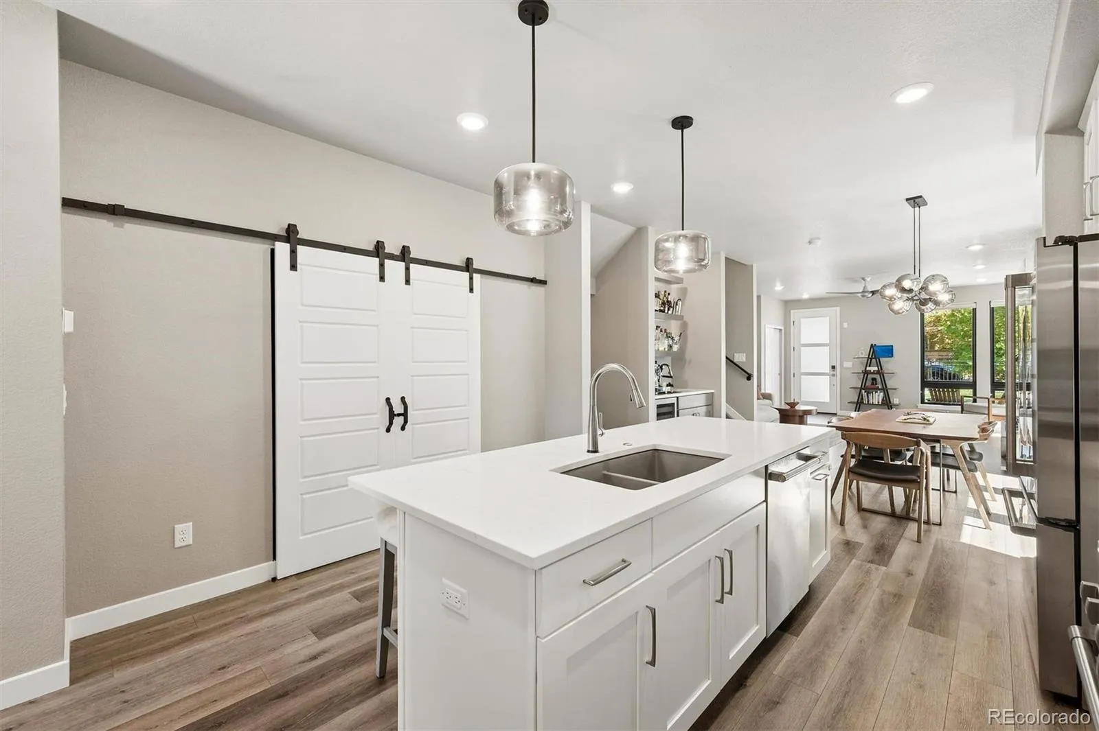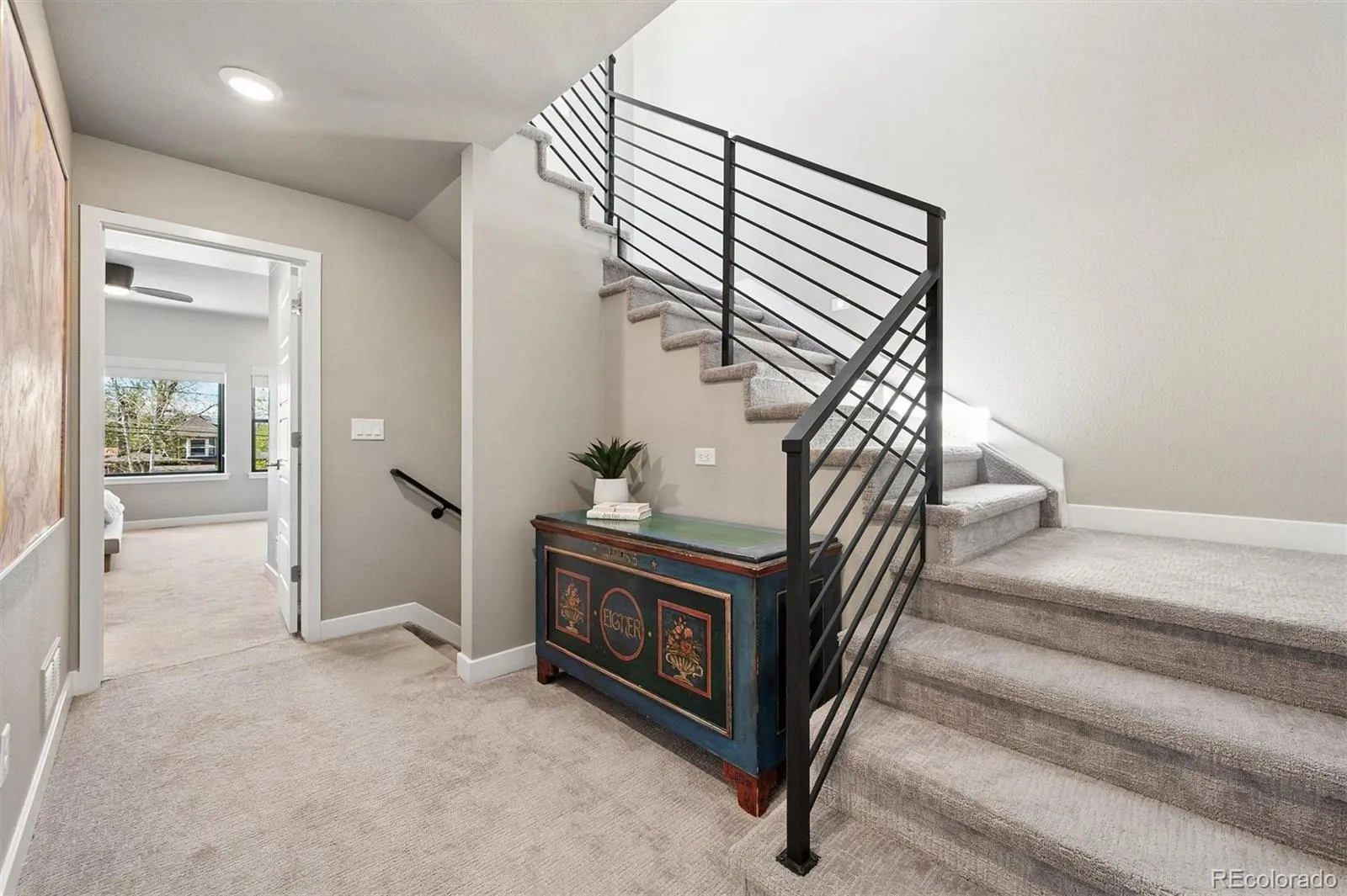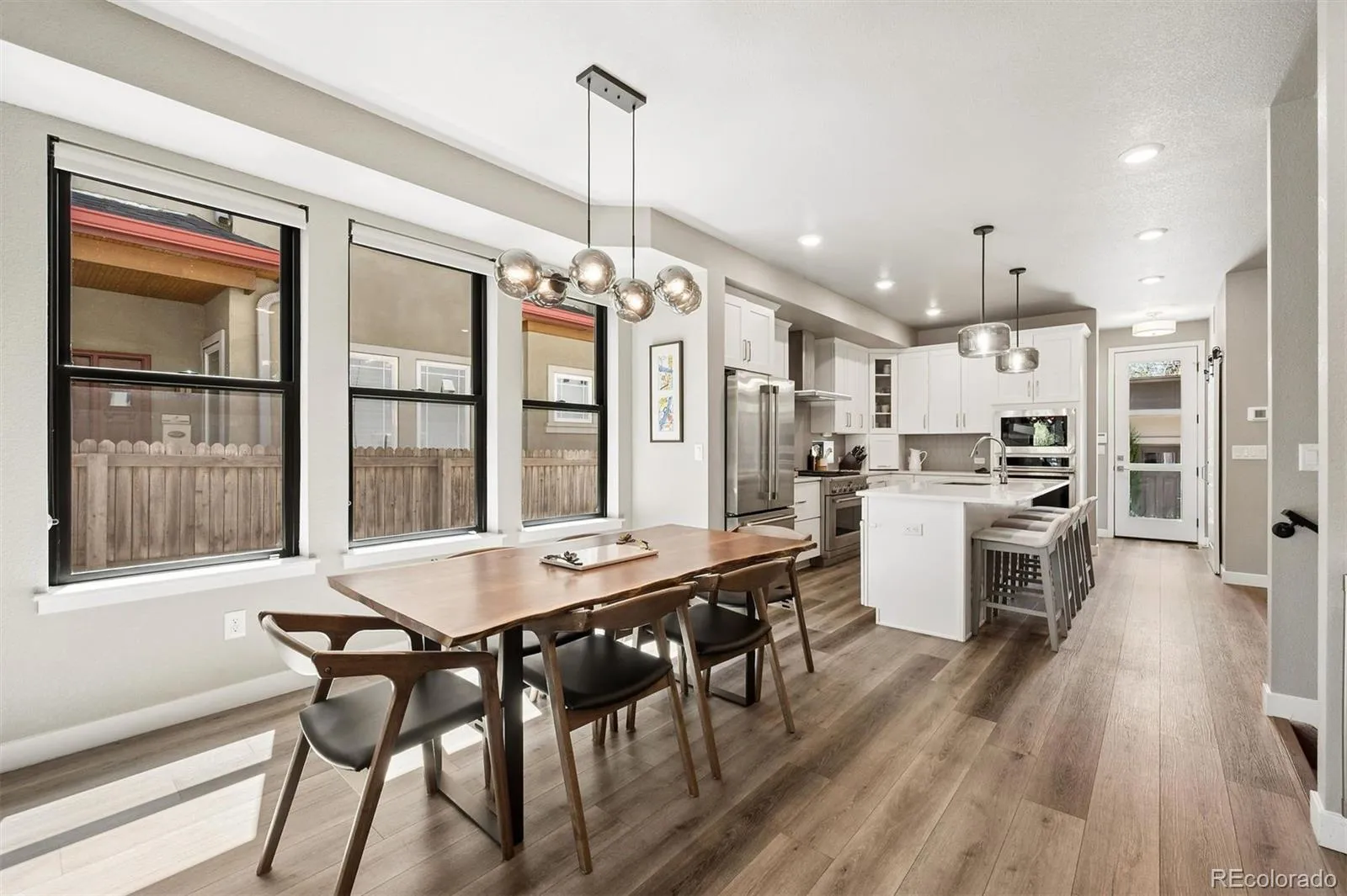 Ideally situated in the heart of Platt Park, one of Denver’s most sought-after neighborhoods, this thoughtfully designed residence blends modern sophistication with effortless, walkable living—just moments from South Pearl Street’s boutiques, dining, and local charm. Built in 2021, the home offers tall ceilings, expansive windows, and seamless indoor-outdoor connection, complete with both front and back yards, a fully fenced setting, and a rooftop deck capturing stunning mountain views. The main level is designed for both everyday living and entertaining, featuring a spacious dining area and a light-filled great room anchored by a gas fireplace with a sleek tile surround and mantle. A custom bar with wine cooler adds an elevated touch, while updated lighting enhances the home’s contemporary aesthetic. At the heart of the home, the kitchen is both functional and refined—appointed with quartz countertops, soft-close white cabinetry, and a full suite of Monogram stainless steel appliances, including a six-burner gas cooktop with hood, built-in oven, microwave, and dishwasher. A large center island and walk-in pantry complete the space, offering both style and convenience. Upstairs, the primary suite serves as a private retreat, featuring a generous walk-in closet, additional wall closets, and a beautifully finished en-suite bath with tile flooring and dual vanities. An additional bedroom with walk-in closet and ceiling fan, along with a full bath, provides comfortable accommodations for family or guests. The finished basement expands the home’s versatility with a spacious recreation room, wet bar with beverage fridge, custom shelving, and a third bedroom with adjacent three-quarter bath—ideal for guests or extended living. Additional highlights include LVP flooring, plush carpeting, a mudroom with built-in cubbies, dedicated laundry room, and a detached two-car garage.