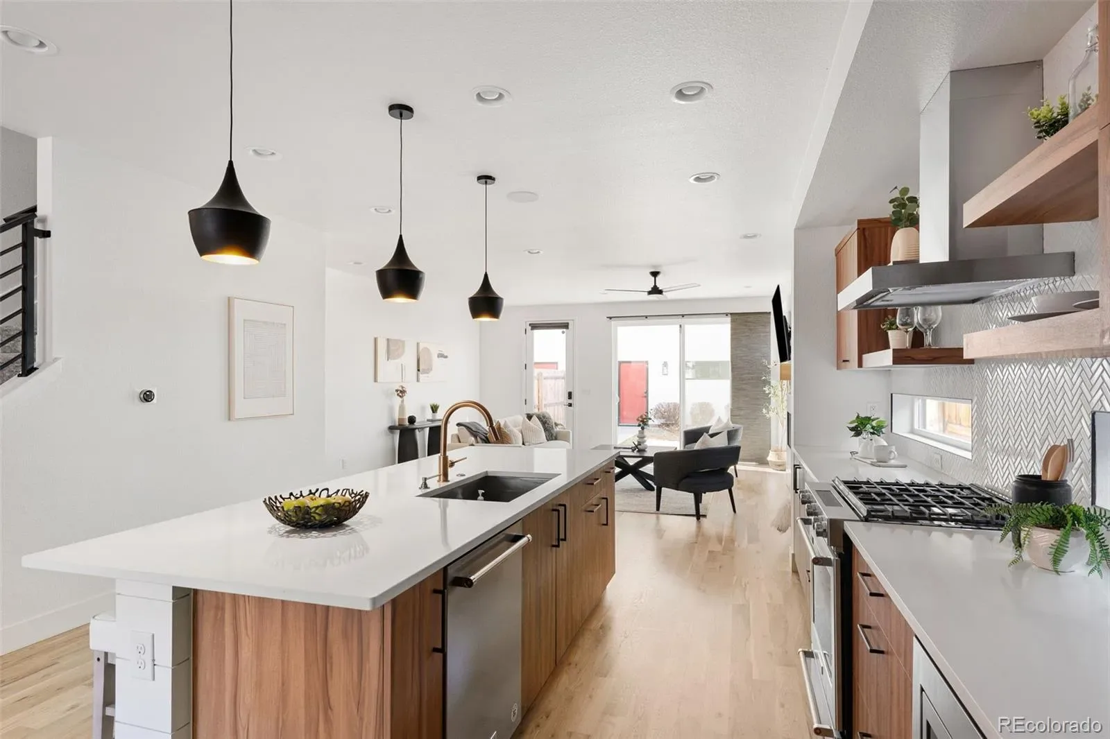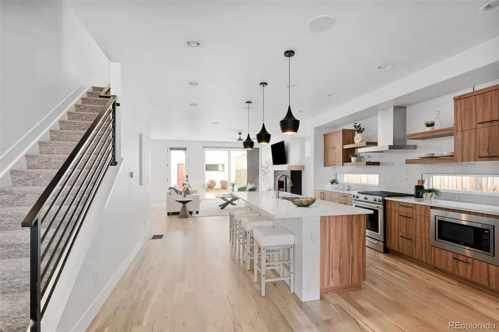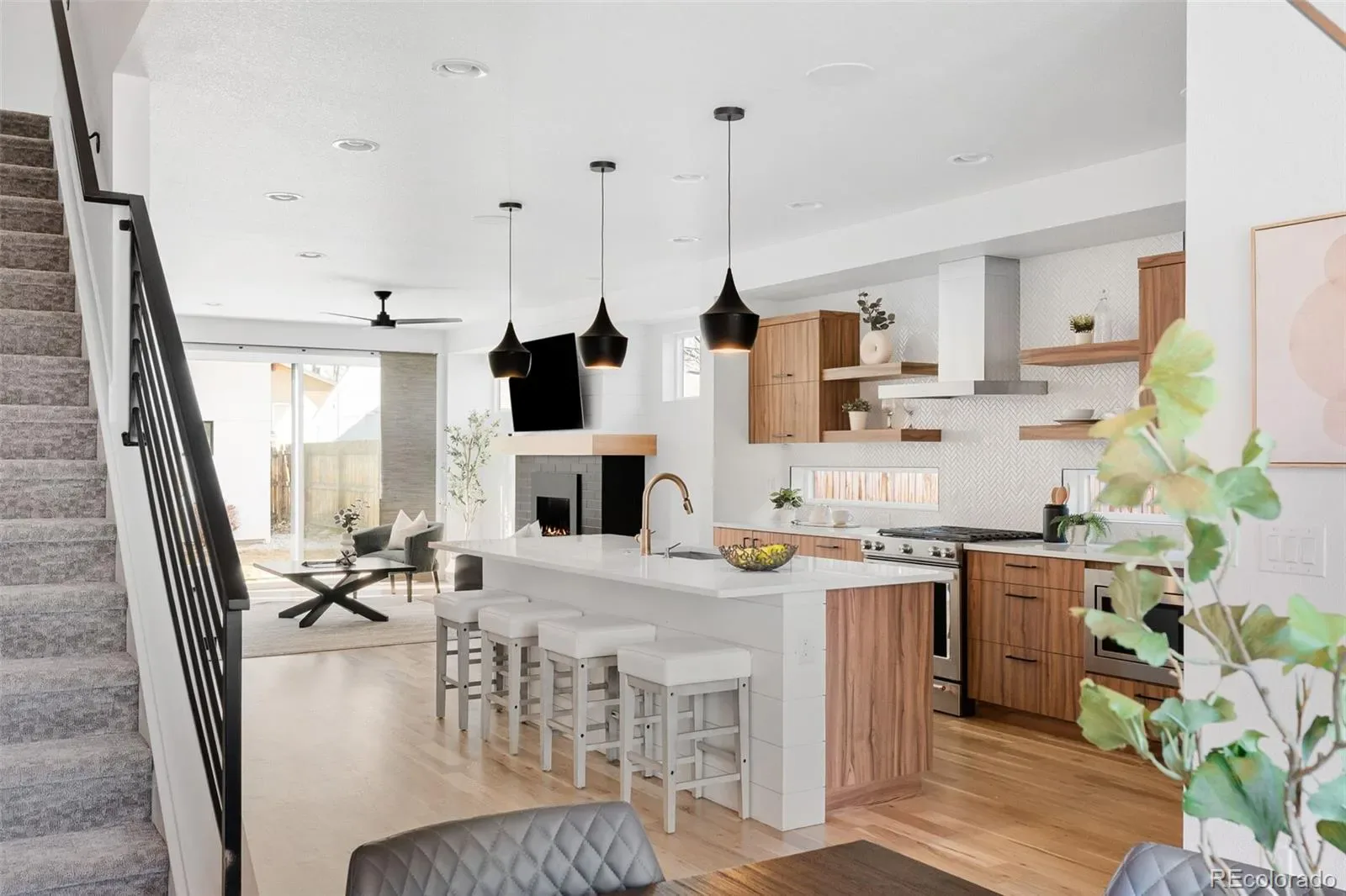 This sophisticated, modern townhome delivers the best of Denver urban living. Built in 2019, it offers the peace of mind that only comes from a home that still feels like new but comes without the potential surprises of a brand-new build. Spanning four beautifully designed levels, the home is filled with natural light and elevated by clean architectural lines and high-quality materials throughout, including wide-plank white oak floors, walnut-finished cabinetry, gas fireplace, quartz countertops, oversized kitchen island, and designer lighting, plumbing, and tile. The large sliding glass door between spacious living room and private backyard offers endless indoor-outdoor entertaining options for the warmer months. On the second floor, the generous primary suite is a true retreat, complete with a 5-piece bathroom and walk-in closet. Two more bedrooms and a full bathroom round out the second floor. The 3rd floor loft provides sunny additional living space, with a full wet bar and sweeping mountain views from the private rooftop deck. The fully finished basement is pre-wired for home theater, and has an additional bedroom and full bath. Outside, the hard work is done, with a fenced yard, professional landscaping, and sprinkler system. Custom 2-car garage with vaulted ceiling. Walkable to the many shops, restaurants, and amenities on South Broadway, plus easy access to parks and light rail.