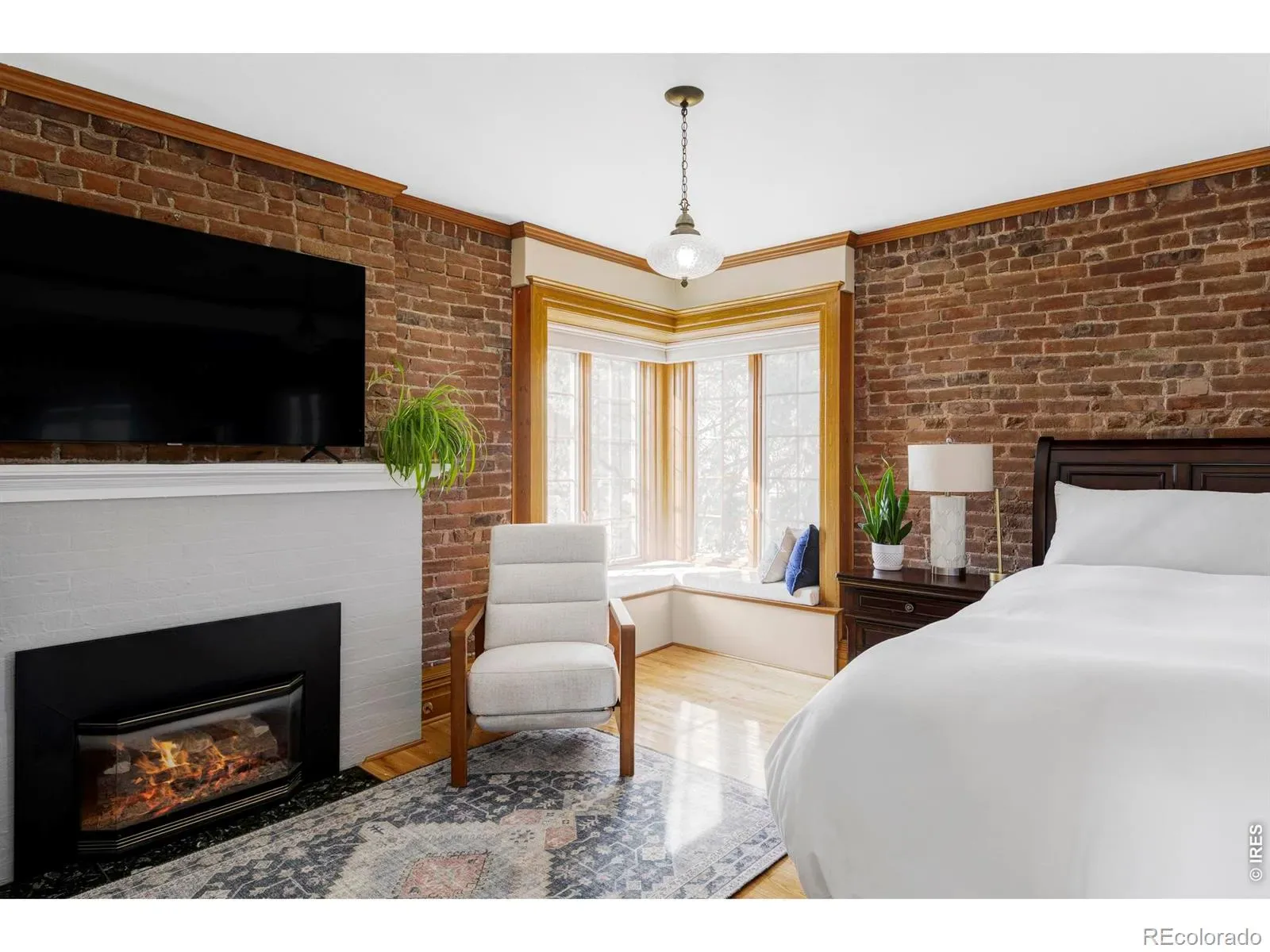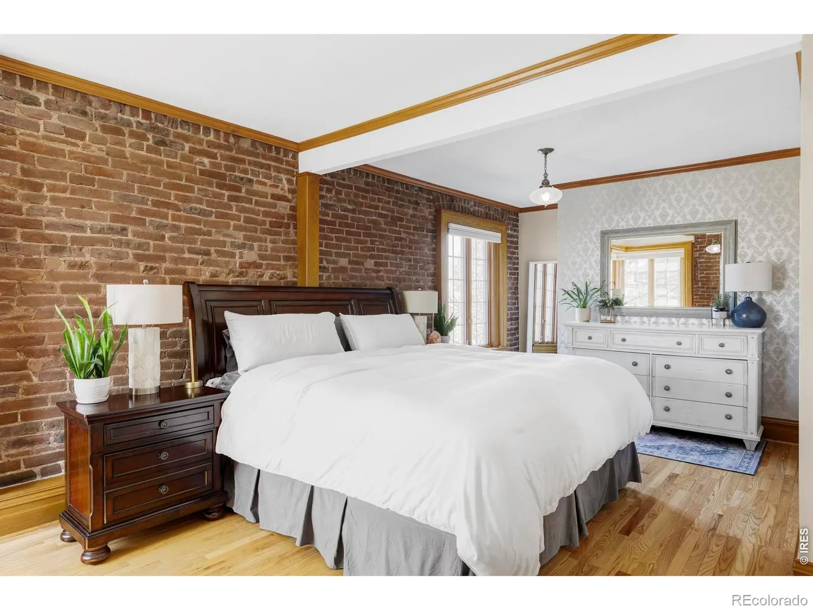 Rare 1898 Denver Square in the coveted East Seventh Avenue Historic District, listed on the National Register of Historic Places. This 3-bed, 3-bath home preserves an exceptional amount of original character: exposed brick, leaded glass windows, curved staircase, wood beams, gas fireplaces, window seats, and crown molding throughout. The main level flows from a sun-filled family room with a gas fireplace into a formal dining room and a well-appointed kitchen with granite countertops, hex tile backsplash, updated appliances, and a breakfast bar. A vaulted living room with built-in bar and French doors opens to a private flagstone patio with mature trees, water feature, dog run, and full fencing. Upstairs, the spacious primary bedroom features exposed brick, a gas fireplace, wood beams, accent wallpaper, and two closets. A second bedroom with built-in desk and shelving doubles as a home office. A third bedroom on the main level with its own full bathroom offers flexibility and privacy. Unfinished basement with wine cellar, workout space, and storage. Detached two-car garage with a mural by local Denver artist Charlo. New roof 2026. Steps from Cheesman Park, Washington Park, City Park, the Denver Botanic Gardens, and Cherry Creek. Walkable to restaurants, coffee shops, and grocery stores. Central Denver location with easy access to everything the city offers. Original hardwood floors, central air, and a close-knit historic neighborhood that is truly one of a kind.