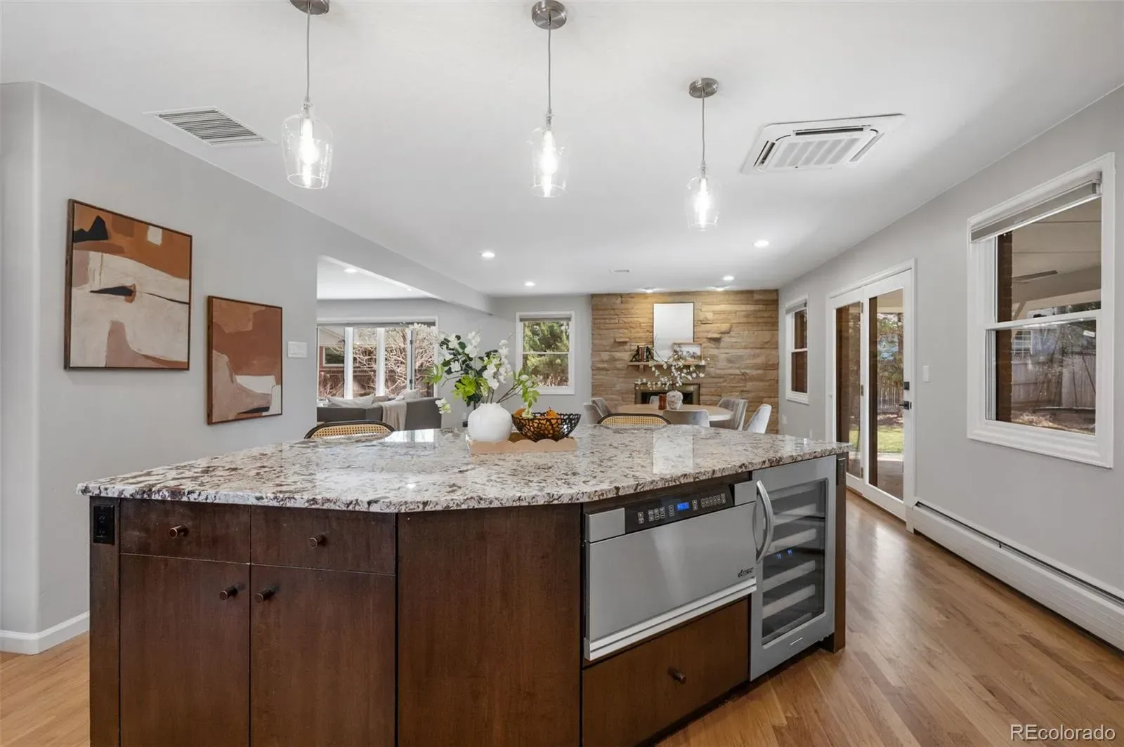 Beautifully updated & meticulously maintained, this classic Southern Hills ranch is just a stone’s throw from McWilliams (Dinosaur) Park and feeds into coveted Slavens K-8. A thoughtful recent refresh brings renewed energy to an already exceptional home. Fresh paint, updated fixtures, new hardware throughout, and a striking staircase to the basement, enhanced by a wooden railing with wrought iron balusters, makes an immediate impression. Rich hardwood floors, a statement flagstone fireplace, a charming bay window, and curated lighting establish a warm, elevated feel on the main level. Comfort meets efficiency with an integrated flush-mounted mini-split system on the main floor, delivering modern climate control without compromising aesthetics. The gourmet kitchen is a true centerpiece showcasing high-end granite countertops, Thermador and SubZero appliances, custom Crystal cabinetry, and an expansive center island; all complemented by an adjacent mudroom/laundry for seamless daily living. Three spacious main-floor bedrooms include a tranquil primary suite with generous closet space and updated spa-like bath that features an oversized walk-in shower. The finished basement expands living/entertaining possibilities with a stylish wet bar, beverage fridge, and media area — alongside an enormous guest bedroom or bonus room with a private bath & walk-in shower. The utility room & crawl space provide outstanding storage, and the garage offers a newly refinished floor, flexibility for gear, toys or an additional workspace. A quiet oversized lot, extended covered patio, and mature landscaping front and back create an inviting setting for relaxing, playing, or hosting. New soffits, fascia, and recently installed gutters w/leaf guards add function and peace of mind. An unmatched location – close to Observatory Park, Slavens Elementary, and minutes from vibrant dining and shopping in Cherry Creek, DTC, DU, Swedish Medical Center & University Hills. This is your new home!