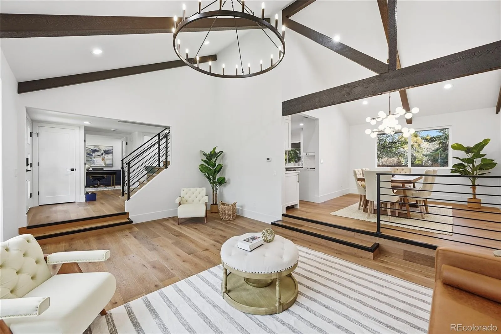 The main welcoming area is defined by soaring ceilings and expansive windows, creating an open, light-filled space that feels both elevated and inviting. Wide-plank European oak floors run throughout. A timeless fireplace anchors the living room.