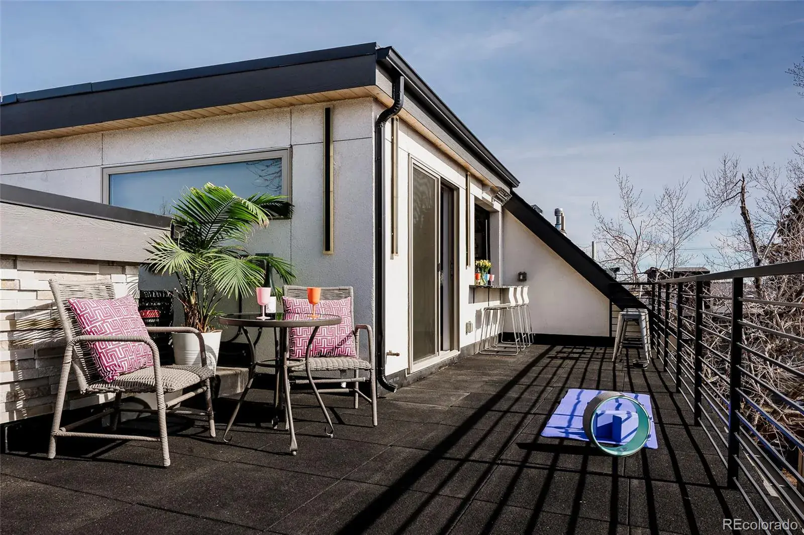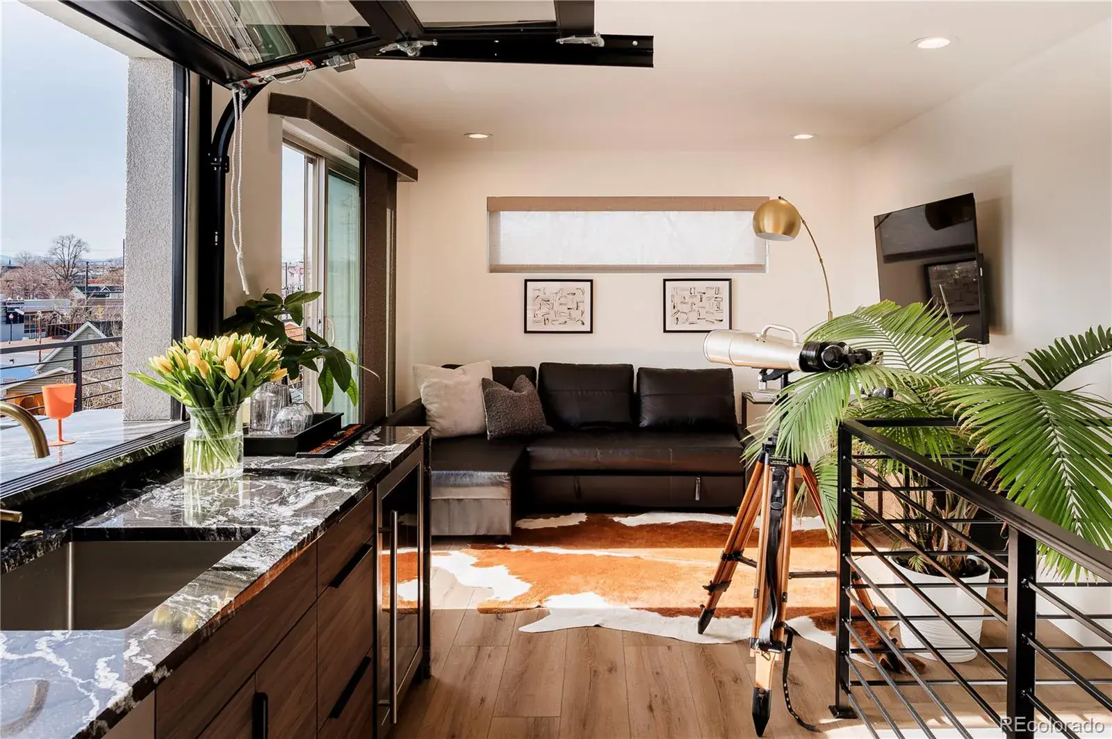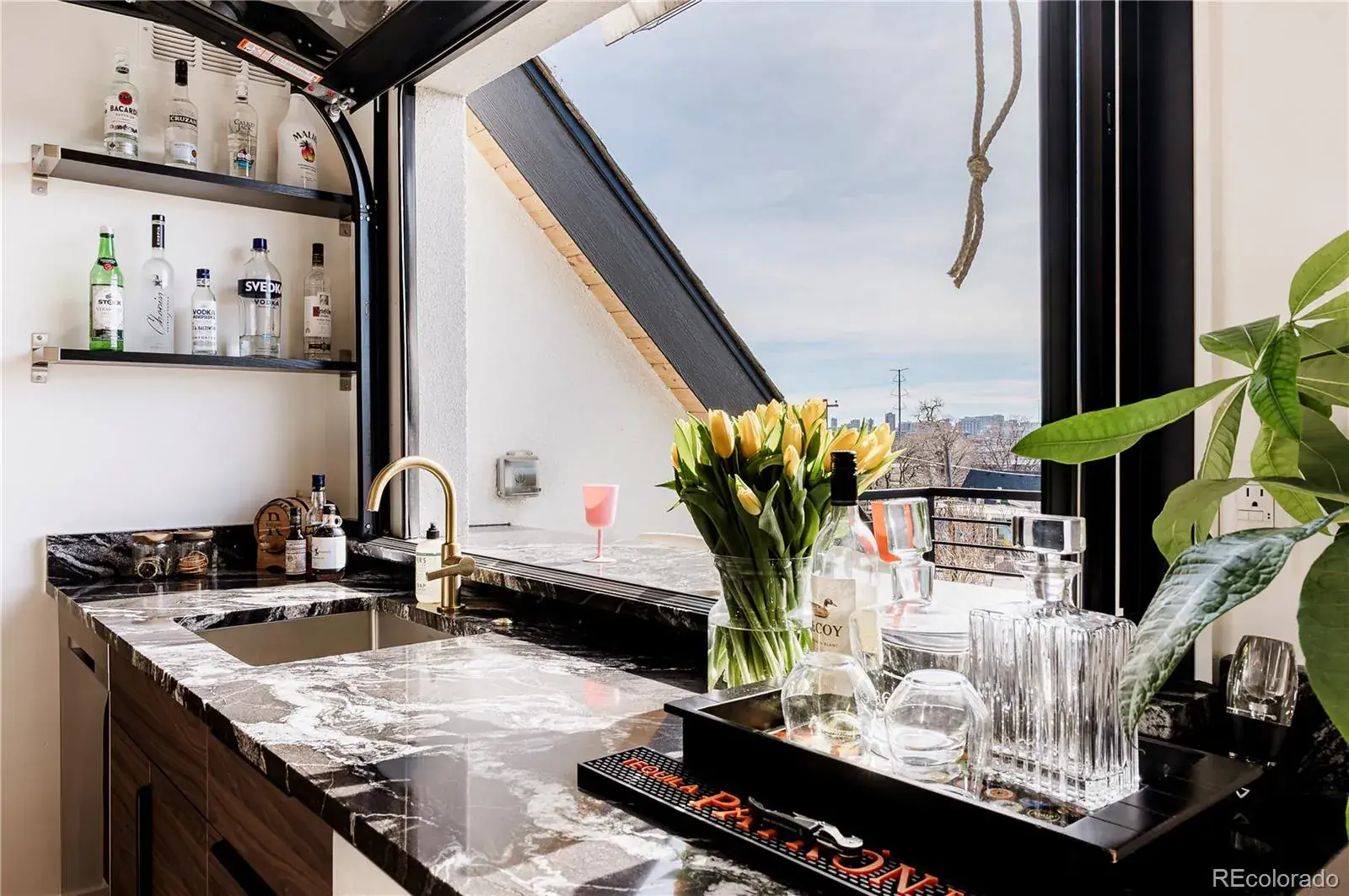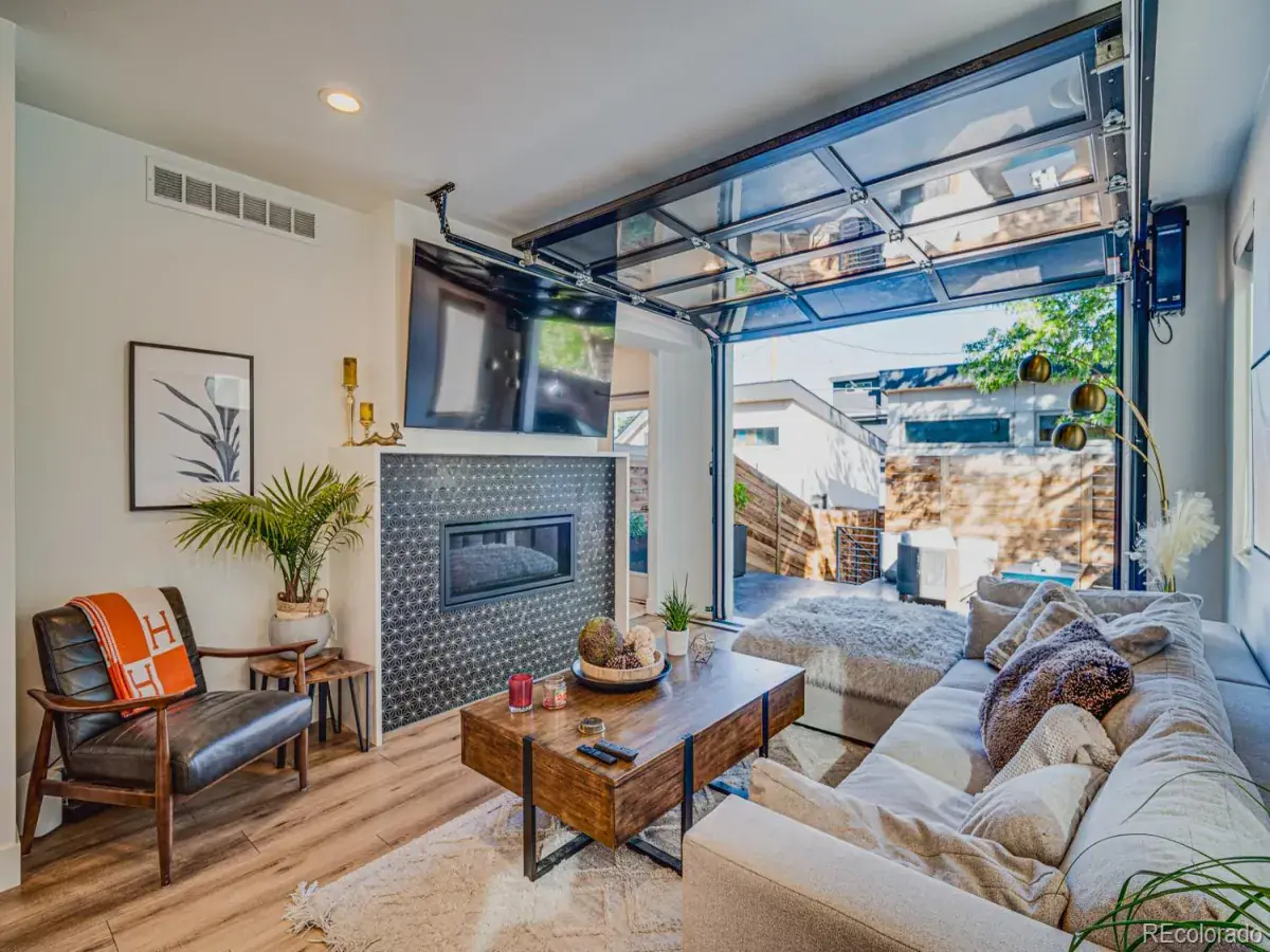 The top floor is built for entertaining, complete with a custom wet bar with dishwasher and beverage fridge and a half-height overhead garage door that opens to the rooftop patio, creating an incredible indoor-outdoor lounge experience with city views.