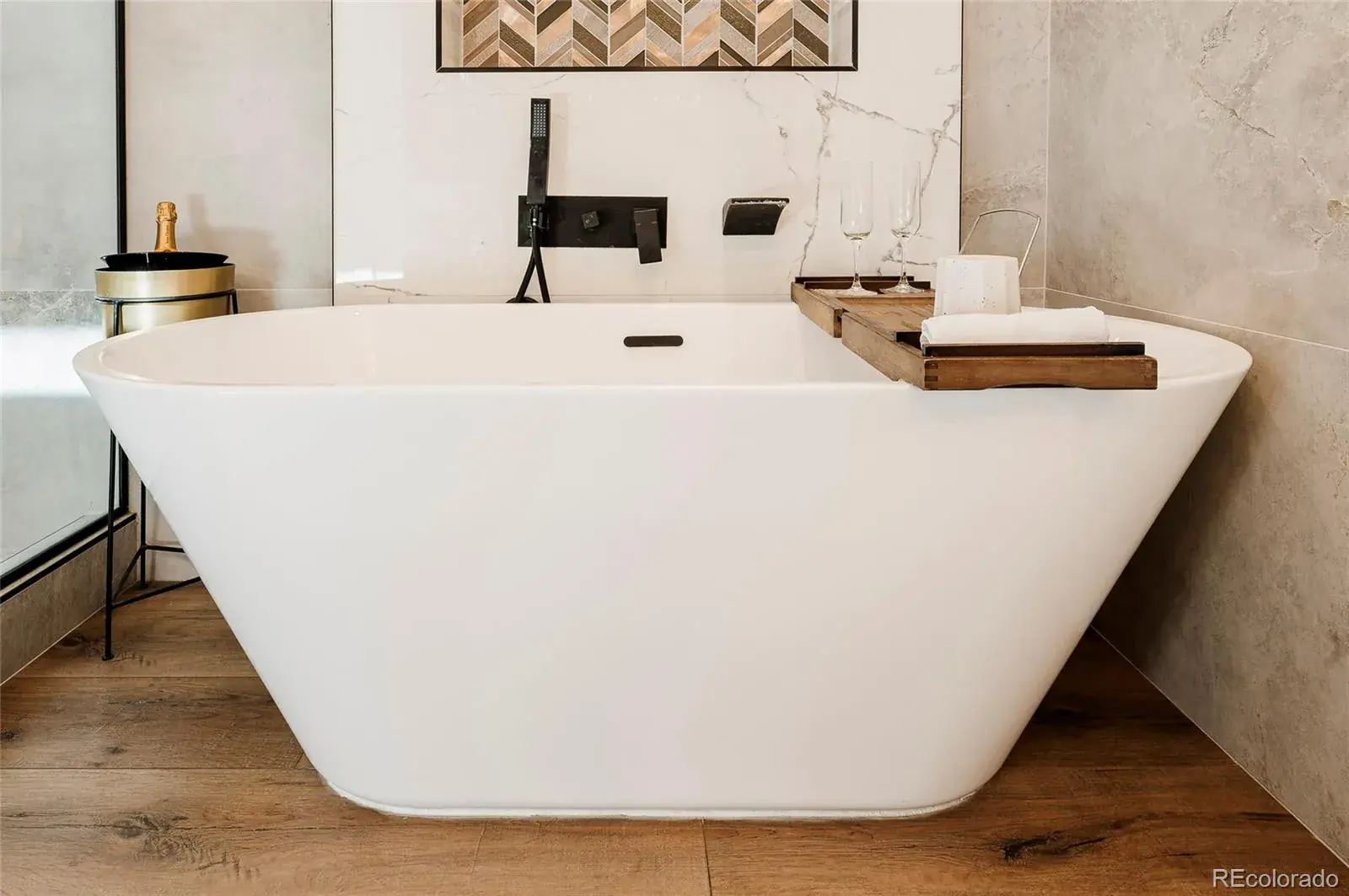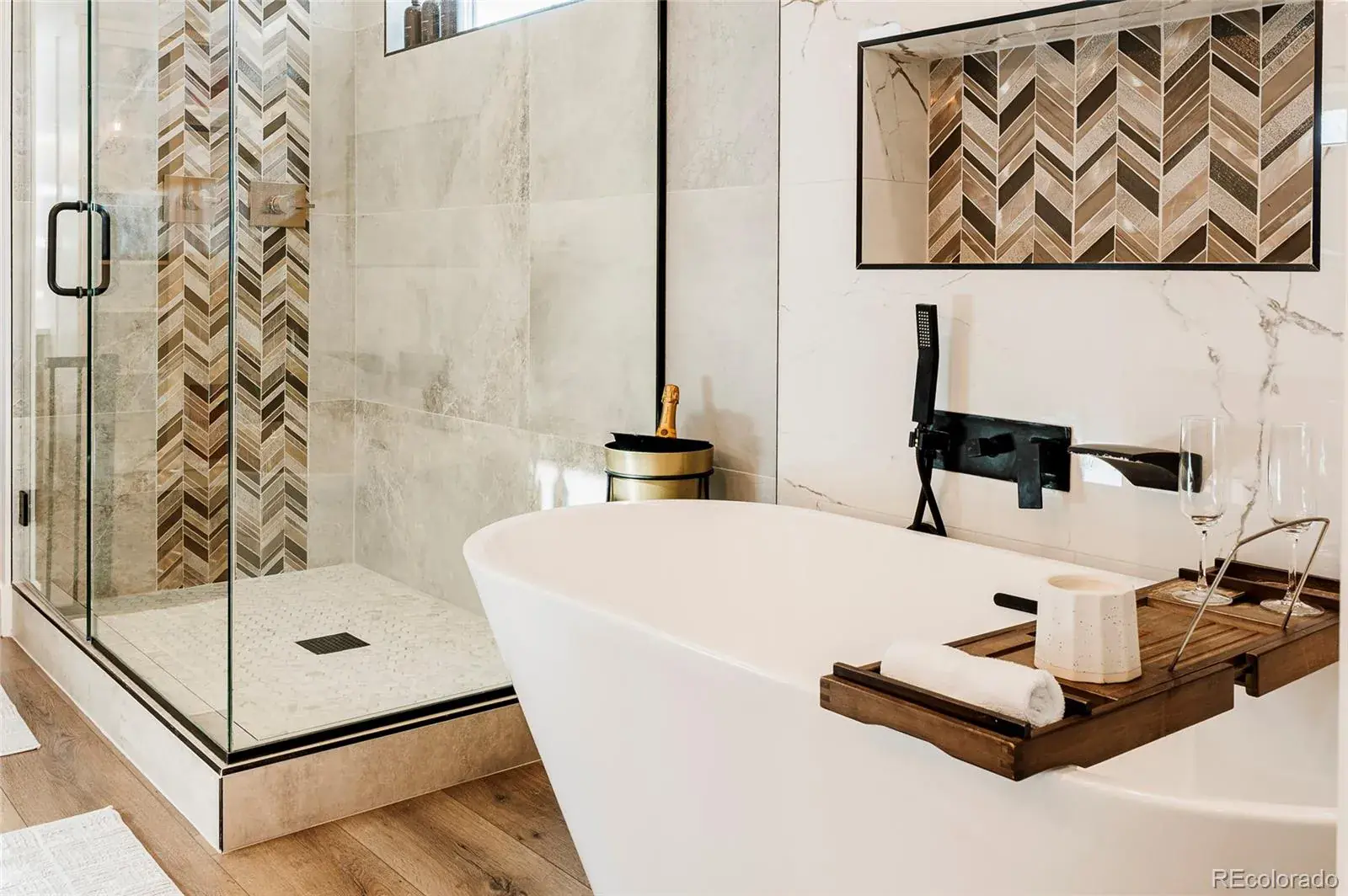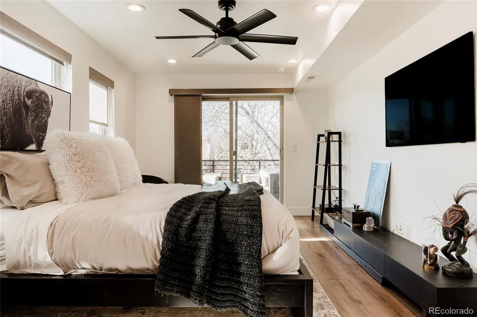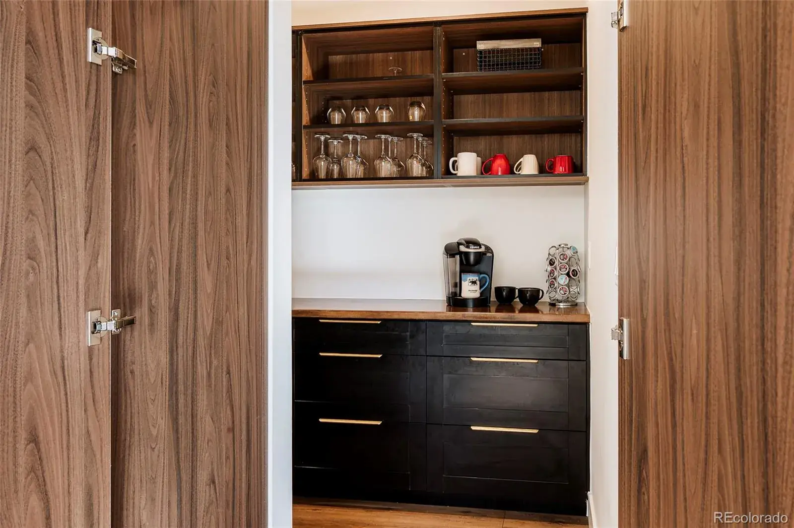 The top floor is built for entertaining, complete with a custom wet bar with dishwasher and beverage fridge and a half-height overhead garage door that opens to the rooftop patio, creating an incredible indoor-outdoor lounge experience with city views.