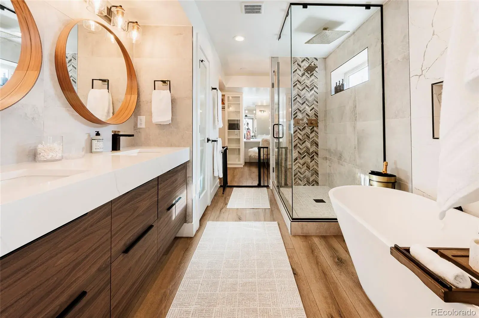 The spacious primary suite offers a private retreat with a luxurious 5-piece bath, oversized custom walk-in closet, and private covered deck. The second floor also includes convenient laundry and well-appointed secondary bedrooms.