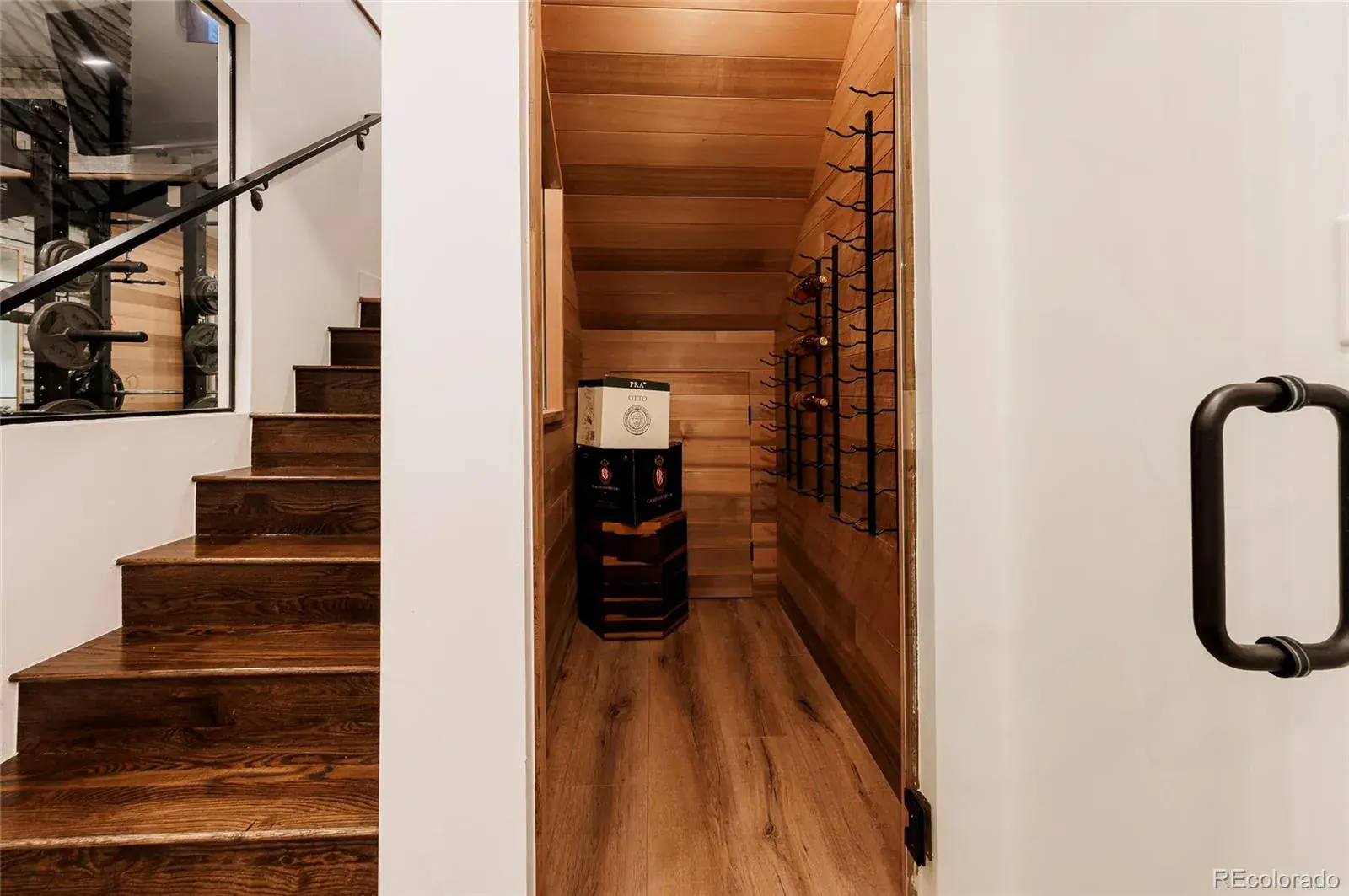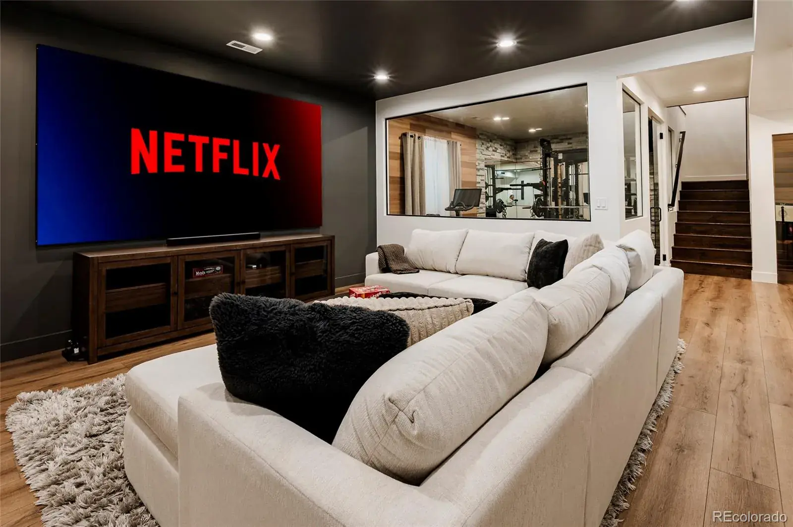 The fully finished basement is designed for lifestyle and entertainment, featuring a media room with projector and 125” screen, wet bar with beverage fridge, wine area, a truly one-of-a-kind exercise room, a spacious fourth bedroom, and a full bath.