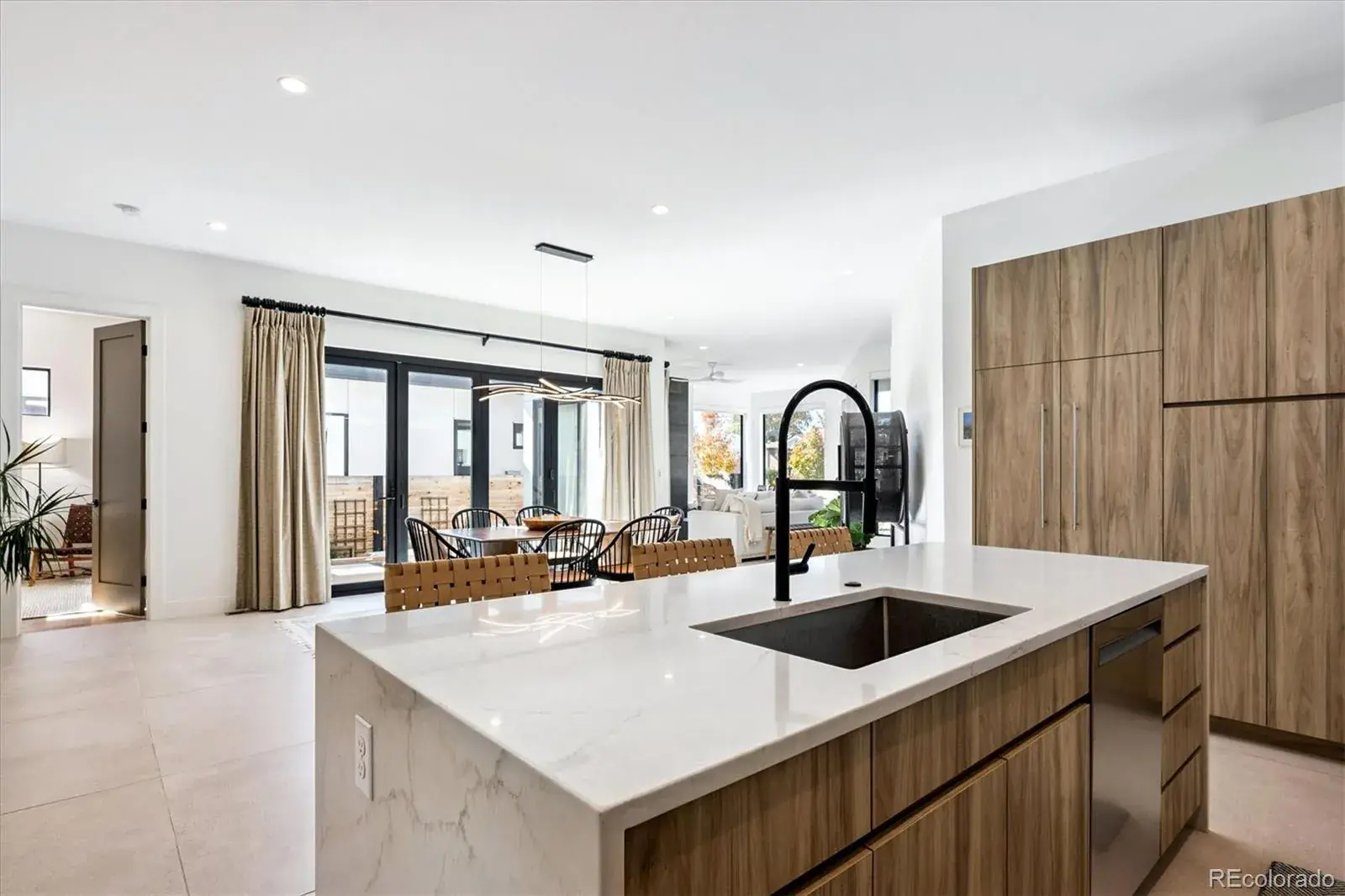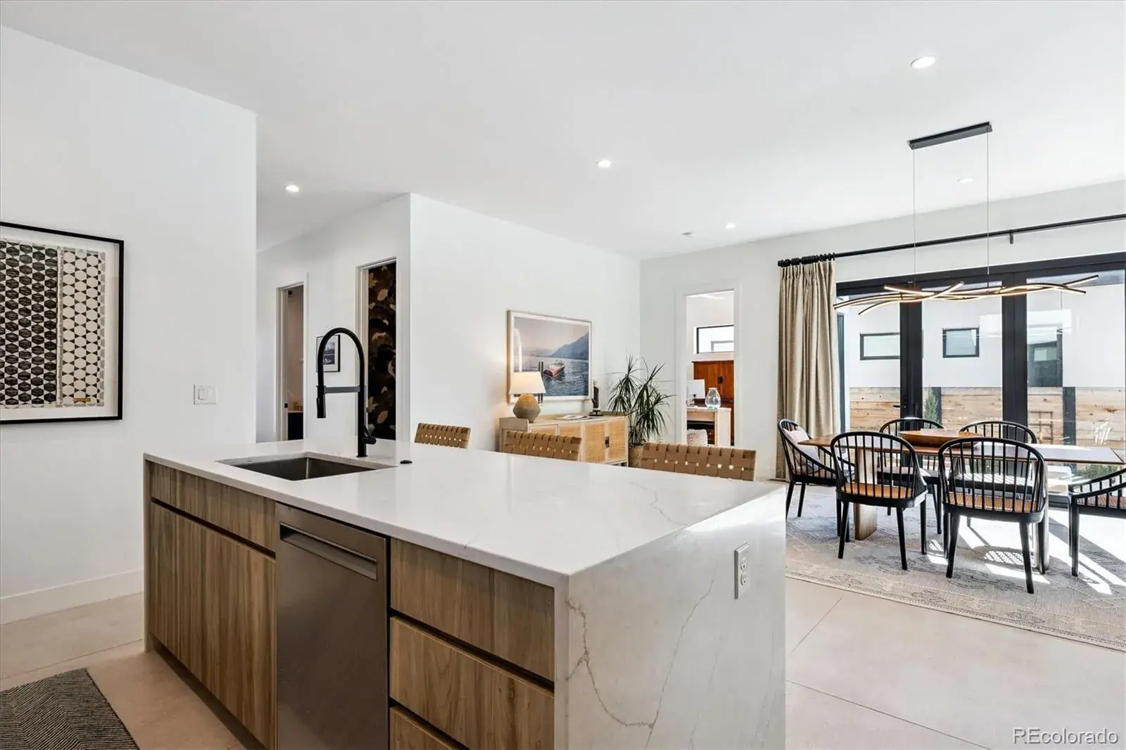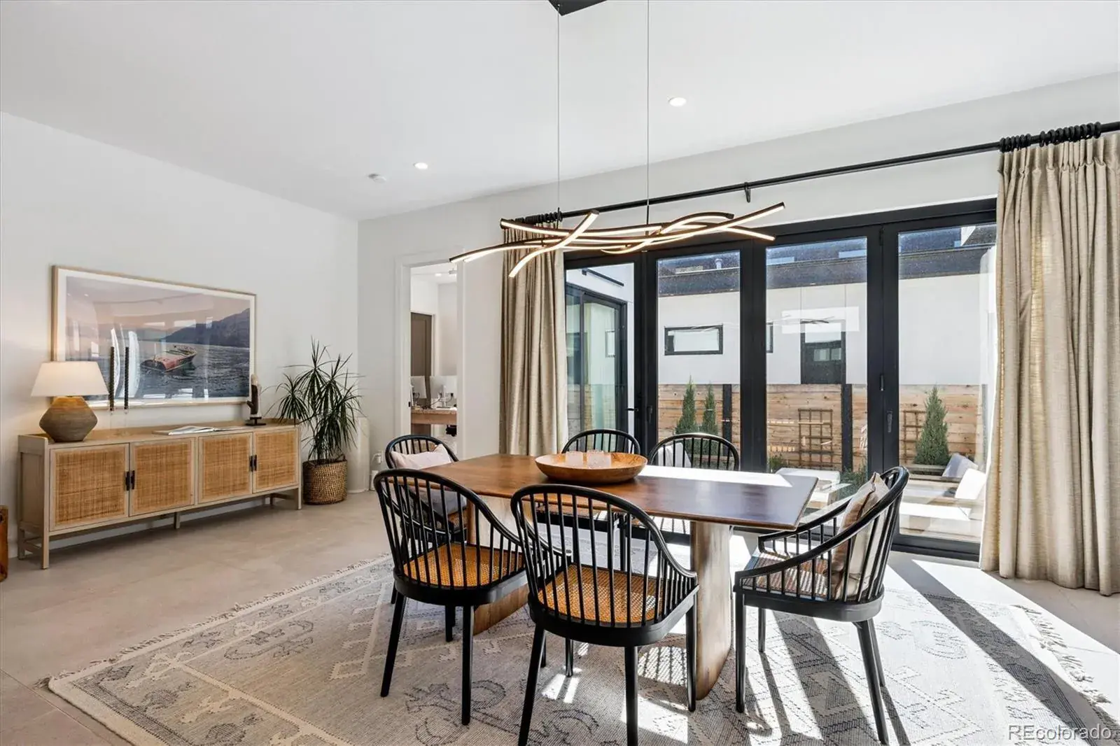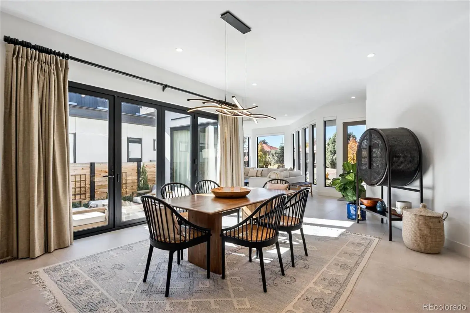 *$15,000 Lender Concession Offered For Rate Buy Down and/or Closing! Stunning Mid-Century Modern masterpiece in the heart of Sunnyside, offering ranch-style living at its finest. Filled with natural light from expansive windows, this home showcases an open floor plan designed for effortless everyday living and elegant entertaining. Accordion-style doors create a seamless transition for indoor-outdoor living, leading to a private terrace perfect for relaxing or hosting guests. Designer finishes abound, featuring high-end Porcelanosa tile and thoughtfully curated details throughout. At the heart of the home, the chef’s kitchen impresses with quartz countertops, a waterfall island, Dacor French Door refrigerator, JennAir range top and oven/microwave combo, custom tile backsplash, and upgraded lighting selections—ideal for both cooking and entertaining. The main level includes a luxurious primary suite with walk-in closet and spa-inspired bath complete with standalone tub, dual vanities, and walk-in shower. Two additional bedrooms share a Jack-and-Jill bath, while an exquisite powder room showcases designer wallpaper. Custom curtains in select rooms, Hunter Douglas Roman shades in all bedrooms, and remote-control shades in the primary suite and living room add both function and sophistication, complemented by a whole-house Honeywell steam humidifier. The fully finished basement extends the living space with an expansive recreation room, wet bar with refrigerator and dishwasher, three additional bedrooms, full bath, second laundry hookup, and plush wool carpeting—just another of the home’s many upgrades. Outside, enjoy a professionally designed and landscaped backyard with a custom garden box, perfect for outdoor dining and relaxation. Completing this exceptional property is a detached three-car garage. Ideally located just steps from Rocky Mountain Lake Park and Berkeley Lake Park, and near Tennyson Street, the Highlands, and downtown Denver.