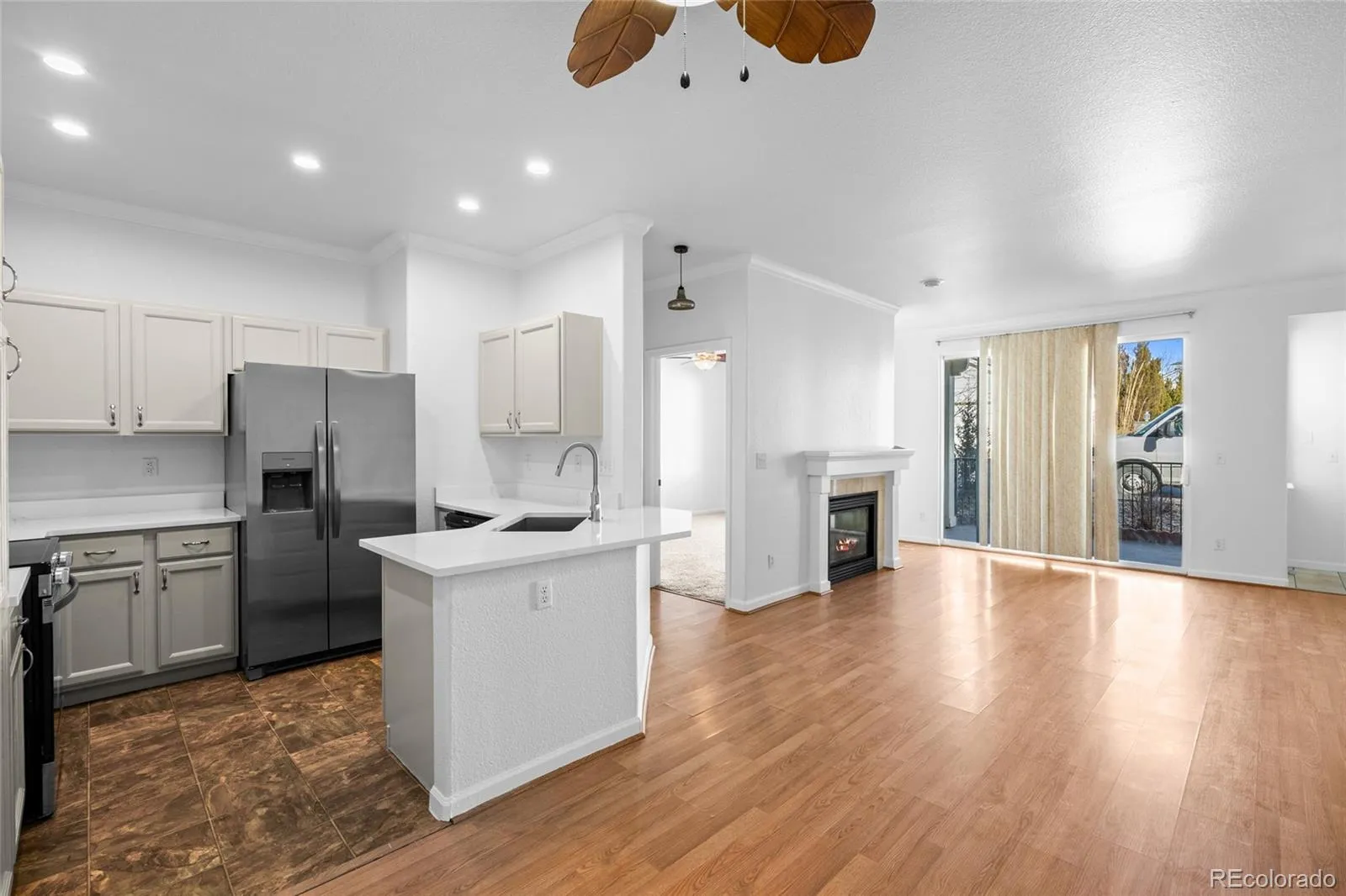 Welcome Home! This Unit is the One You Want! We will pay 3 months of HOA payments for you at closing. This newly remodeled, attractive and well-planned condo features 2-bedrooms, 2-bathrooms, with fresh designer interior paint, freshly painted cabinets, new quartz countertops, new stainless appliances (refrigerator, dishwasher, microwave, stove), new lighting fixtures in bathrooms, and new 2″ white blinds in bedrooms. The cozy fireplace in the large living room will take that evening chill out for you. Nice ceiling fans are located in both bedrooms and the living room. The street level exterior entry helps with unloading and moving. All living space is the unit is conveniently located on one level. Washer and dryer is located in the hall closet and is included. The unit features a great location near the complex pool and public transportation is close by. This complex is centrally located near shopping and dining, with lots of entertainment options nearby. A spacious one-car attached garage rounds out this attractive package. Great starter home! Come take a look…