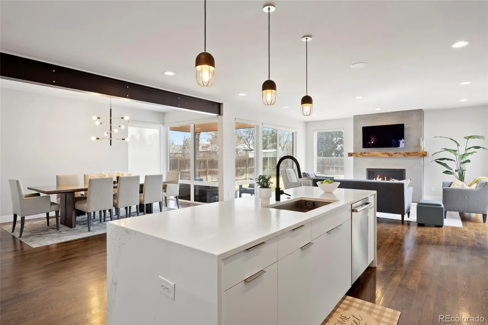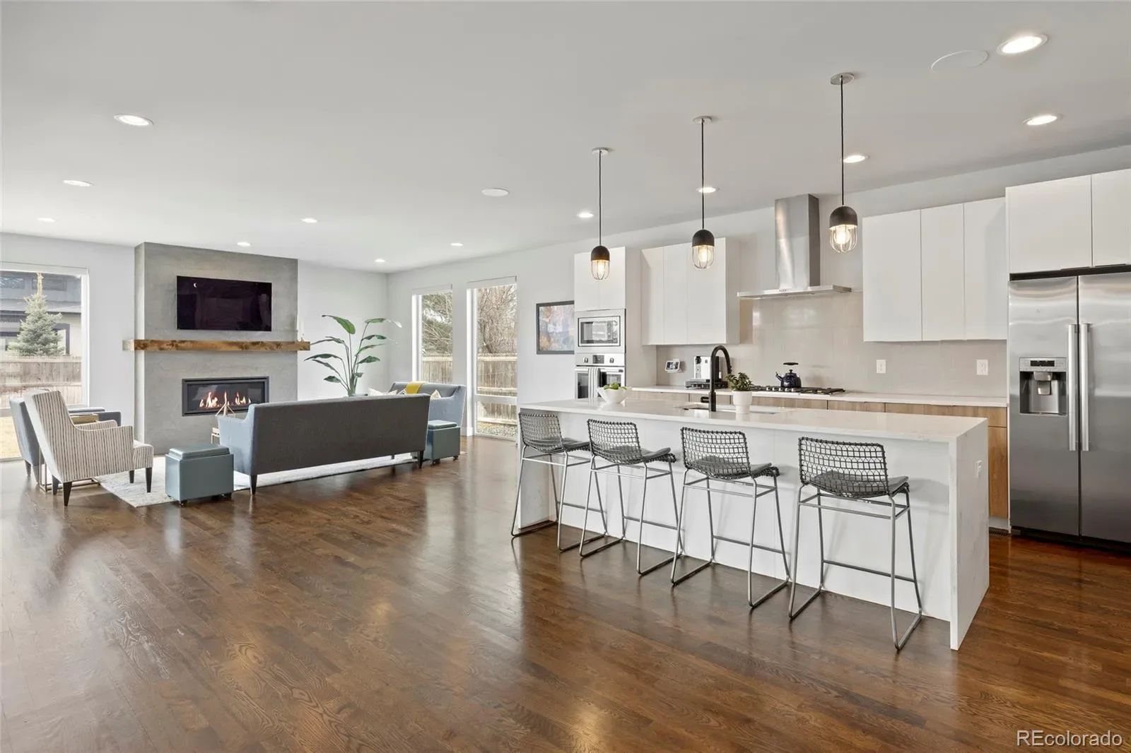 The main level is designed for both productivity and entertaining, boasting a dedicated office, a formal dining area, and a spacious living room centered around a cozy fireplace. The gourmet kitchen is equipped with quartz countertops, a walk-in pantry, and high-end appliances.