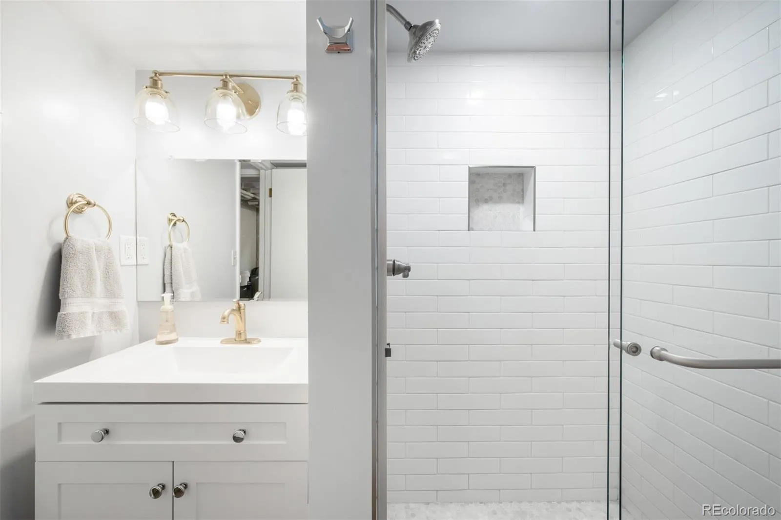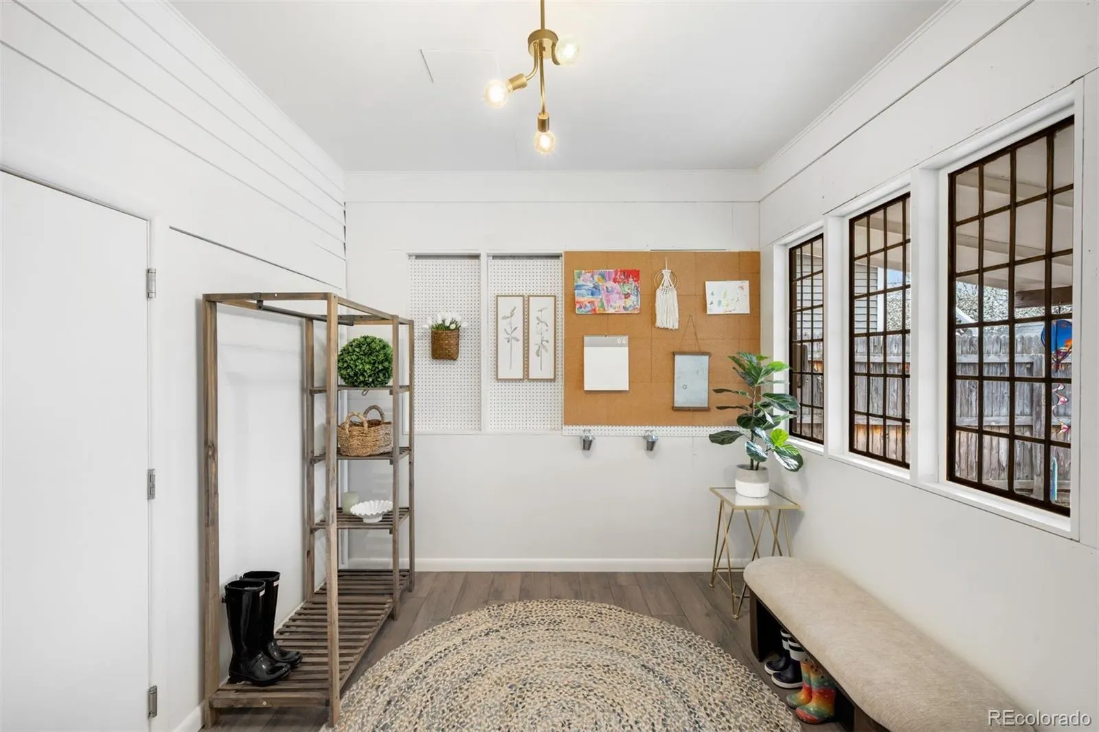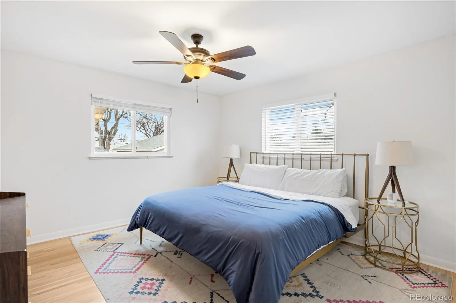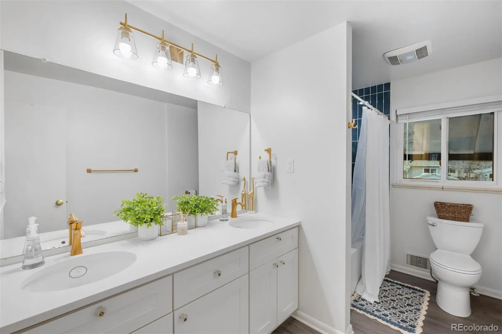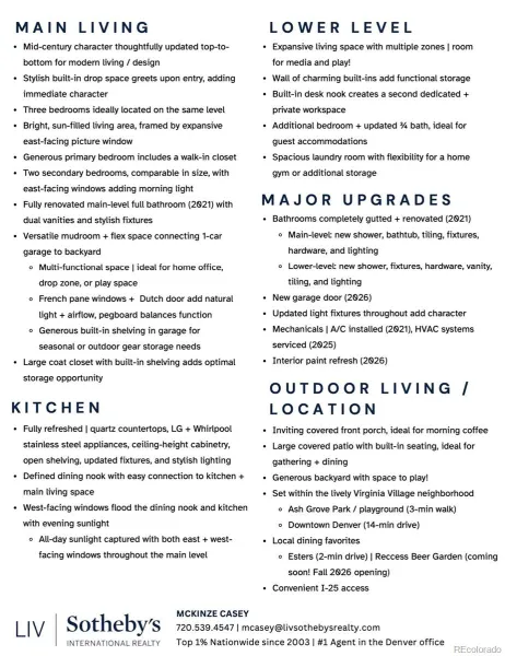 Mid-century character meets refreshed updates, with 3 bedrooms up and flexible living on both levels. At the entry, built-in cabinetry creates a functional drop zone, setting the tone of character + practicality. The main living is anchored by dramatic west + east-facing windows, complementing the home’s sun-filled feel throughout the day. A defined dining nook sits adjacent, maintaining open flow. The kitchen is fully refreshed with quartz countertops, stainless steel appliances, ceiling-height cabinetry, open shelving, and stylish lighting. Just beyond, a sun-drenched multifunctional mudroom connects the attached one-car garage (2026 garage door) to the backyard. French windows and a Dutch door extend the home’s character, creating a flexible and light-filled workspace. Three main-level bedrooms include a generous primary with a walk-in closet and a shared full bath. Both bathrooms were fully renovated in 2021, including new showers, updated hardware, a new vanity in the lower bath, and an added bathtub on the main level. The lower level expands livability with additional living space, integrated storage, and defined zones for media/ play. A built-in desk nook adds a second dedicated flex space, offering a quiet zone for work, alongside an additional bedroom + updated 3/4 bath for comfortable guest accommodation. A spacious laundry room adds further flexibility and is currently used as a home gym. Outdoor living centers around a large covered patio with built-in bench seating, overlooking generous green space. Set within the Virginia Village neighborhood, the home offers easy access to I-25, proximity to downtown Denver (5-miles), and moments to Ash Grove Park and playground. Nearby neighborhood favorites include Esters + a new Recess Beer Garden slated to open nearby in Fall 2026!