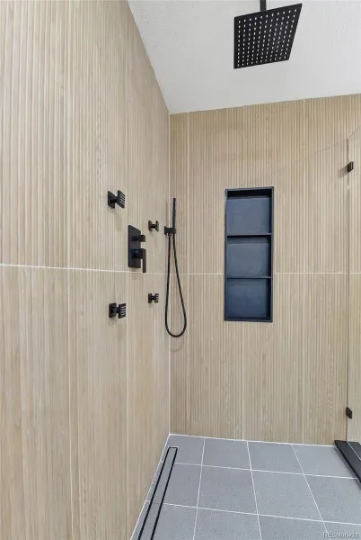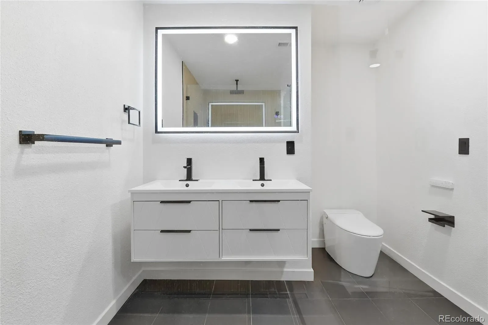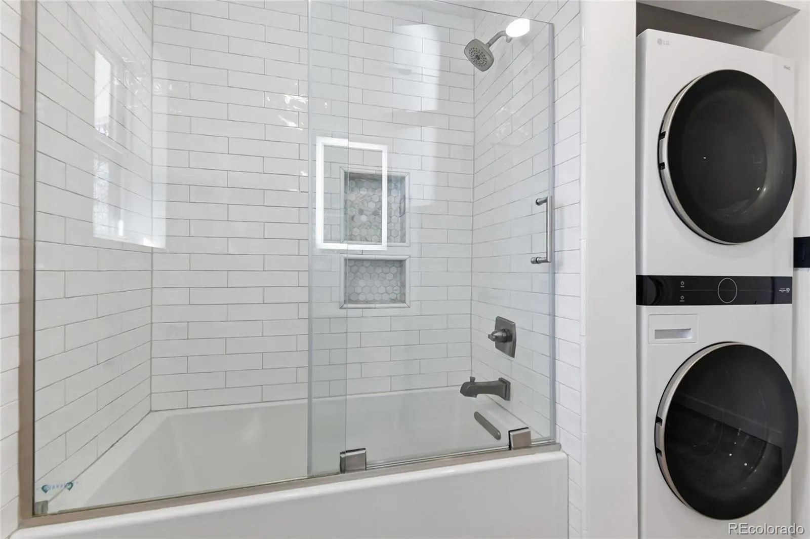 The secondary bedroom is complemented by a beautifully finished full bathroom with a bathtub and glass doors. The primary suite features European style closets, a spacious walk in shower with custom glass, a double vanity, and a bidet toilet, creating a space that feels elevated, intentional, and complete.