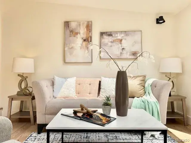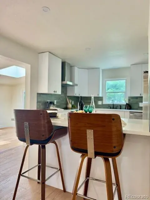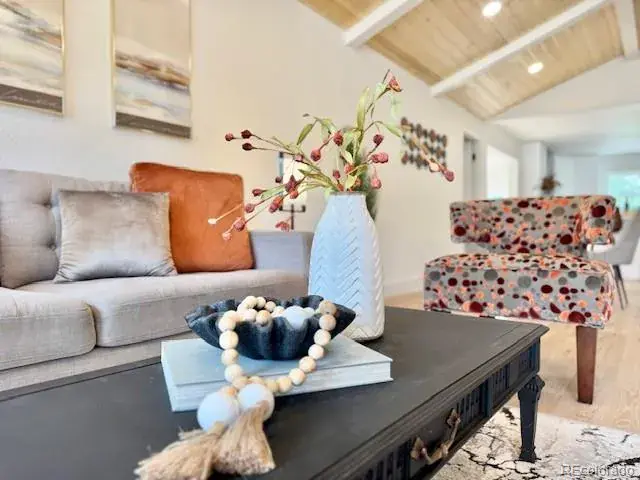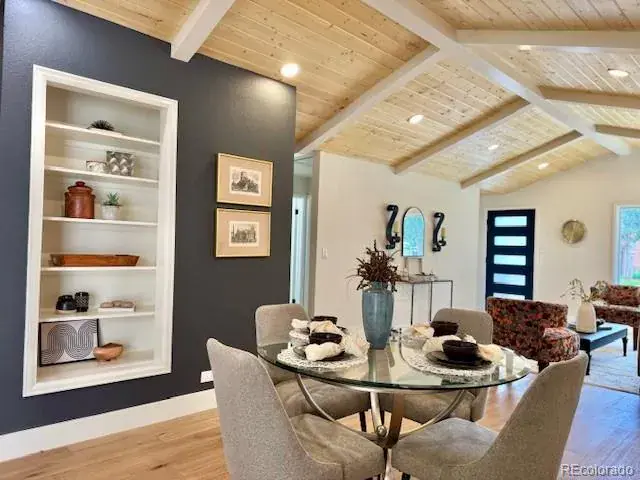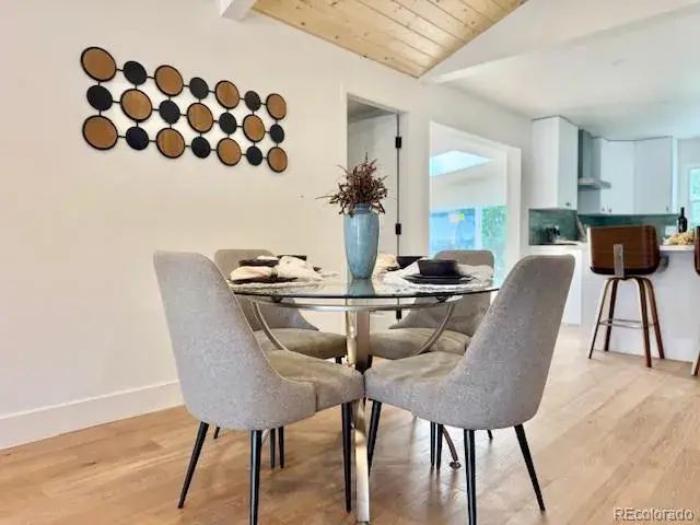 This 1953 mid-century modern inspired home boasts exactly what you are looking for, vaulted tongue and grove ceilings, wide plank hardwood floors, large picture glass windows or doors open to outside, functional floor plan combined with a great room concept that is light, bright, and lofty. Clean aesthetics flow throughout the entire house. Kitchen is spacious with plenty of cabinet and countertop, slab quartz, large peninsula for eat in options. Off the kitchen sits the airy bonus sunroom with massive skylights and multiple options. Could be used as a sitting room, a formal dining room area, a study/office or even a workout space. However you decide, you will absolutely love how the sunroom connects to the backyard patio with a large sliding glass door that allows indoor/outdoor living. The primary is nice sized with ensuite bathroom with large walk-in shower. Outside you’ll enjoy the xeriscape front yard and landscaping lights and you’ll love the backyard with trees and shade and privacy plus fantastic no maintenance green turf with zero additional watering costs or wastes. Space for a garden too. One of the nicest blocks in sought after Virginia Village and adjacent to the iconic Krisana neighborhood. In total, 3 beds / 2 bath with more square feet to offer than the traditional mid-mod in this area. All finishes are top notch and tastefully designed. Newer roof, furnace, and A/C. Central Denver location with easy access to Downtown, Cherry Creek, I-25 and I-70 if you want to escape to the mountains. Numerous parks, trails in the community and all the shopping and dining options you could ever want. This home bursts with charm!
