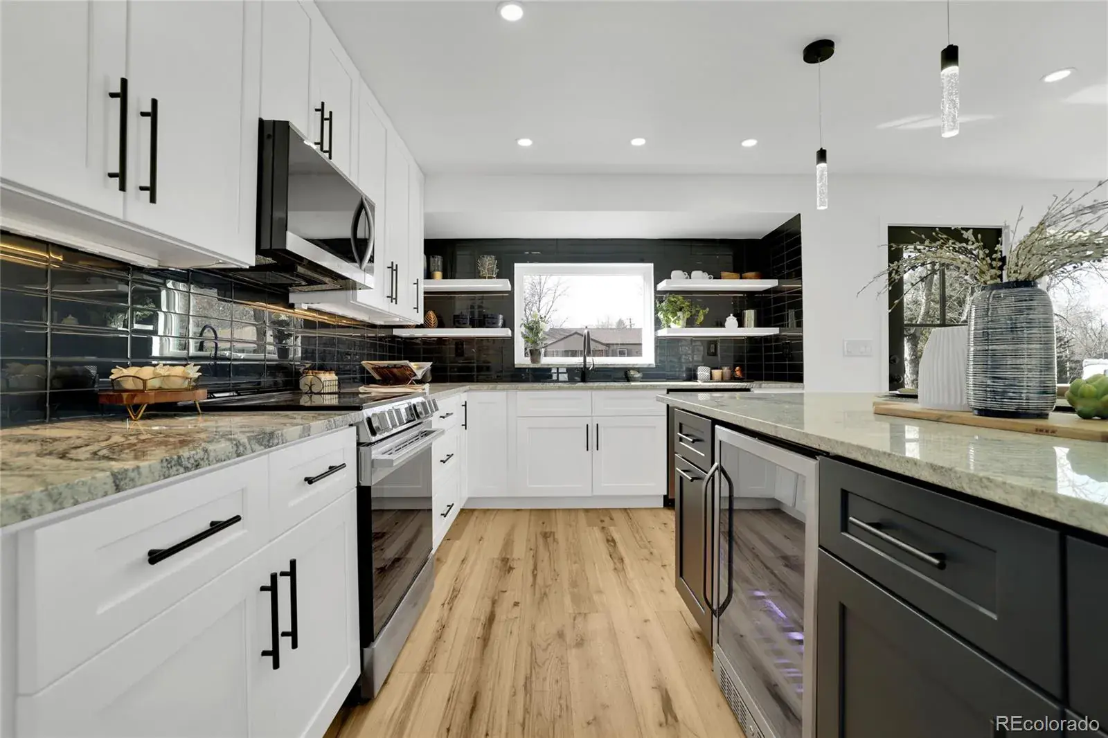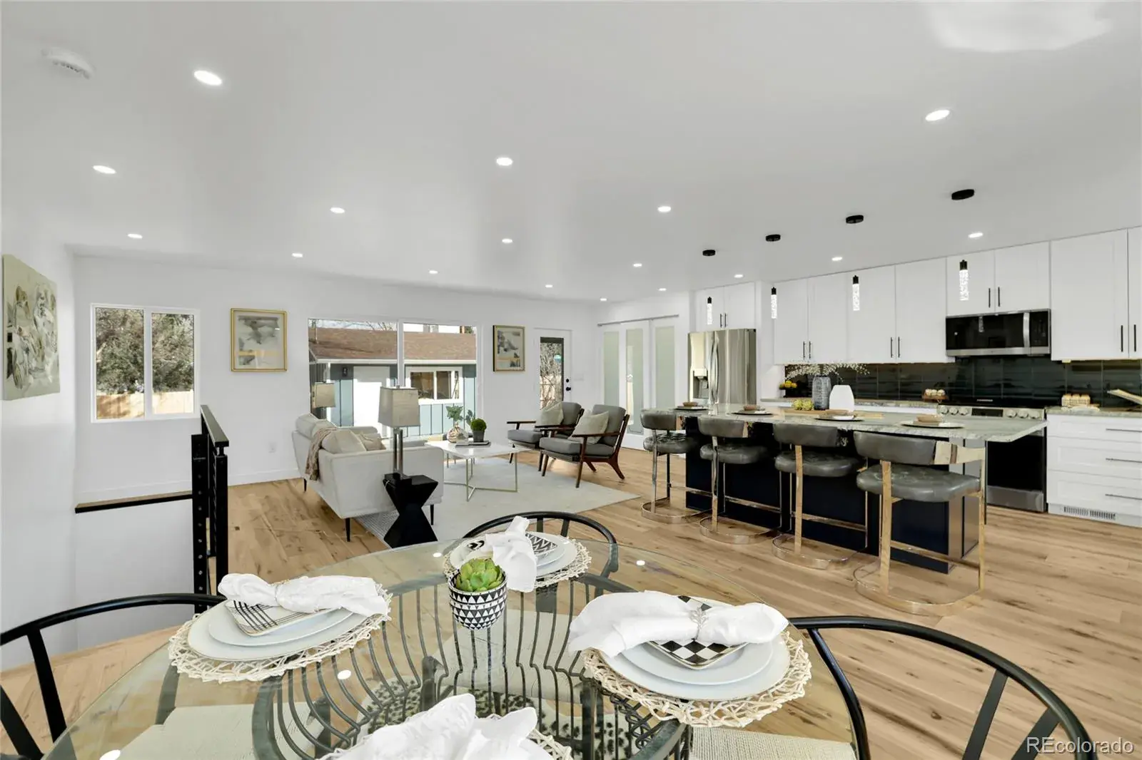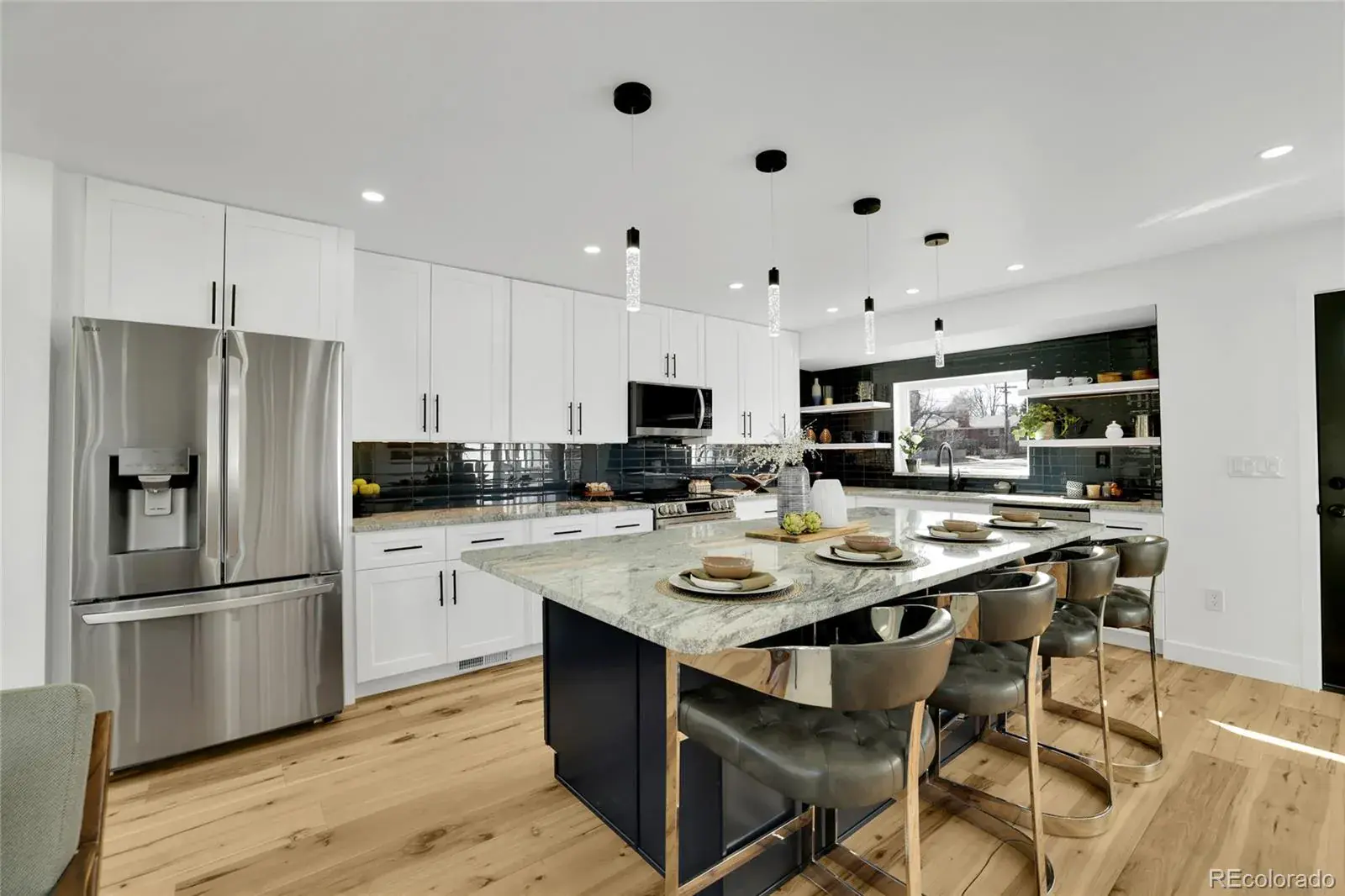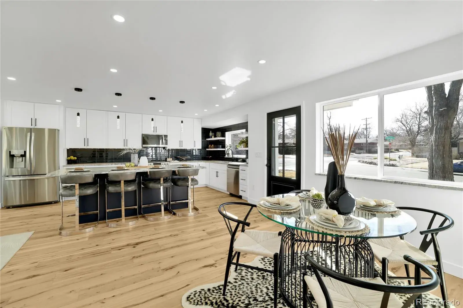 The kitchen truly defines the home, featuring crisp white cabinetry, stainless steel appliances, granite countertops, a bold tile backsplash, and a large island with seating; perfect for hosting friends or casual weeknight dinners. It flows seamlessly into the dining area and living room, where oversized windows and sliding glass doors fill the space with natural light and connect you to the backyard.