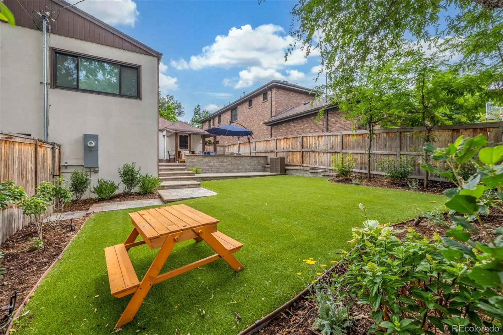Outside, a covered patio and lush backyard create the perfect Denver outdoor living space for entertaining or unwinding with low maintenance.