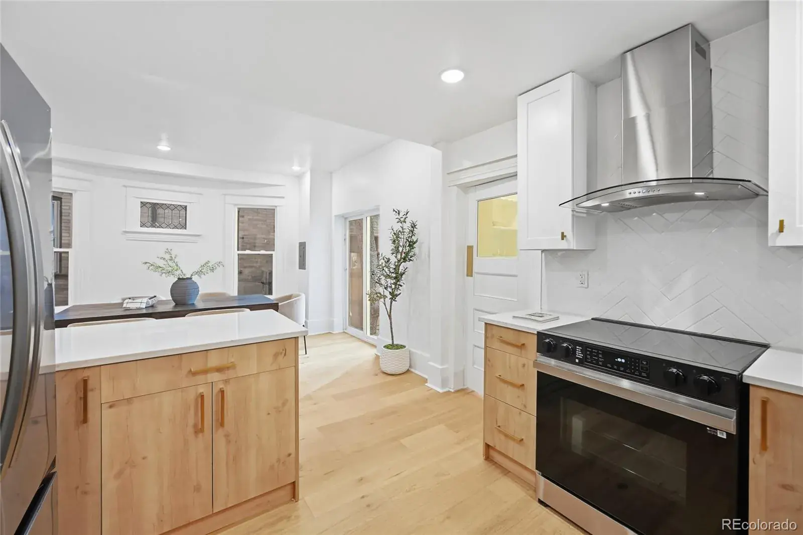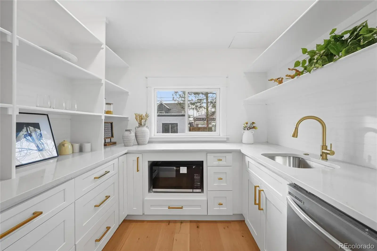 The fully renovated kitchen features quartz countertops, stainless appliances, custom two-tone cabinetry, brass hardware, and a generous island layout designed for both daily living and entertaining. A separate coffee bar/butler’s pantry adds additional storage, prep space, and a luxury touch rarely found in homes of this era.