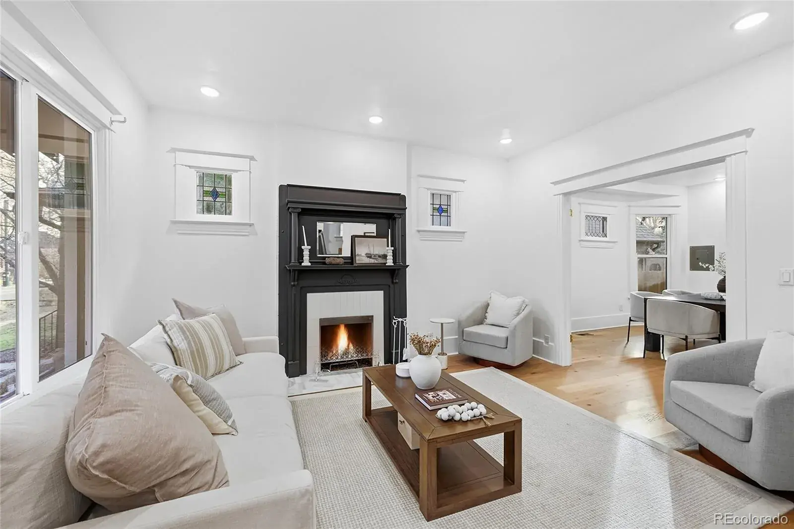 Inside, classic architectural details including stained glass windows, original trim work, and a striking fireplace showcase the home’s history, while wide-plank hardwood flooring, fresh finishes, and abundant natural light create a bright, move-in-ready feel.