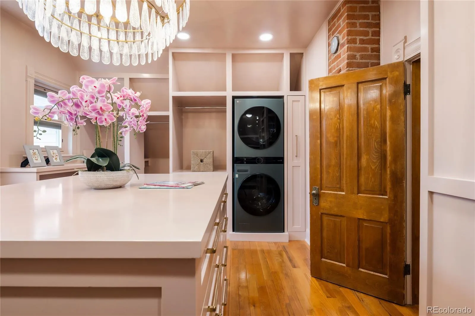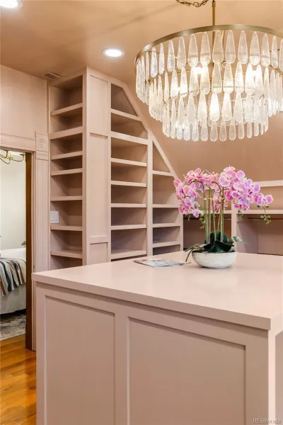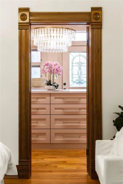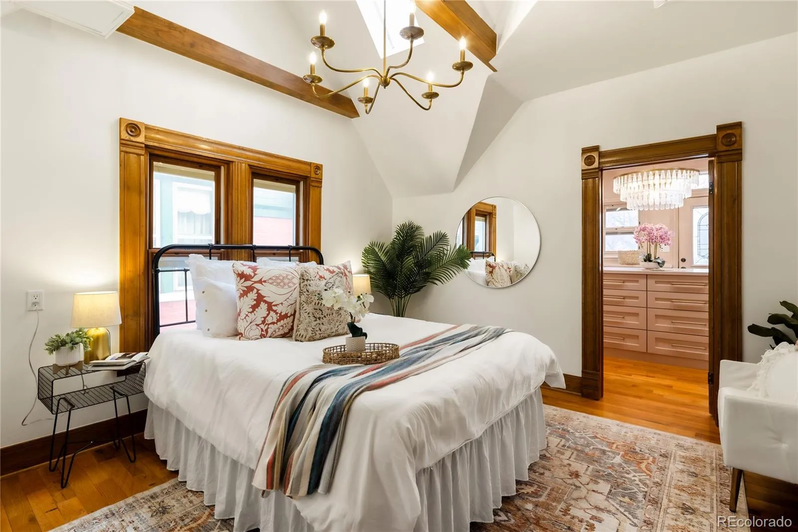 The renovated interior celebrates historic character while embracing modern comfort. Upstairs, bedrooms feature vaulted ceilings and hardwood floors, accompanied by a full bathroom with a classic clawfoot tub, walk-in shower, and heated floors. The primary closet, complete with a washer and dryer, was intentionally designed to provide abundant storage and a curated display for every season and occasion’s attire.