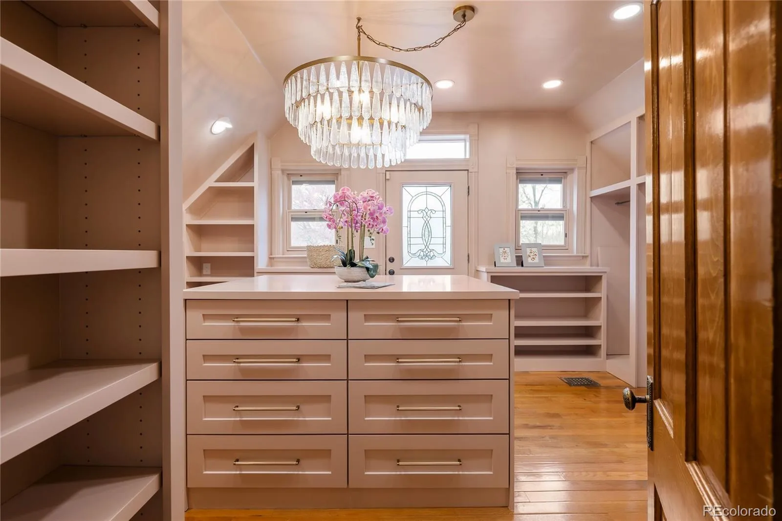 On the main floor, an open layout flows effortlessly from living room to kitchen, perfect for both daily living and entertaining. The heart of the home, the kitchen, features custom cabinetry, stainless steel appliances, quartz countertops, and a farmhouse sink, more than just a place to prepare meals, it’s a natural gathering space. A recently added pantry can keep the chaos concealed and newly enclosed sunroom offers a versatile retreat space for a breakfast nook, second office or art and study area. Beyond the kitchen, french doors reveal a dedicated office with built-in bookshelves; a perfectly private space for productivity.