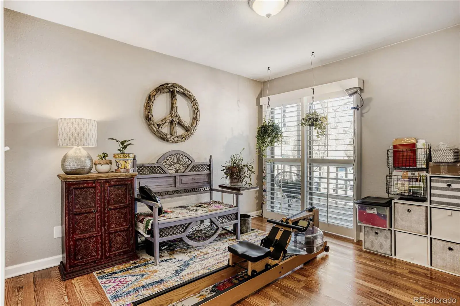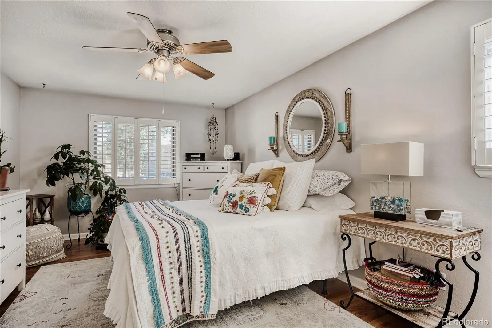 Exceptional two-bedroom, two-bathroom condo beautifully updated throughout in Woodside Village II. Rare find that includes a detached garage along with a reserved parking spot right out front, main level living with no stairs. Stunning wood shutter window coverings, cozy wood burning fireplace, wood laminate and tile flooring. Relax on your private patio that can be accessed by two sliding glass doors, one off the living area and one off the second bedroom/office. All appliances included, along with the washer and dryer. Enjoy nearby parks, trails, dog park, shopping and restaurants near Lowry, Cherry Creek and Anschutz Medical Campus. Pride in ownership.