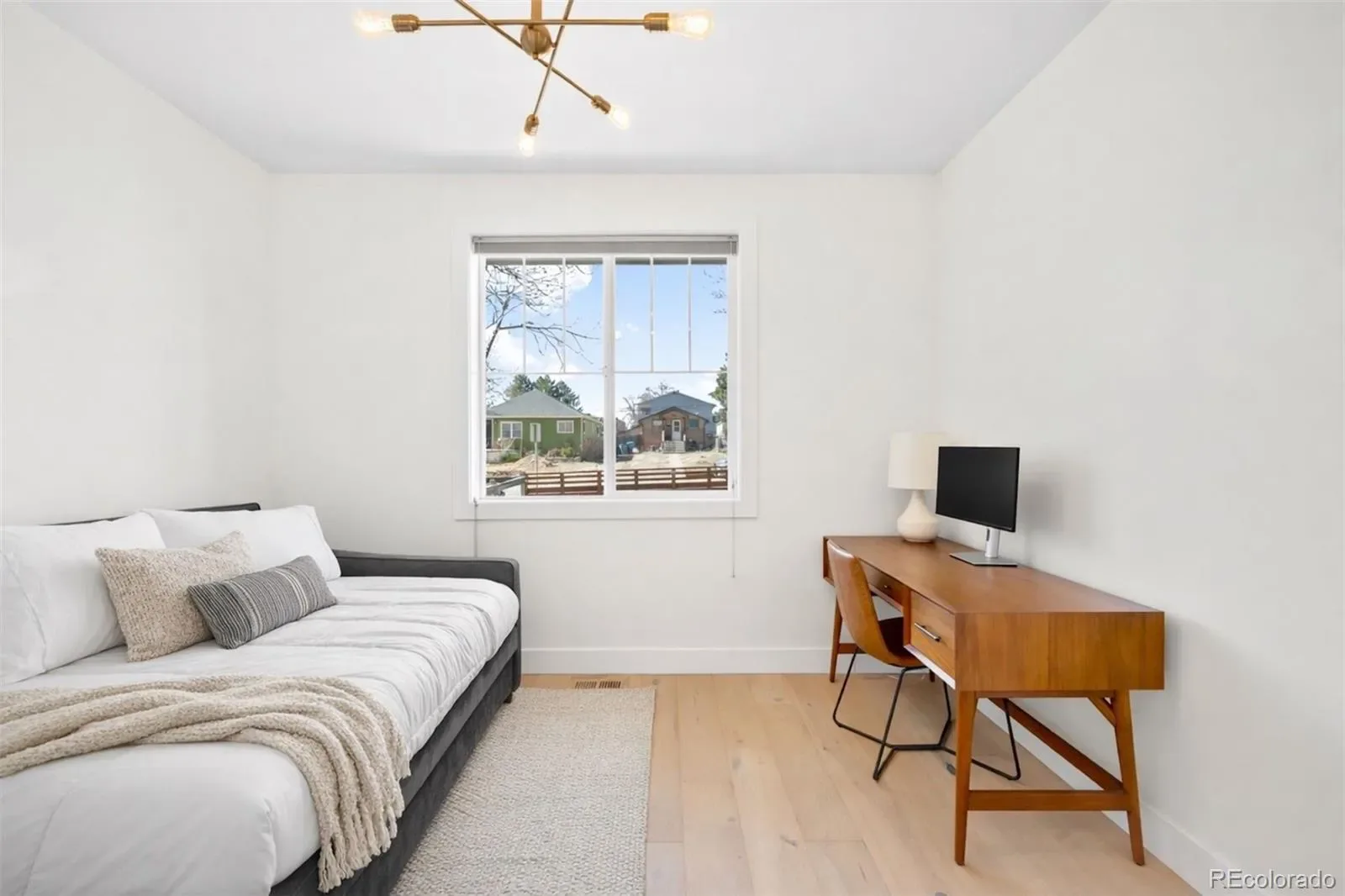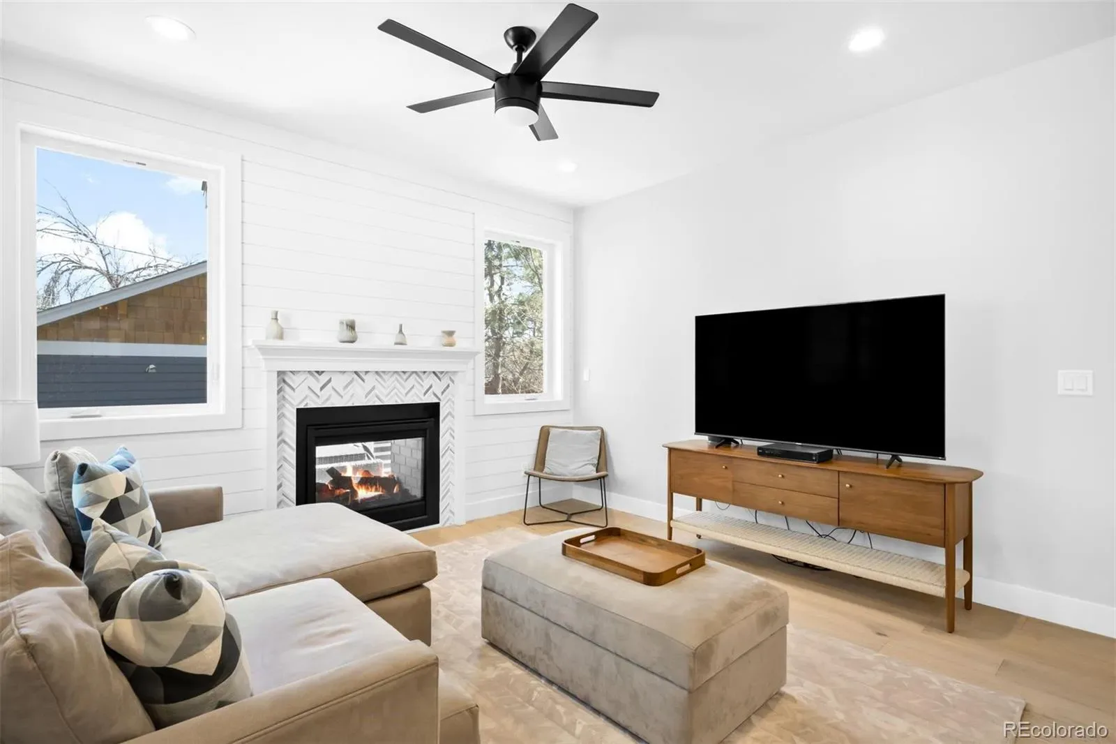 Perfectly positioned just blocks from the restaurants, coffee shops, and boutiques of South Broadway, this modern Englewood home offers a rare combination of walkable city living and spacious newer construction. Inside, a light-filled open floor plan seamlessly connects the kitchen, dining area, and living room, creating an inviting space ideal for both everyday living and effortless entertaining. The kitchen features quartz countertops, stainless steel appliances, white cabinetry, and a large center island, opening to a spacious living room anchored by a striking indoor-outdoor gas fireplace and large windows that fill the home with natural light. A main-floor bedroom and bathroom provide flexibility for a home office, a guest suite, or multigenerational living. Upstairs, the primary suite serves as a private retreat with generous closet space and a luxurious five-piece bathroom featuring dual vanities, quartz countertops, a soaking tub, and a glass-enclosed shower. Two additional bedrooms, a full bathroom, and a convenient upper-level laundry room complete the second floor. The finished basement adds valuable additional living space, perfect for a media room, home gym, playroom, or second living area, along with a private bedroom and bathroom ideal for guests. Outdoor spaces are designed for easy Colorado living with a welcoming covered front porch, a back deck for entertaining, and a low-maintenance turfed backyard leading to the detached two-car garage. Located in a highly convenient Englewood neighborhood with quick access to Craig Hospital & the Swedish Medical Center, South Broadway restaurants, Cherry Creek shopping, the Denver Tech Center, light rail, and major commuter routes, this home offers the perfect blend of modern design, flexible living space, and unbeatable location.