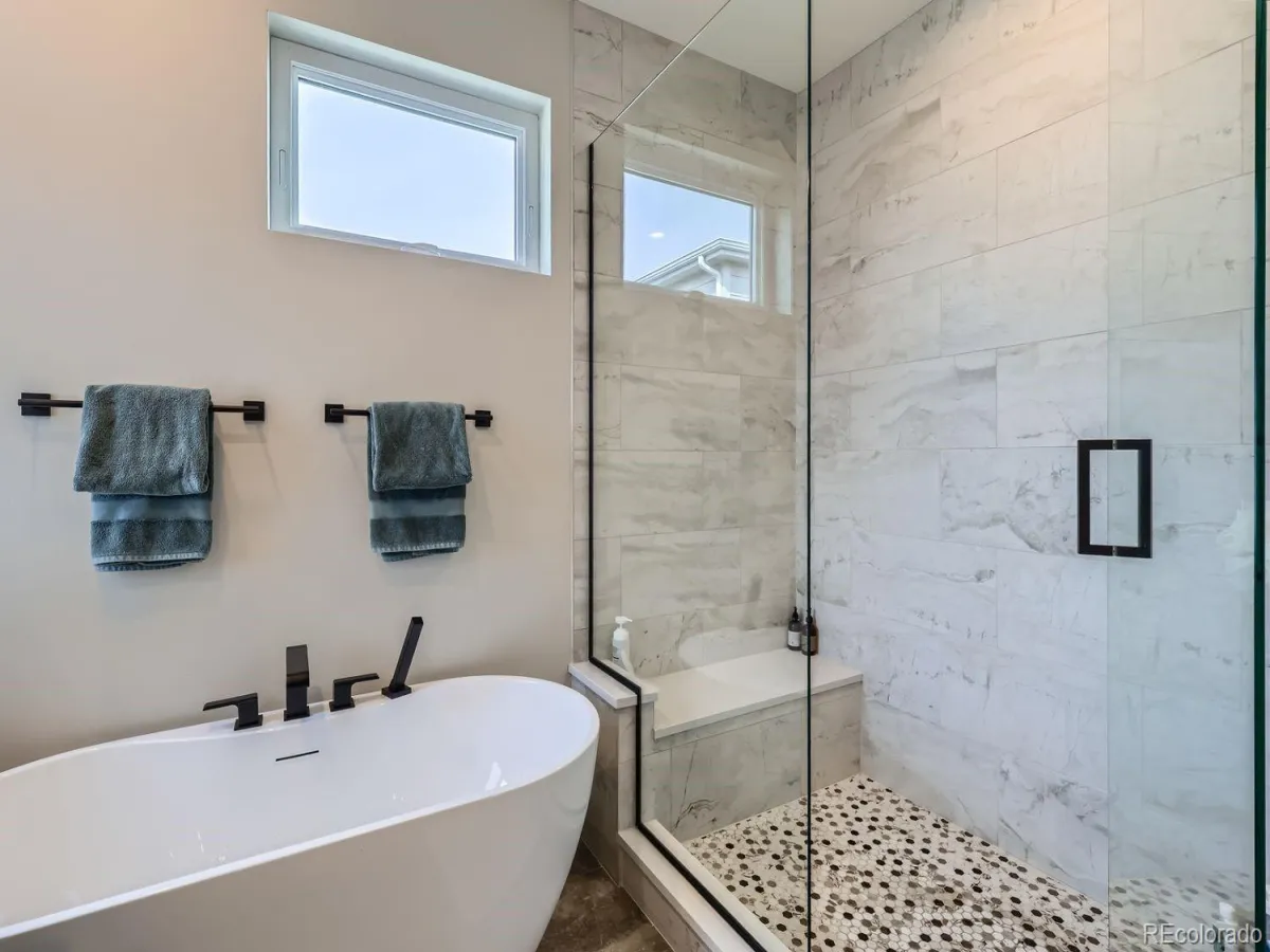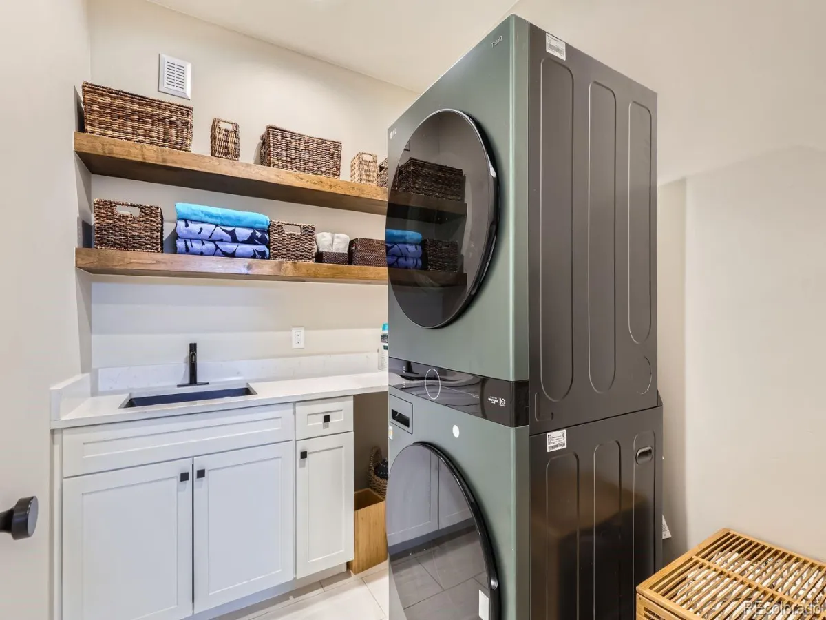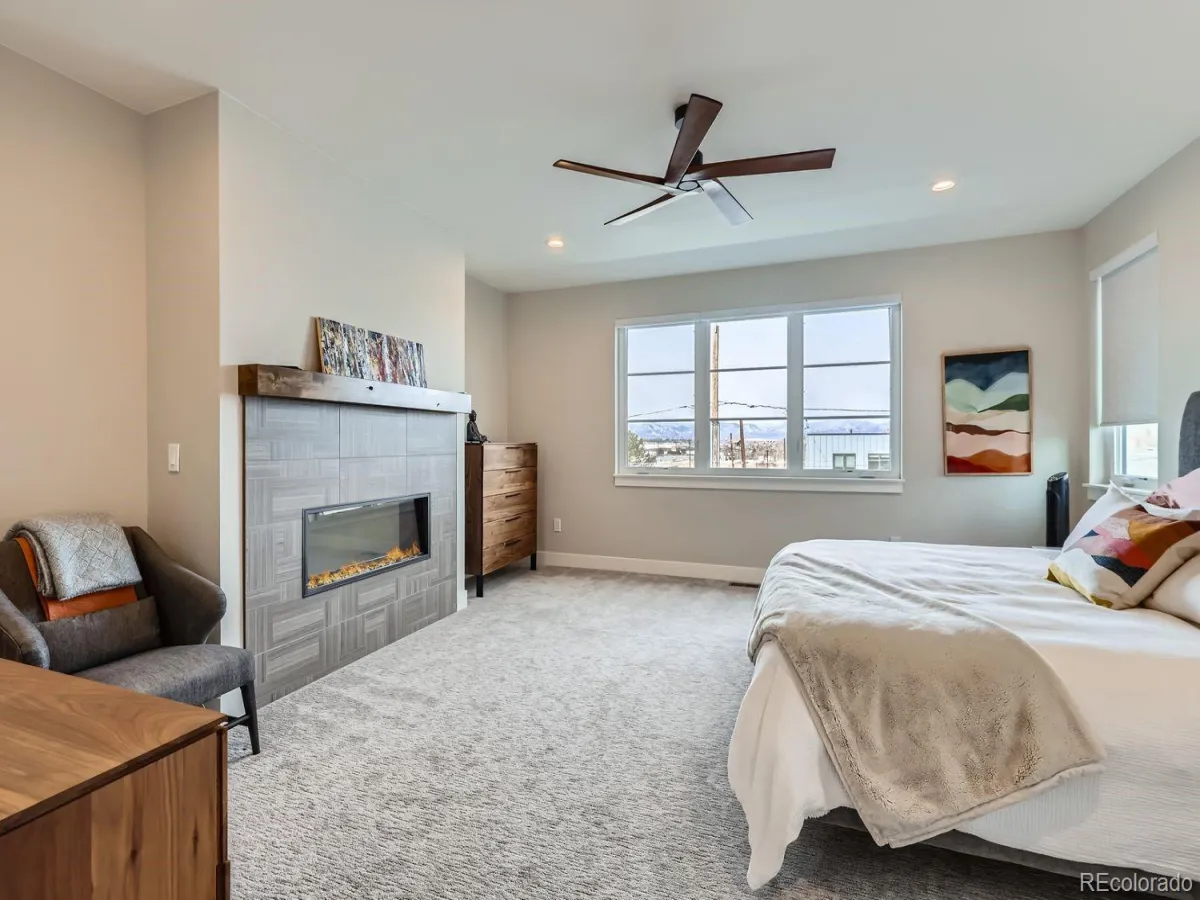 Upstairs, the primary suite offers a cozy gas fireplace, spacious walk-in closet, and a luxurious five-piece bath with a soaking tub. Two additional bedrooms, a full bath, and a full-size laundry room complete the upper level. The rooftop patio provides unobstructed Rocky Mountain views, perfect for relaxing or entertaining.