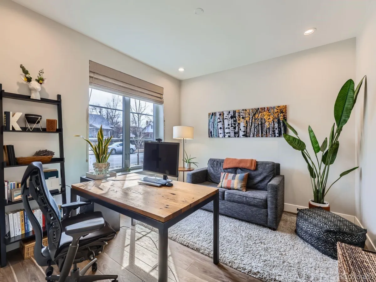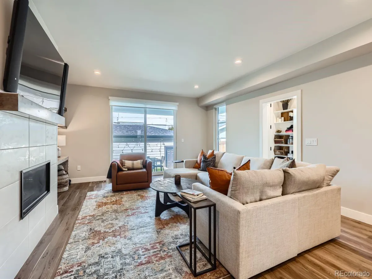 Welcome to this exceptional 2022-built paired home in Englewood, offering over 3,400 finished square feet of thoughtfully designed living space with stunning Front Range mountain views and high-end finishes throughout. The open-concept main level seamlessly connects the kitchen, dining, and great room, creating a bright and inviting atmosphere ideal for both everyday living and entertaining. The kitchen features a large quartz island, custom cabinetry, a walk-in pantry, and premium appliances including a gas range and hood.