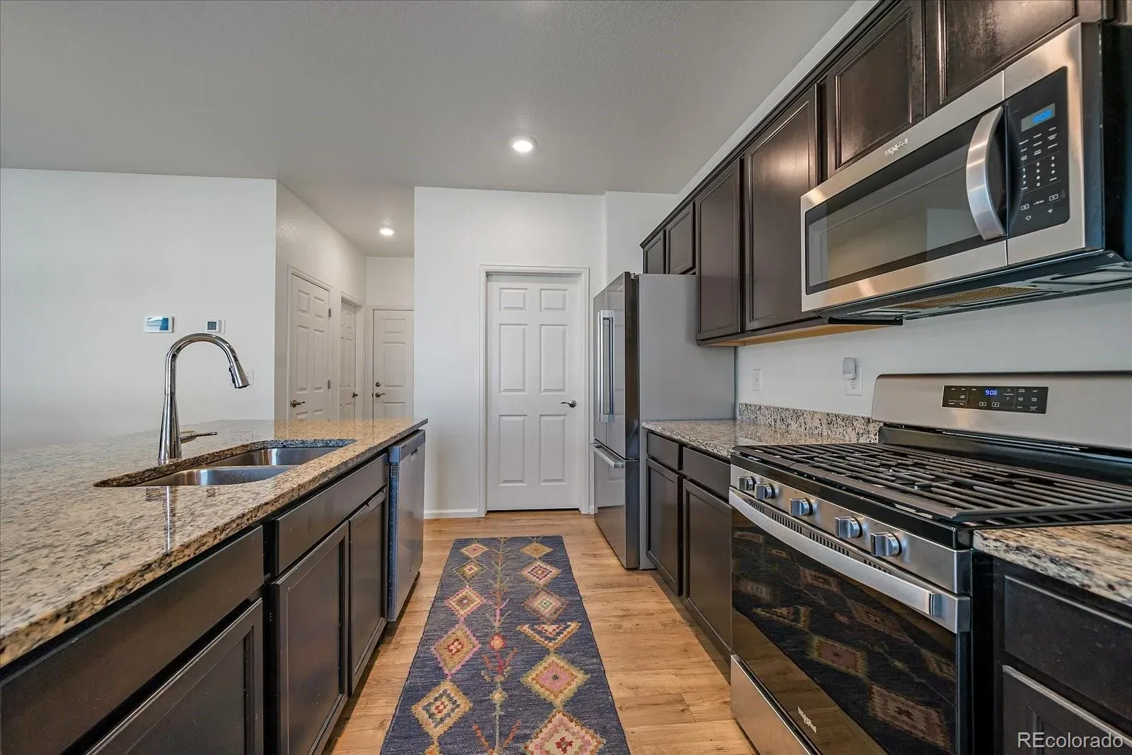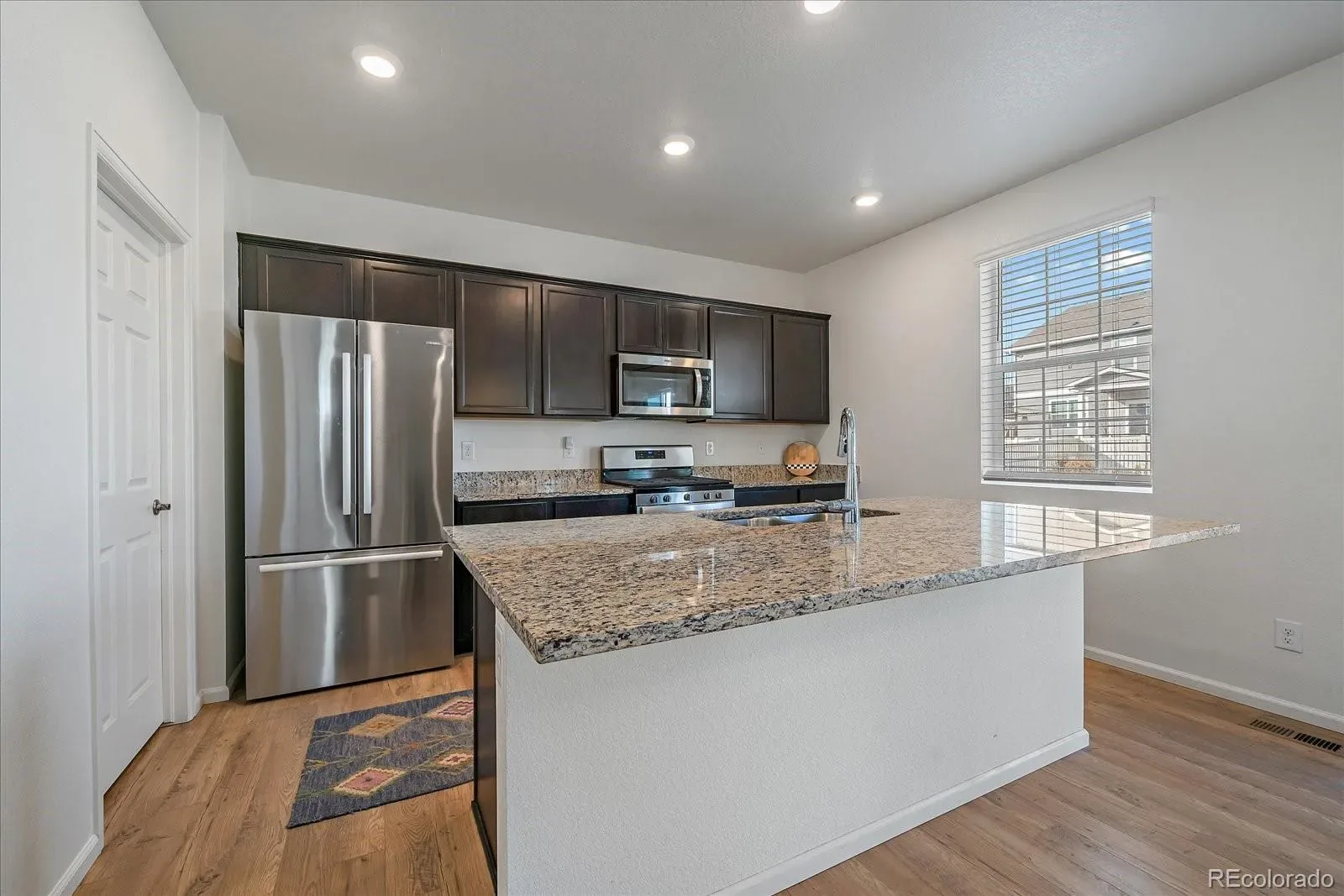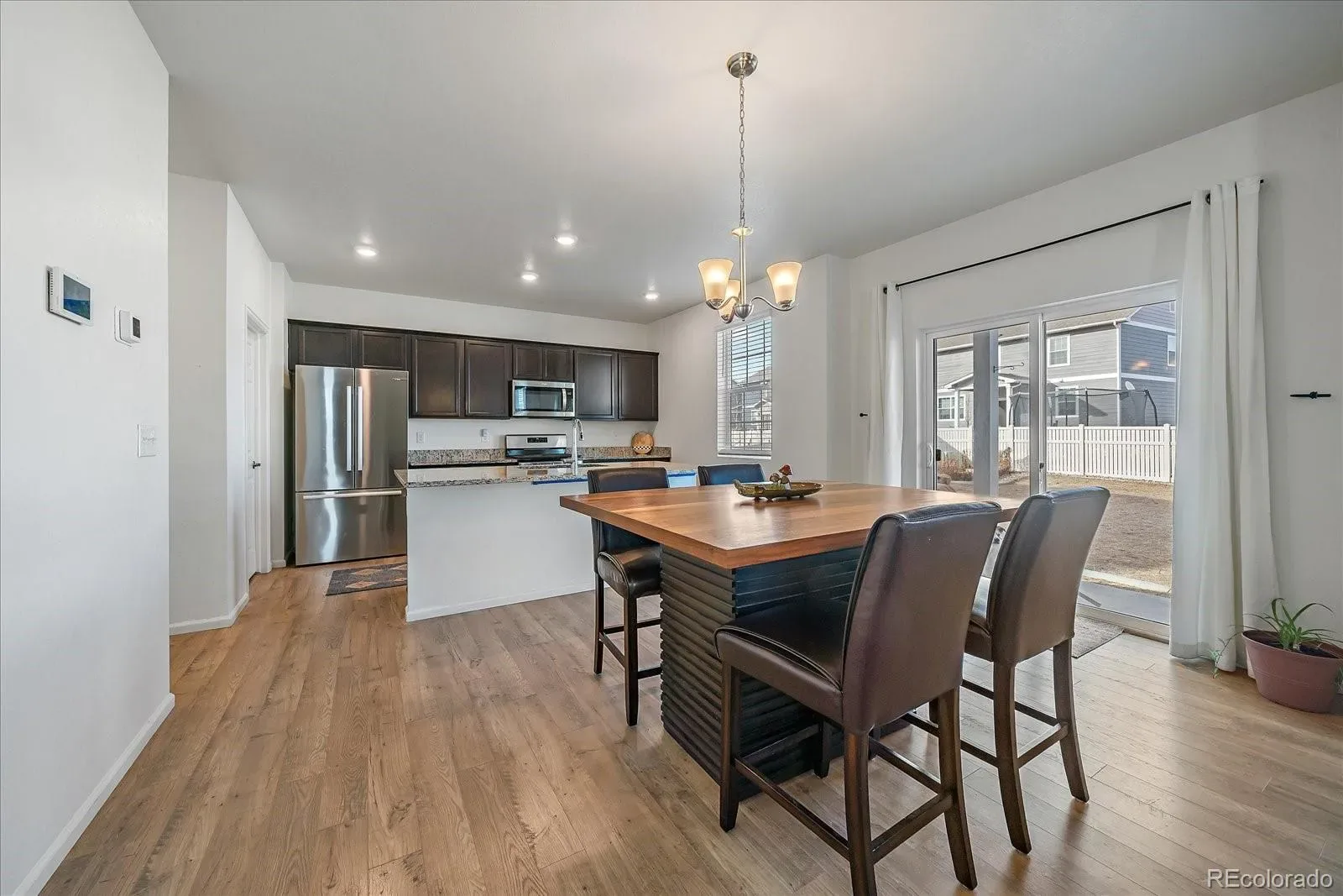 Thoughtfully designed and beautifully maintained, this near new single family home offers a seamless blend of modern functionality and timeless style in Neighbors Point. With open living spaces that are inviting and designed for connection, this home redefines everyday living. The main level is anchored by wide-plank flooring that flows effortlessly from the entry through the kitchen and great room, creating warmth and continuity. The kitchen features rich espresso cabinetry, granite countertops with natural movement, stainless steel appliances, a spacious center island with seating, and a walk-in pantry—perfectly positioned to overlook the living and dining areas for effortless entertaining. Natural light fills the great room, while sliding glass doors extend the living space to a covered patio and expansive fenced backyard. A thoughtfully designed paver patio creates an additional gathering area, ideal for enjoying Colorado evenings. The primary suite offers generous proportions including a large sitting room, a walk-in closet, and a bright ensuite bath with dual vanities. Two additional bedrooms, a full bath, and convenient upper-level laundry complete the second floor. The full unfinished basement presents endless potential for future expansion, storage, or customization. Additional features include central air, tankless water heater, solar panels and a three-car attached garage. Located near parks, trails, Centennial Elementary, shopping, and everyday amenities, this home delivers comfort, style, and room to grow in the desirable community of Neighbors Point.