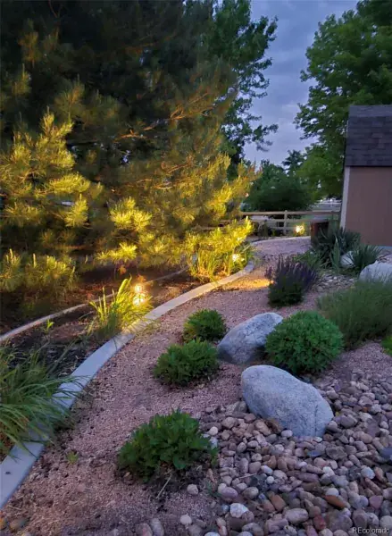 in backyard with mature trees, professional landscaping, and mixed material