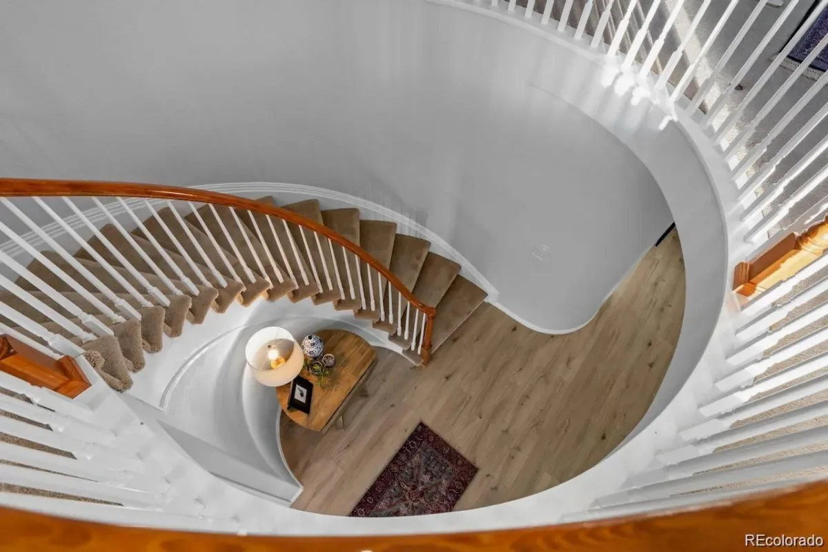 The striking architectural design features a stucco exterior & a dramatic round turret entry, complemented by elegant curved interior walls that create a distinctive, sophisticated feel throughout. A serene backyard oasis awaits, complete with babbling brook, pond, and fireside patio w/gas fire pit—surrounded by lush, mature landscaping including Colorado Blue Spruce, Rose of Sharon, Butterfly Bush….