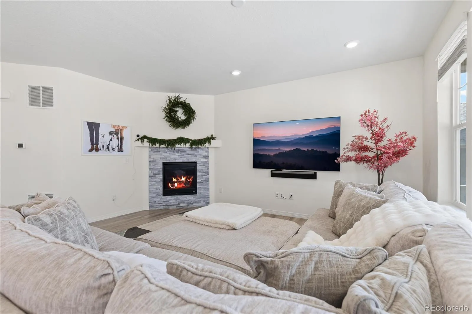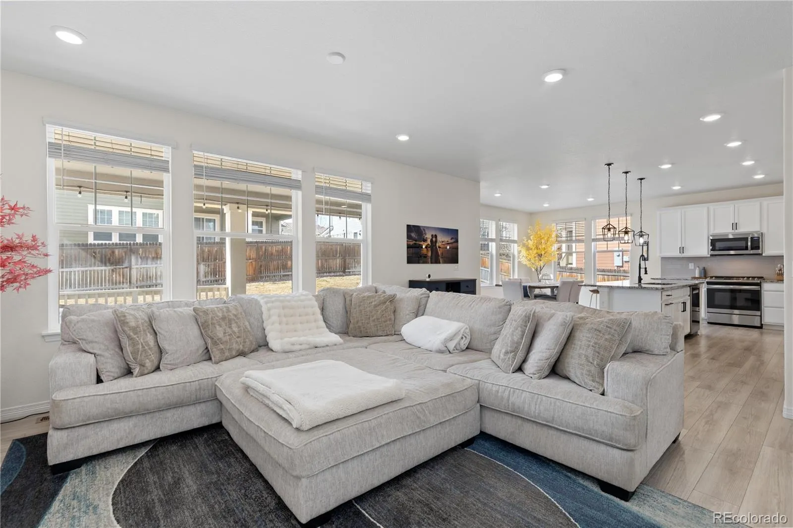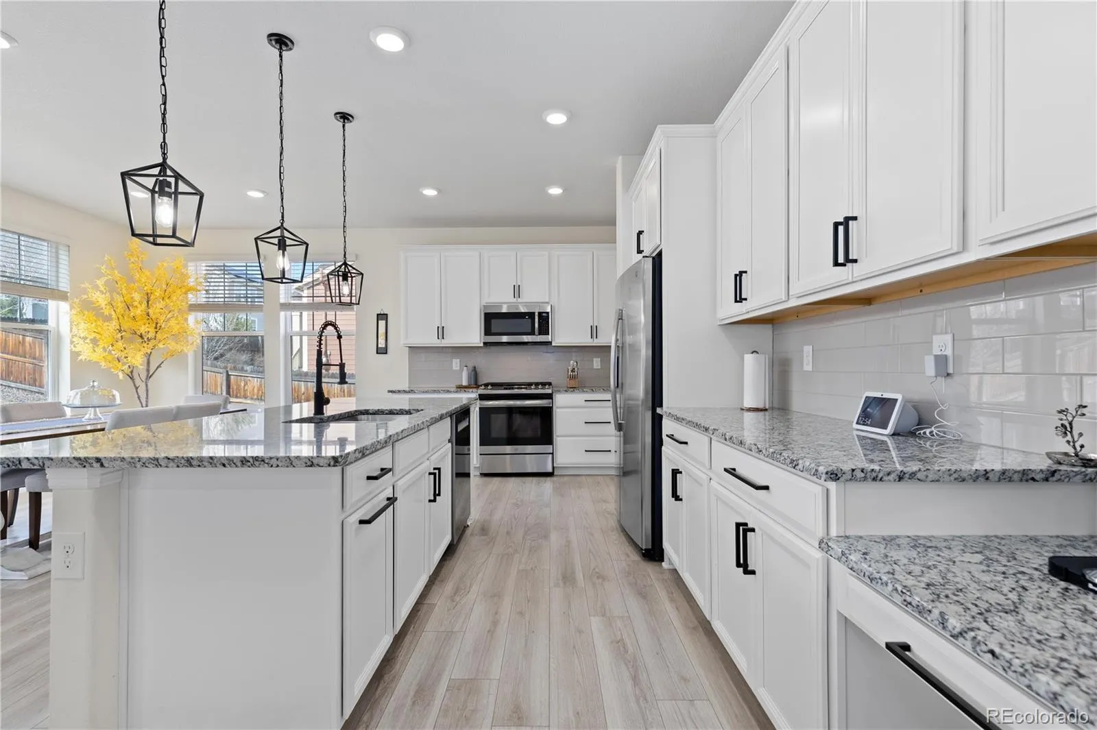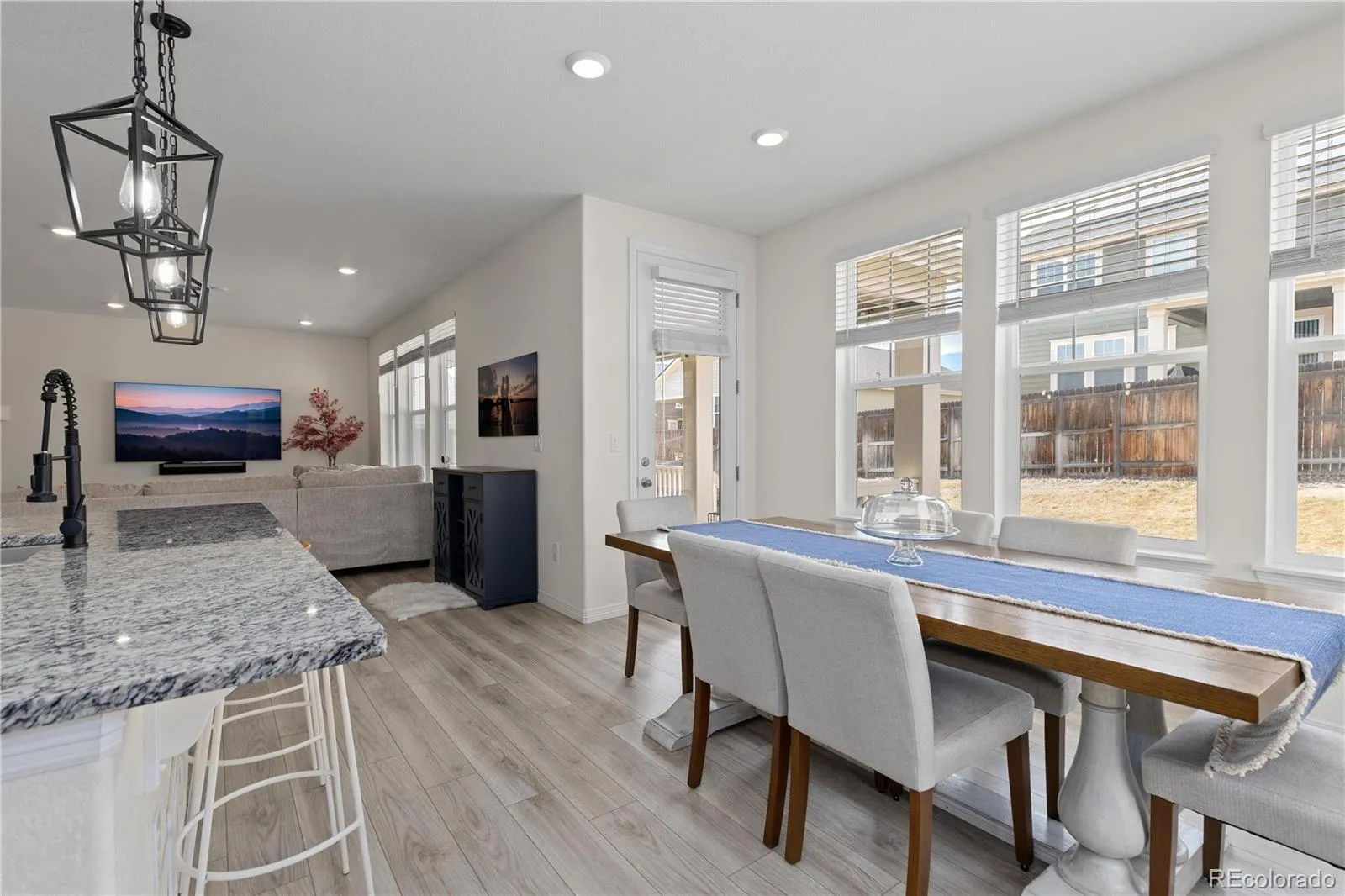 The sun-filled main level features a welcoming living room anchored by a gas fireplace with a striking herringbone stone surround. The chef-inspired kitchen is designed for gathering, complete with a large center island, granite countertops, stainless steel appliances, gas range, tile backsplash, and a spacious walk-in pantry. Just off the kitchen, the dining area opens to an oversized covered patio, perfect for effortless indoor-outdoor entertaining with Jellyfish exterior lighting. A private study with French doors and a convenient powder bath round out the main floor.